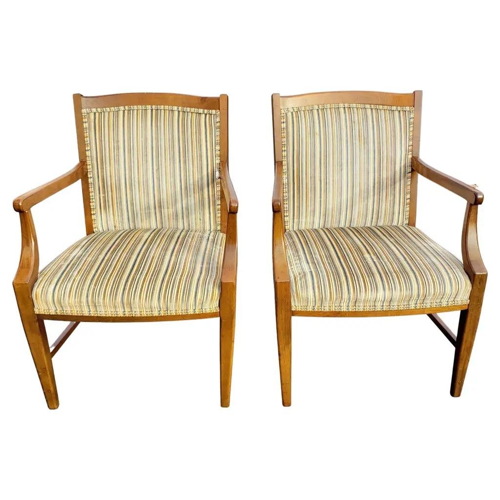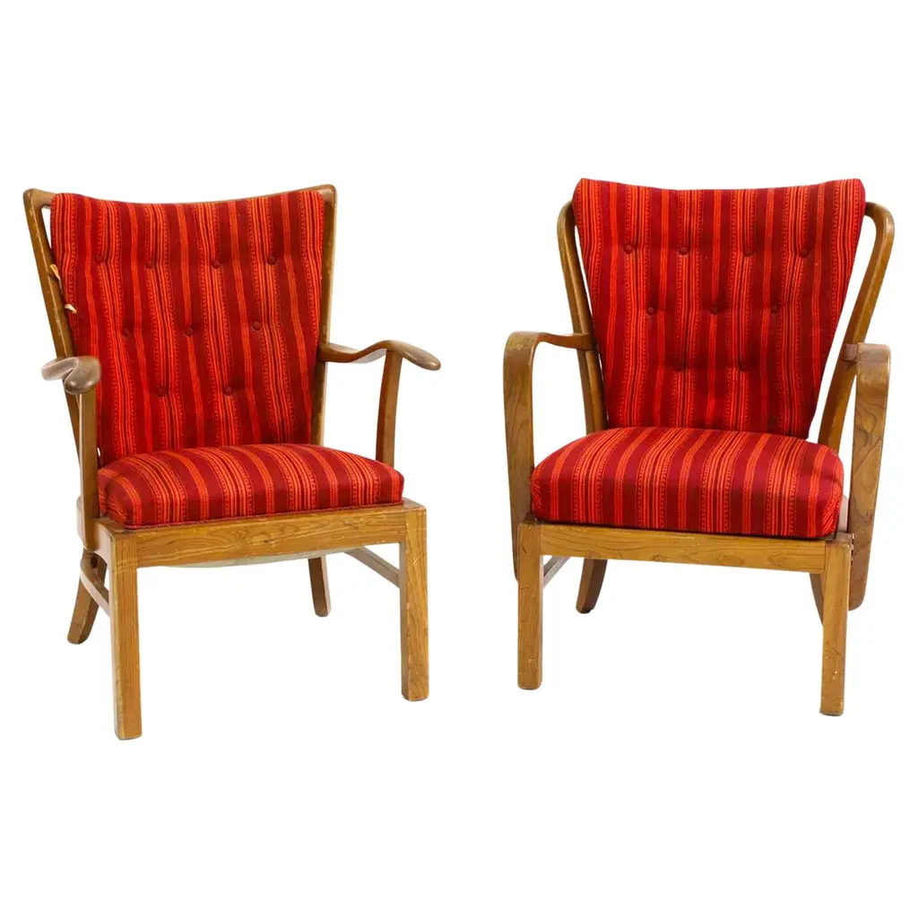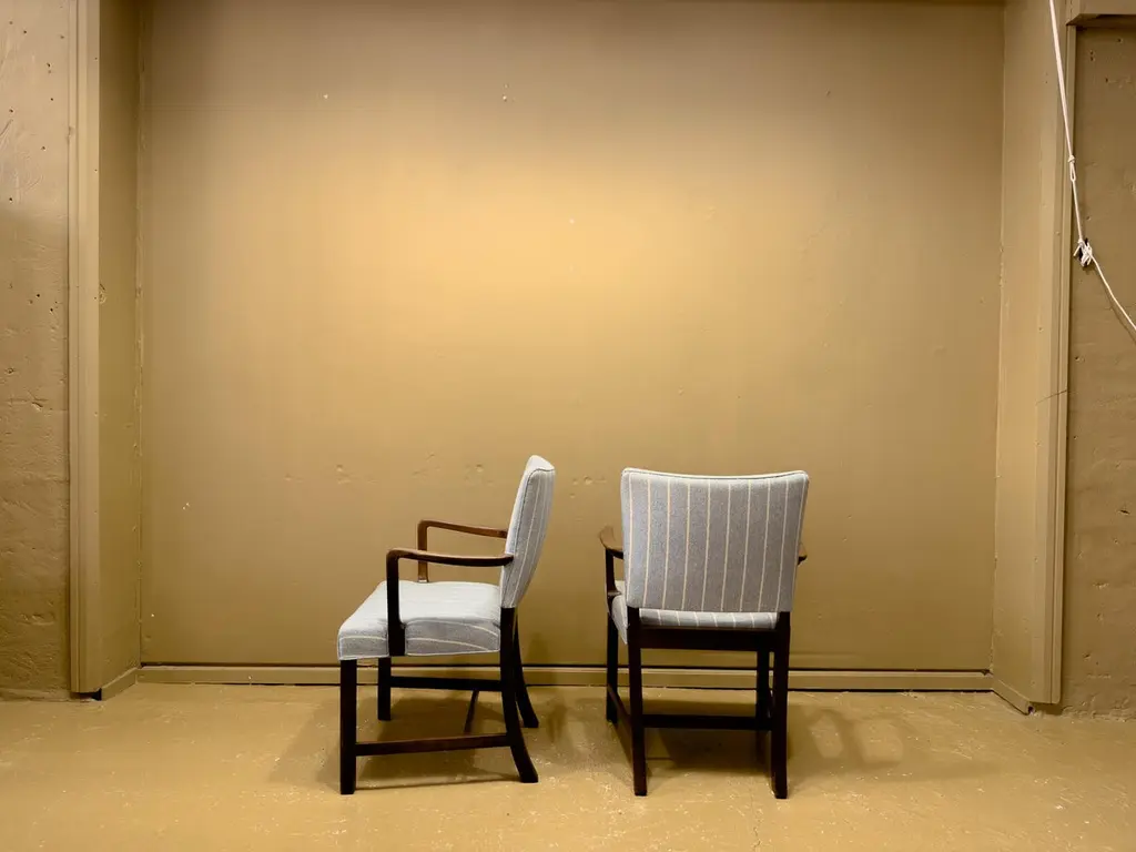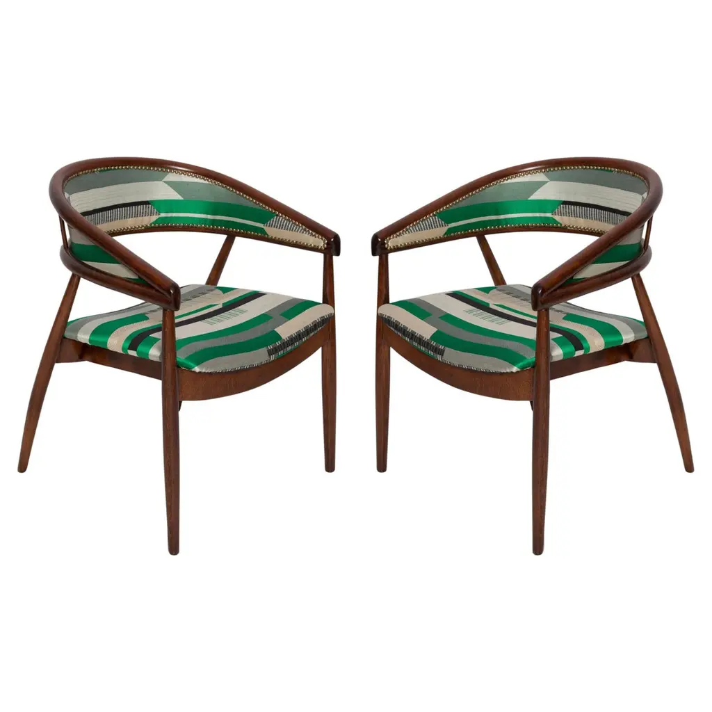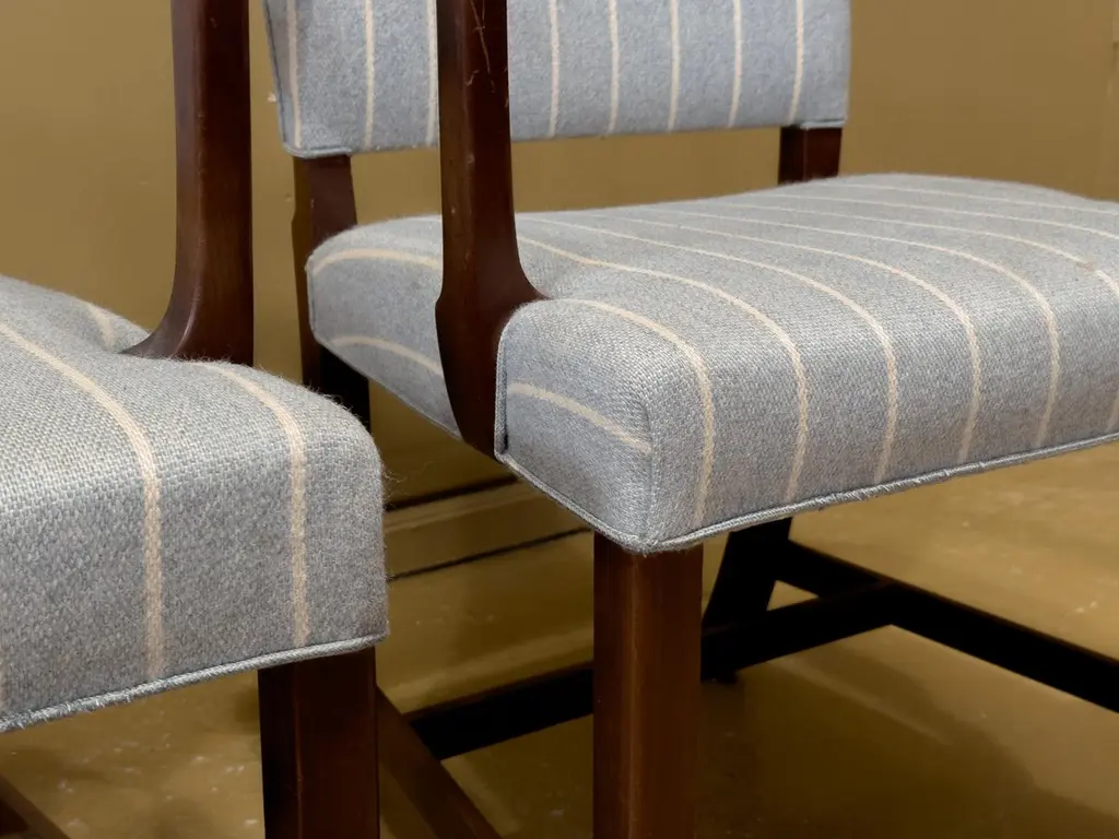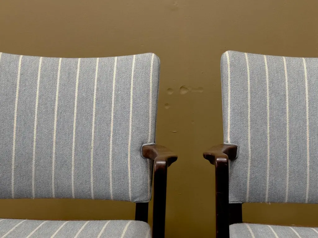 This exquisite pair of armchairs, designed by Danish master Ole Wanscher and crafted by the esteemed cabinetmaker A.J. Iversen in the 1960s, embodies the timeless elegance of mid-century design. Known for his dedication to refined proportions and understated luxury, Wanscher’s designs are celebrated worldwide for their balance of form and function.The solid mahogany wood frames showcase the richness and depth of the material, with beautifully contoured armrests that provide both visual interest and comfort. The chairs are upholstered in a subtly striped light blue fabric, adding a sophisticated contrast to the dark wood.