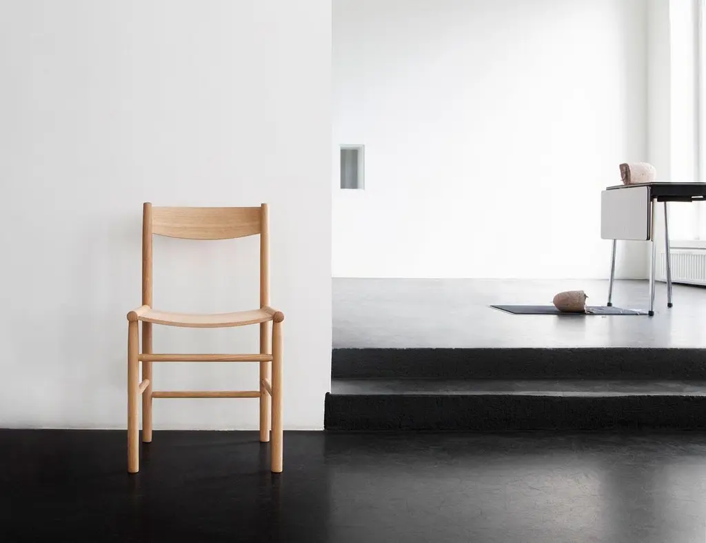 The light Akademia chair is designed by Wesley Walters and Salla Luhtasela in 2019. As the name suggests, the Akademia chair was the result of Wesley Walter’s Master’s Thesis work at Aalto University, Helsinki. The young designer, one half of the design duo Kaksikko, together with his partner Salla Luhtasela studied the Finnish chair manufacturing heritage, the Shaker style, and Japanese tradition and combined these various elements to make the Akademia chair.MaterialsOak or AshSurface finishLacquer, oakLacquer light, oakBlack stained, oakDimensionsWidth 460 mmDepth 470 mmHeight 810/460 mm