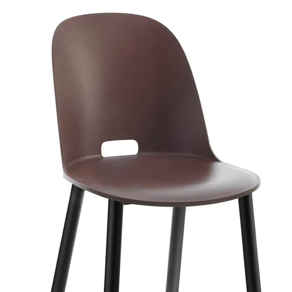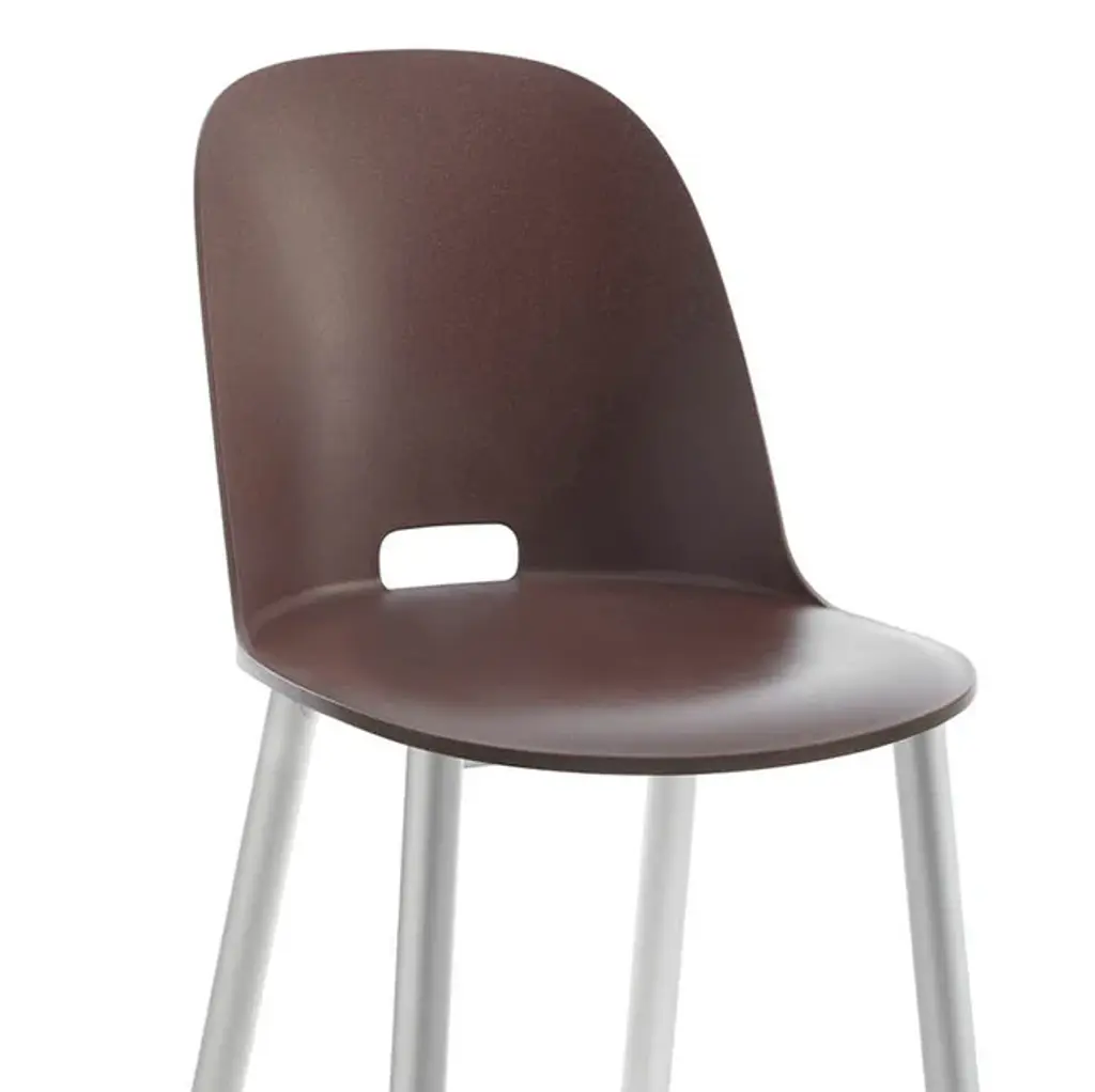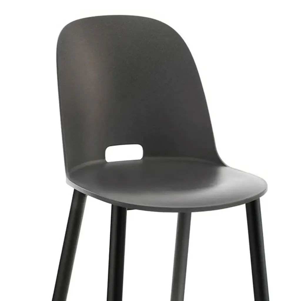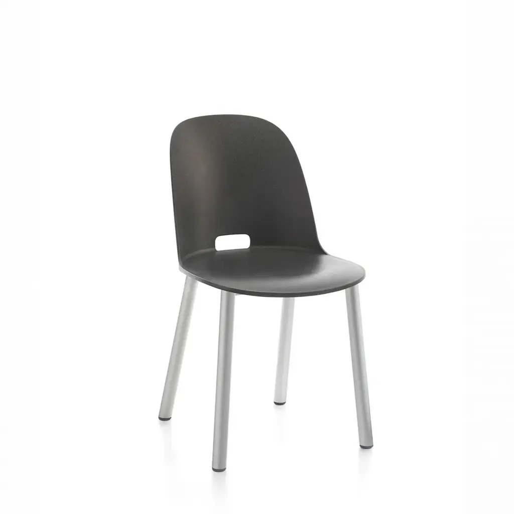 Alfi Aluminum by Jasper Morrison, 2018 Alfi Aluminum chairs come with seats in recycled plastic, offered with a high or low back, combined with a base in 80% recycled aluminum in a clear or dark finish. Suitable for outdoor use. The seats, with a high or low back, are made of recycled polypropylene mixed with wood fiber. The wood particles create a speckled texture that gives the surface a warmer, more natural touch. The aluminum frame meets the demands of high traffic areas and offers easy maintenance. Made in USA.