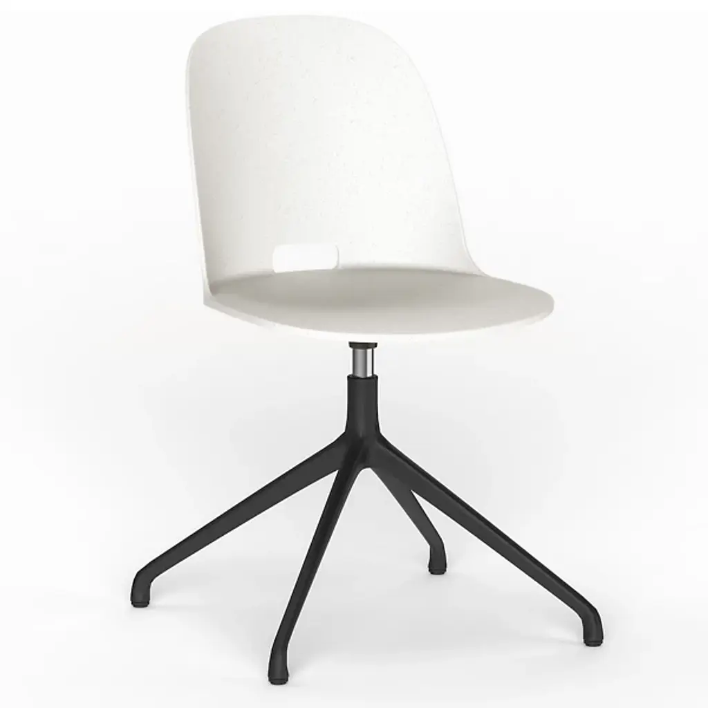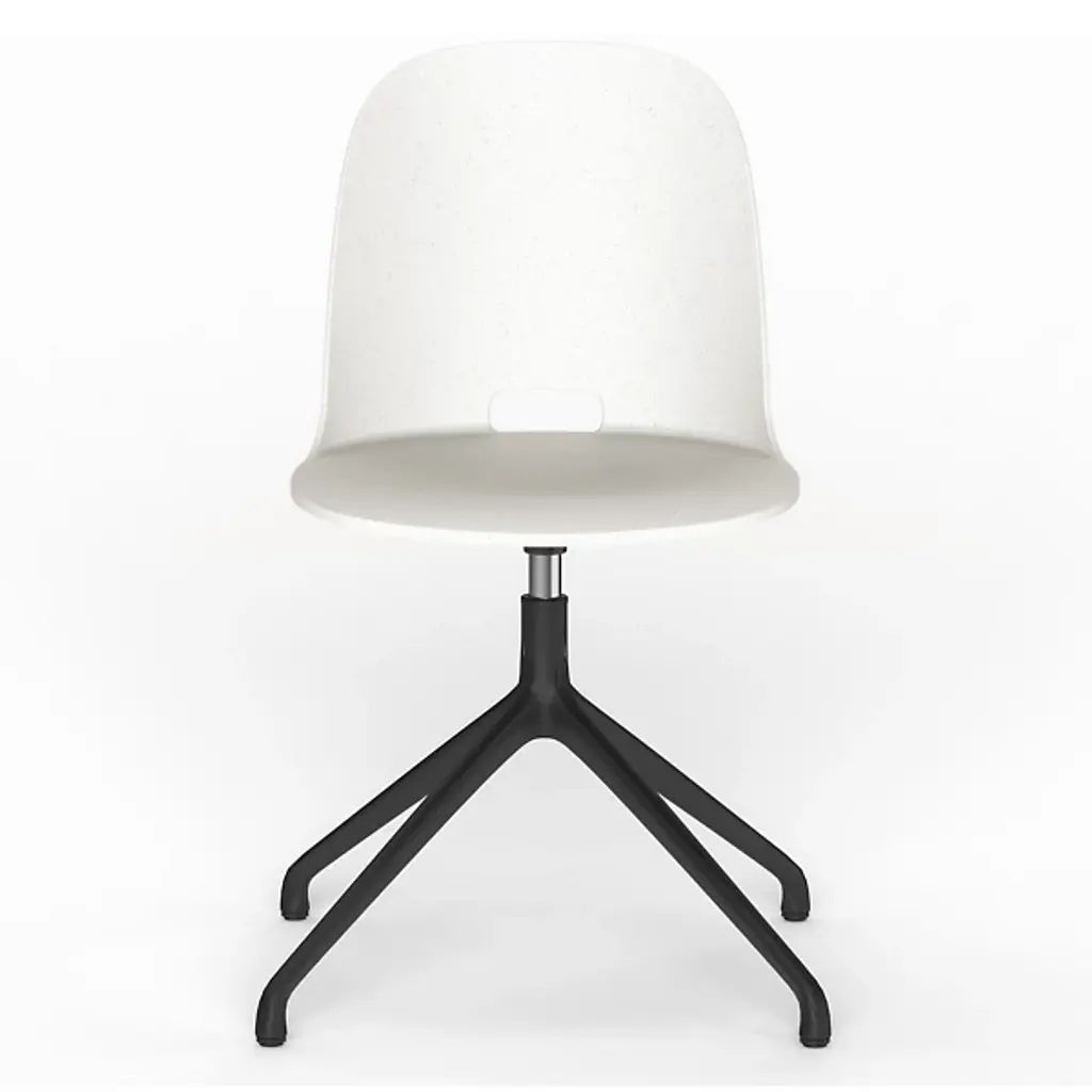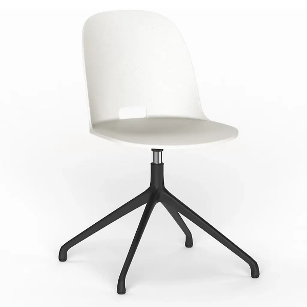 The Alfi Work Swivel Chair with Felt Glides from Emeco wraps one in clean, relaxing shapes modeled after the woven cane brasserie chairs found on the streets of Paris. Creator Jasper Morrison’s ‘super normal’ design aesthetic preaches the balance of shape and character with tension and expression. This swiveling chair creates intriguing tension with the stable, spider-like contours of its recycled aluminum base. Shape and character ring clear in the delightful curves of the brasserie-inspired seat shell. This form-hugging shell’s recycled plastic and wood fiber blend please in its soft texture.