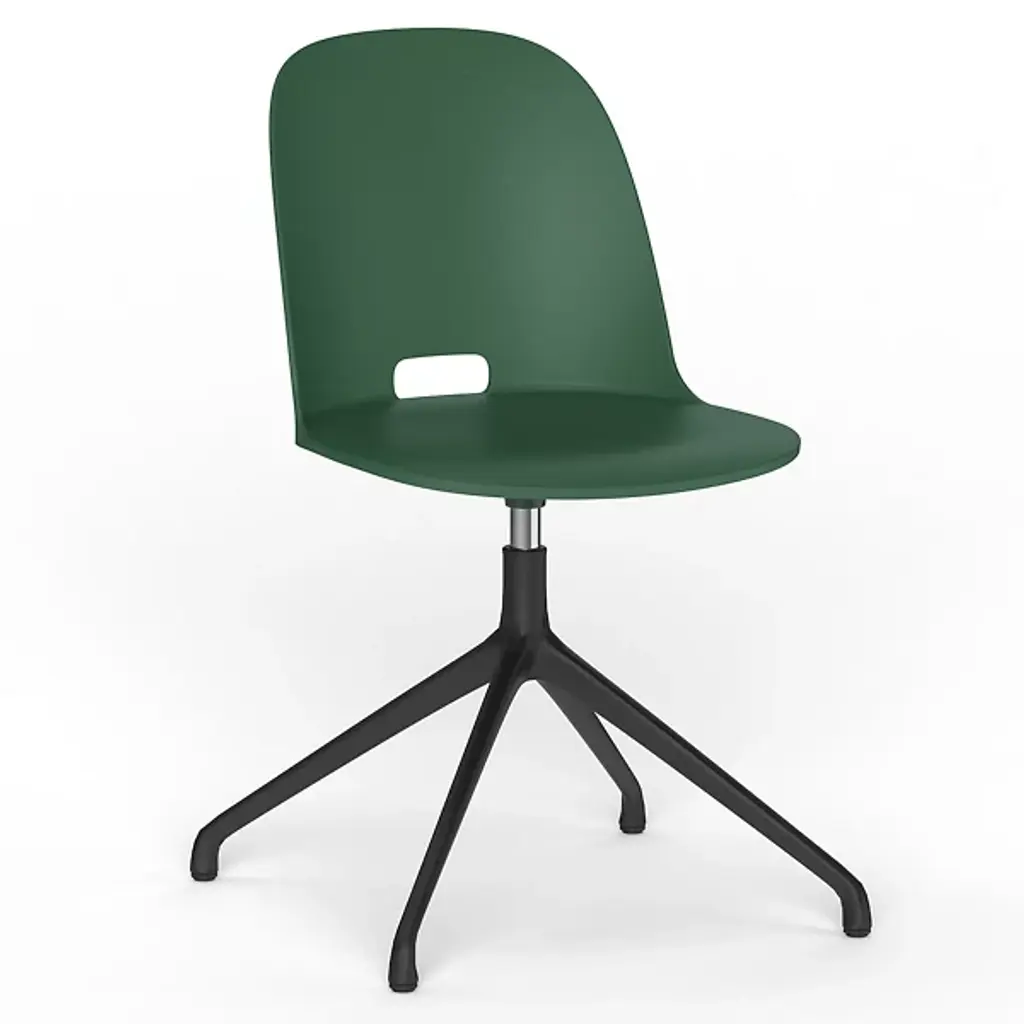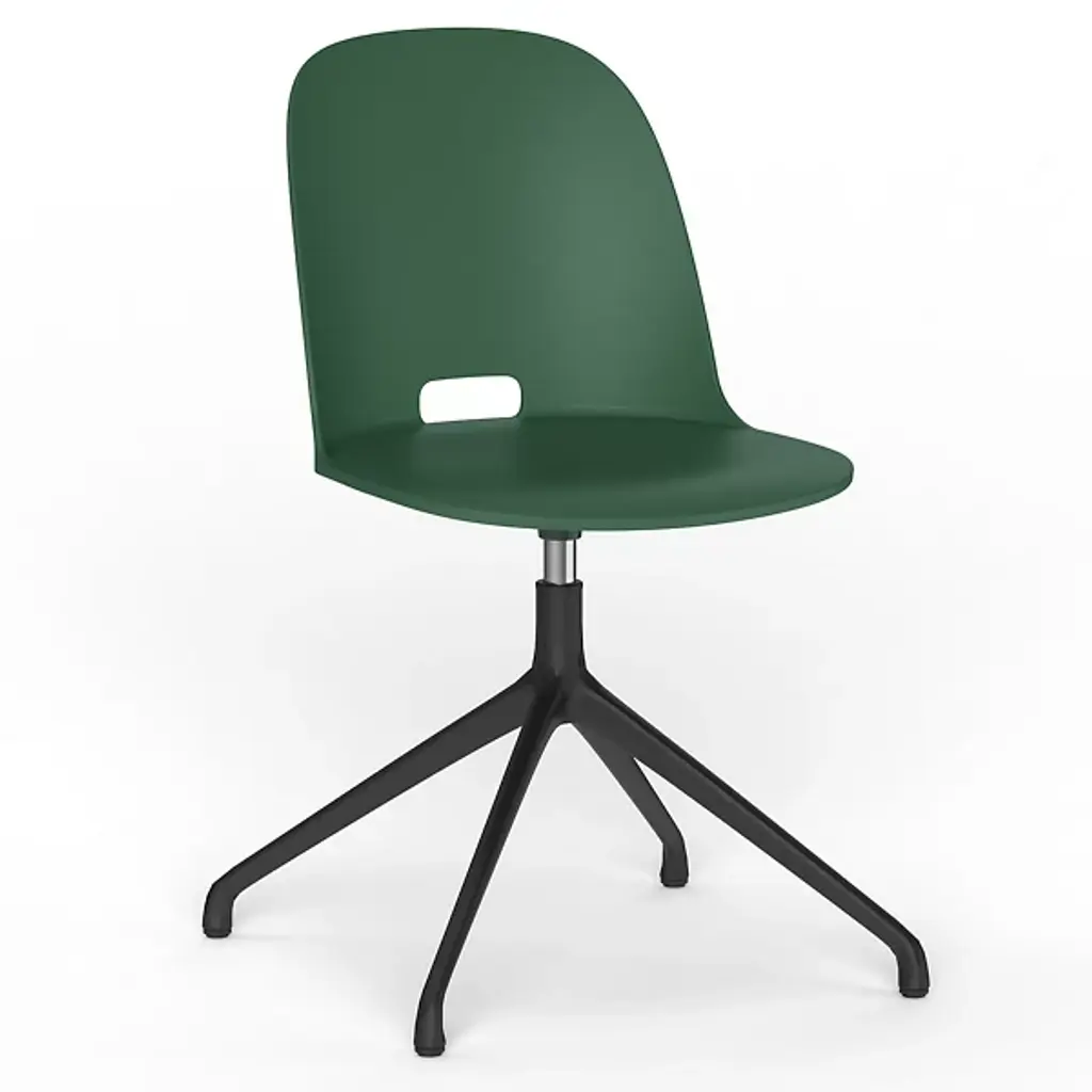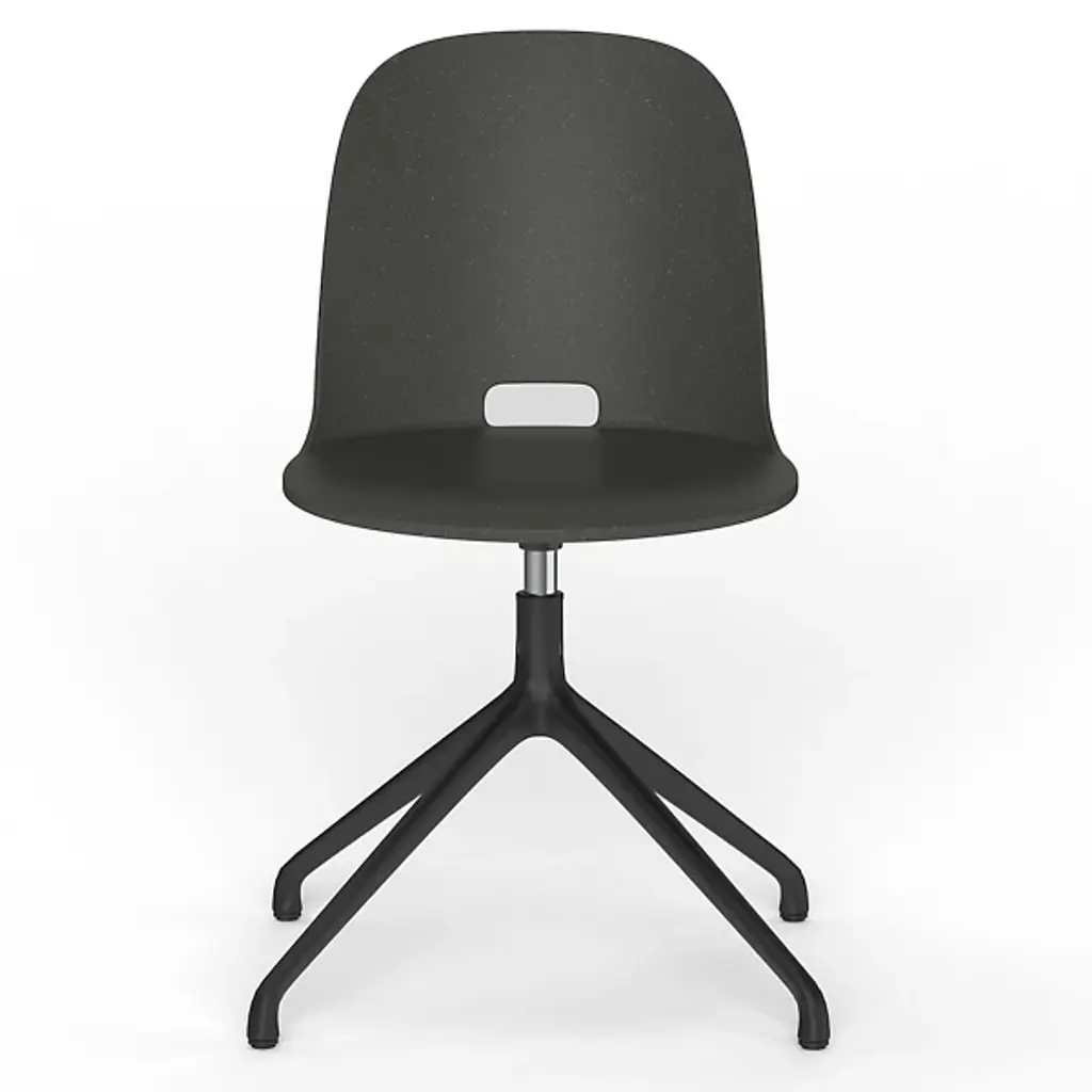 The Alfi Work Swivel Chair with Felt Glides from Emeco wraps one in clean, relaxing shapes modeled after the woven cane brasserie chairs found on the streets of Paris. Creator Jasper Morrison’s ‘super normal’ design aesthetic preaches the balance of shape and character with tension and expression. This swiveling chair creates intriguing tension with the stable, spider-like contours of its recycled aluminum base. Shape and character ring clear in the delightful curves of the brasserie-inspired seat shell. This form-hugging shell’s recycled plastic and wood fiber blend please in its soft texture.