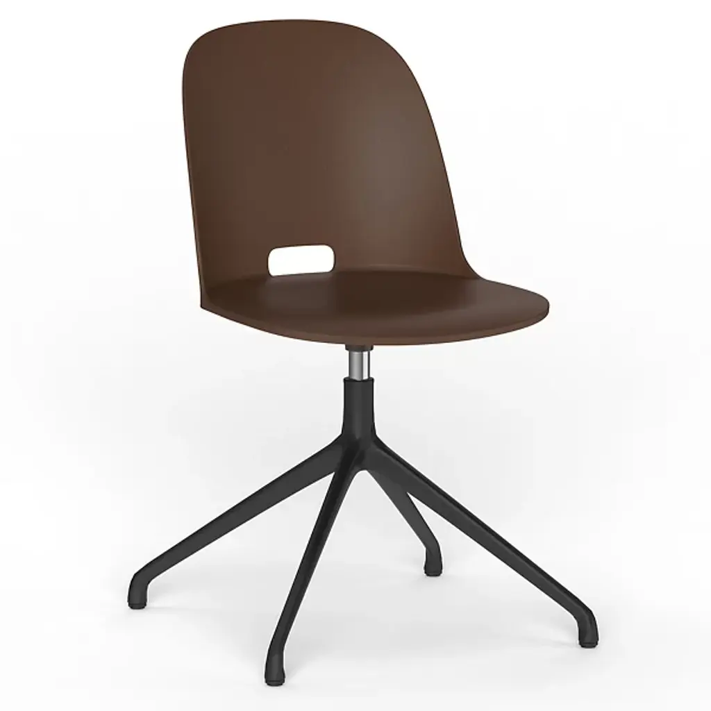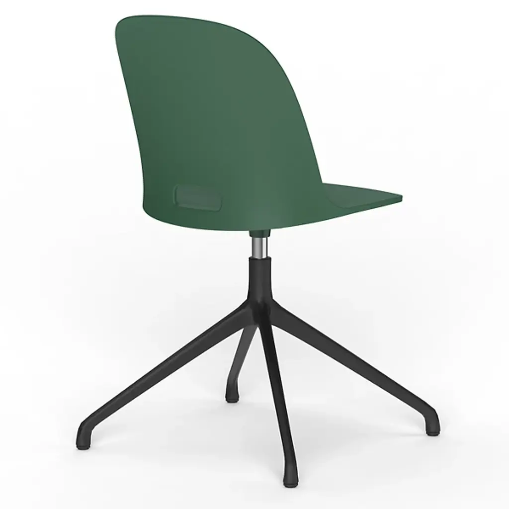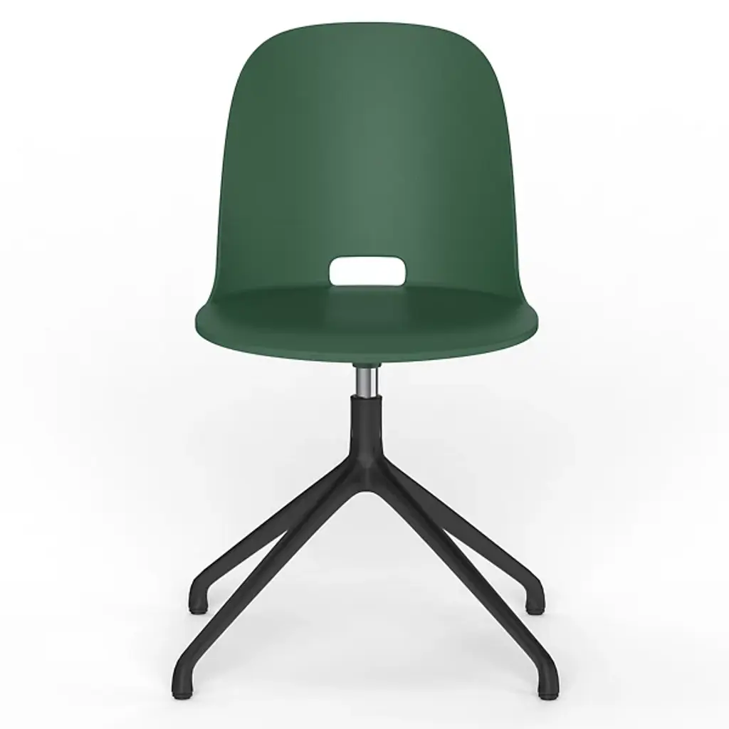 The Alfi Work Swivel Chair with Felt Glides from Emeco wraps one in clean, relaxing shapes modeled after the woven cane brasserie chairs found on the streets of Paris. Creator Jasper Morrison’s ‘super normal’ design aesthetic preaches the balance of shape and character with tension and expression. This swiveling chair creates intriguing tension with the stable, spider-like contours of its recycled aluminum base. Shape and character ring clear in the delightful curves of the brasserie-inspired seat shell. This form-hugging shell’s recycled plastic and wood fiber blend please in its soft texture.