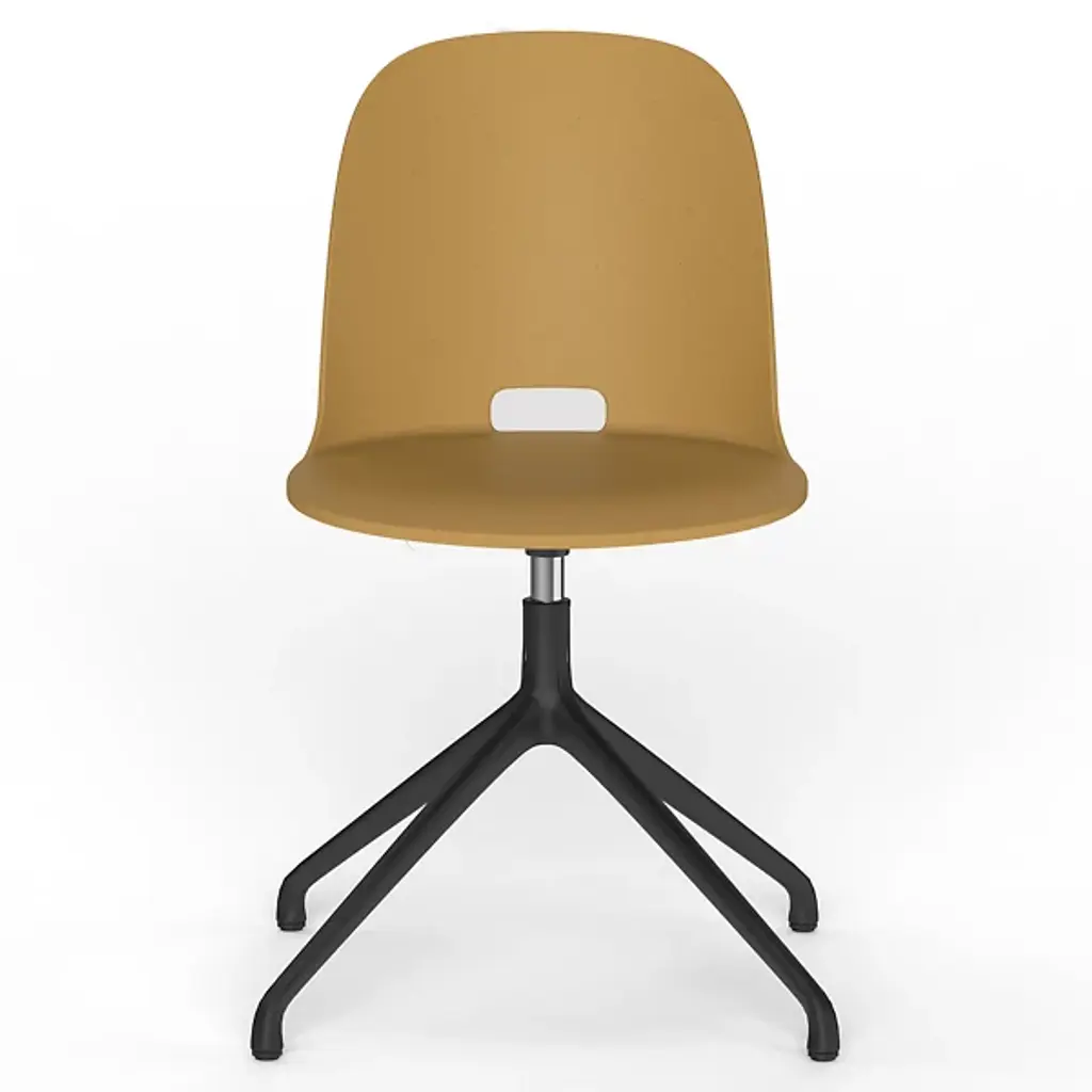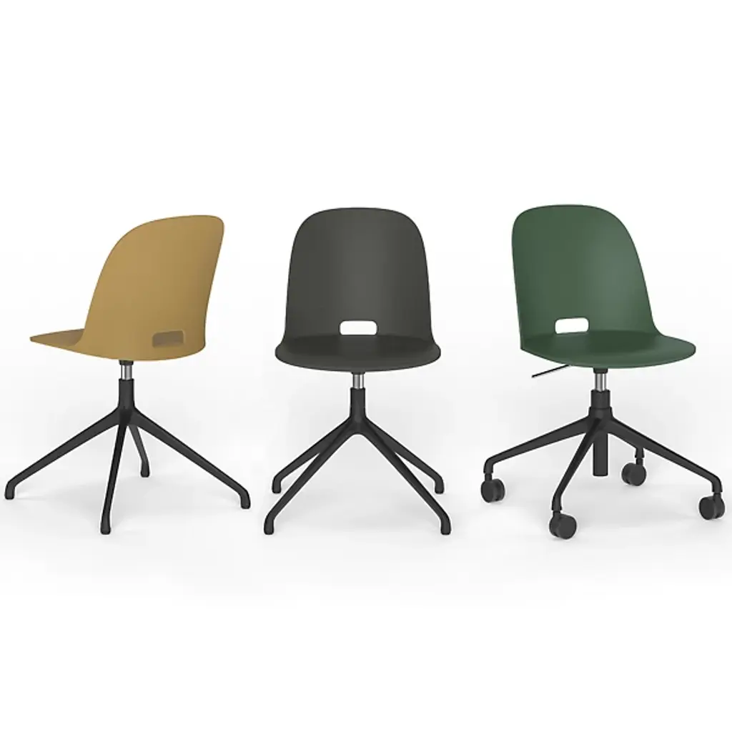 The Alfi Work Swivel Chair with Felt Glides from Emeco wraps one in clean, relaxing shapes modeled after the woven cane brasserie chairs found on the streets of Paris. Creator Jasper Morrison’s ‘super normal’ design aesthetic preaches the balance of shape and character with tension and expression. This swiveling chair creates intriguing tension with the stable, spider-like contours of its recycled aluminum base. Shape and character ring clear in the delightful curves of the brasserie-inspired seat shell. This form-hugging shell’s recycled plastic and wood fiber blend please in its soft texture.
