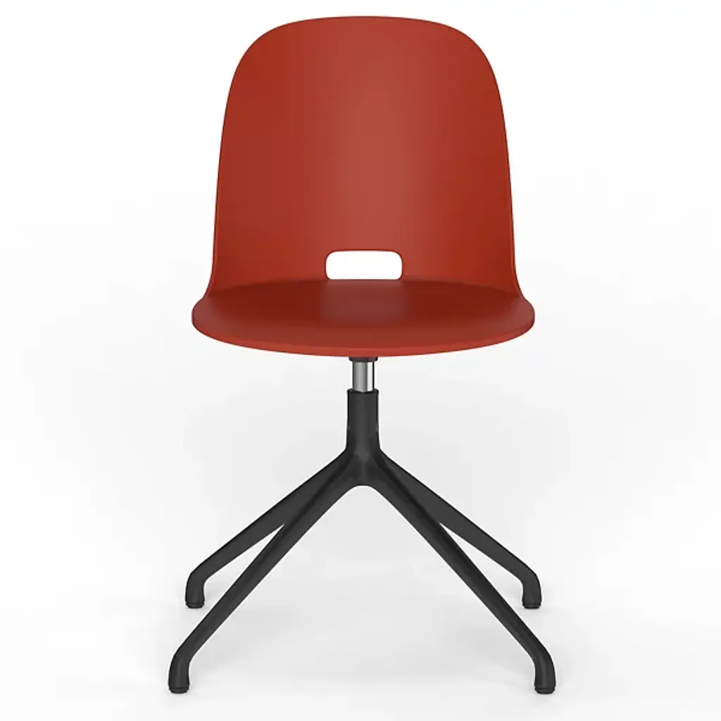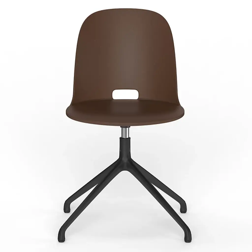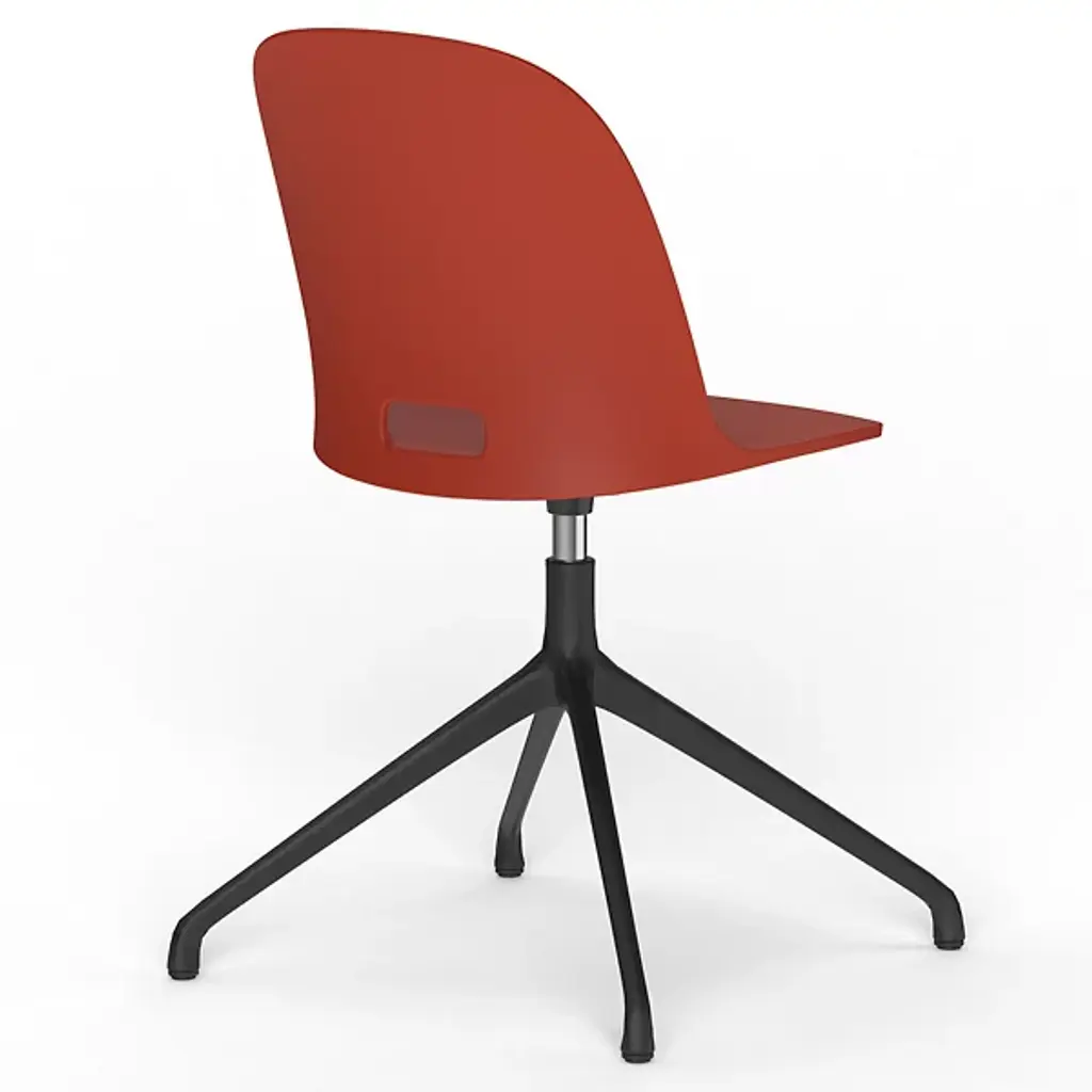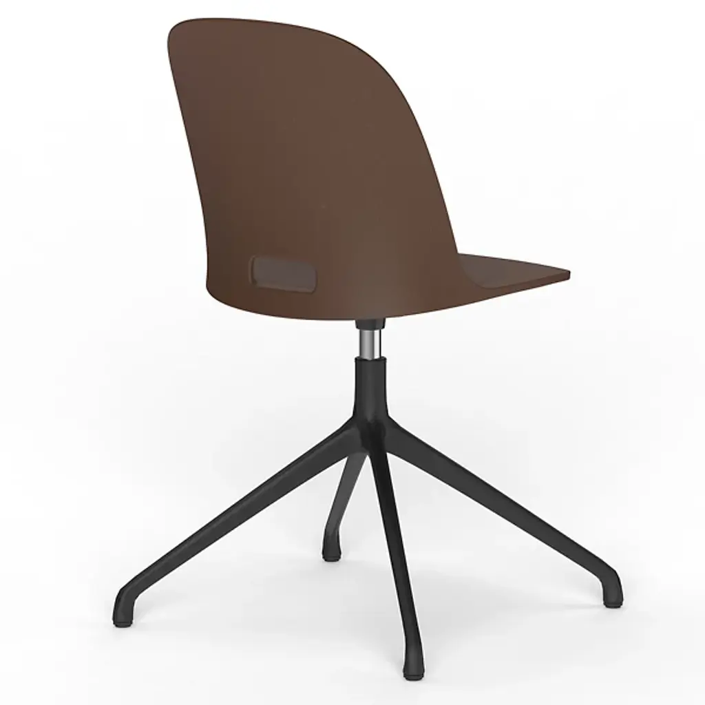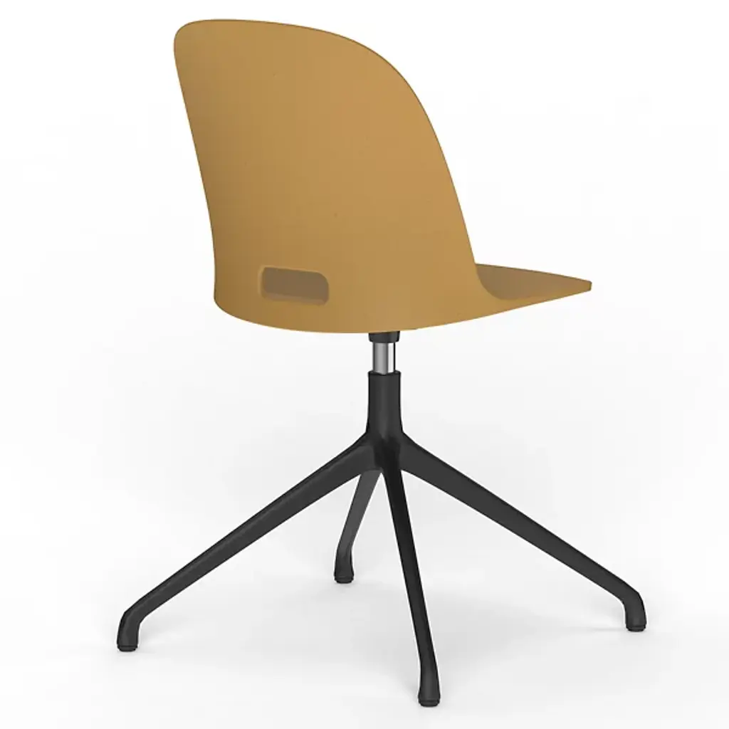 The Alfi Work Swivel Chair with Felt Glides from Emeco wraps one in clean, relaxing shapes modeled after the woven cane brasserie chairs found on the streets of Paris. Creator Jasper Morrison’s ‘super normal’ design aesthetic preaches the balance of shape and character with tension and expression. This swiveling chair creates intriguing tension with the stable, spider-like contours of its recycled aluminum base. Shape and character ring clear in the delightful curves of the brasserie-inspired seat shell. This form-hugging shell’s recycled plastic and wood fiber blend please in its soft texture.