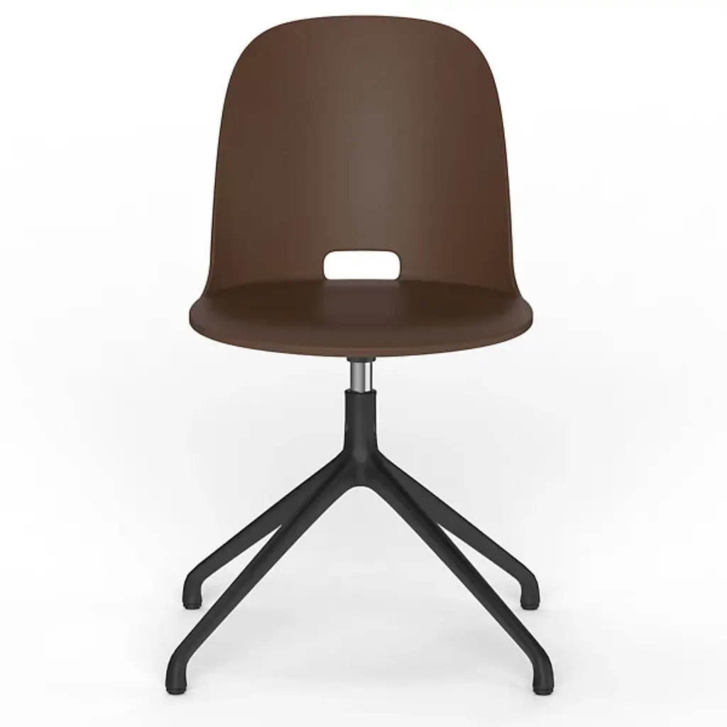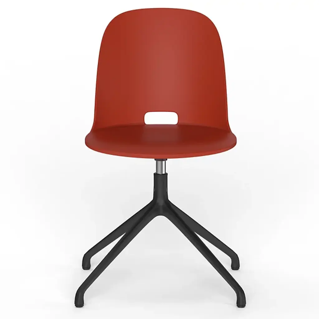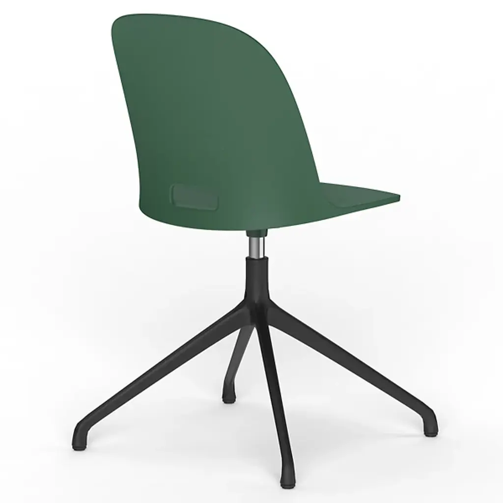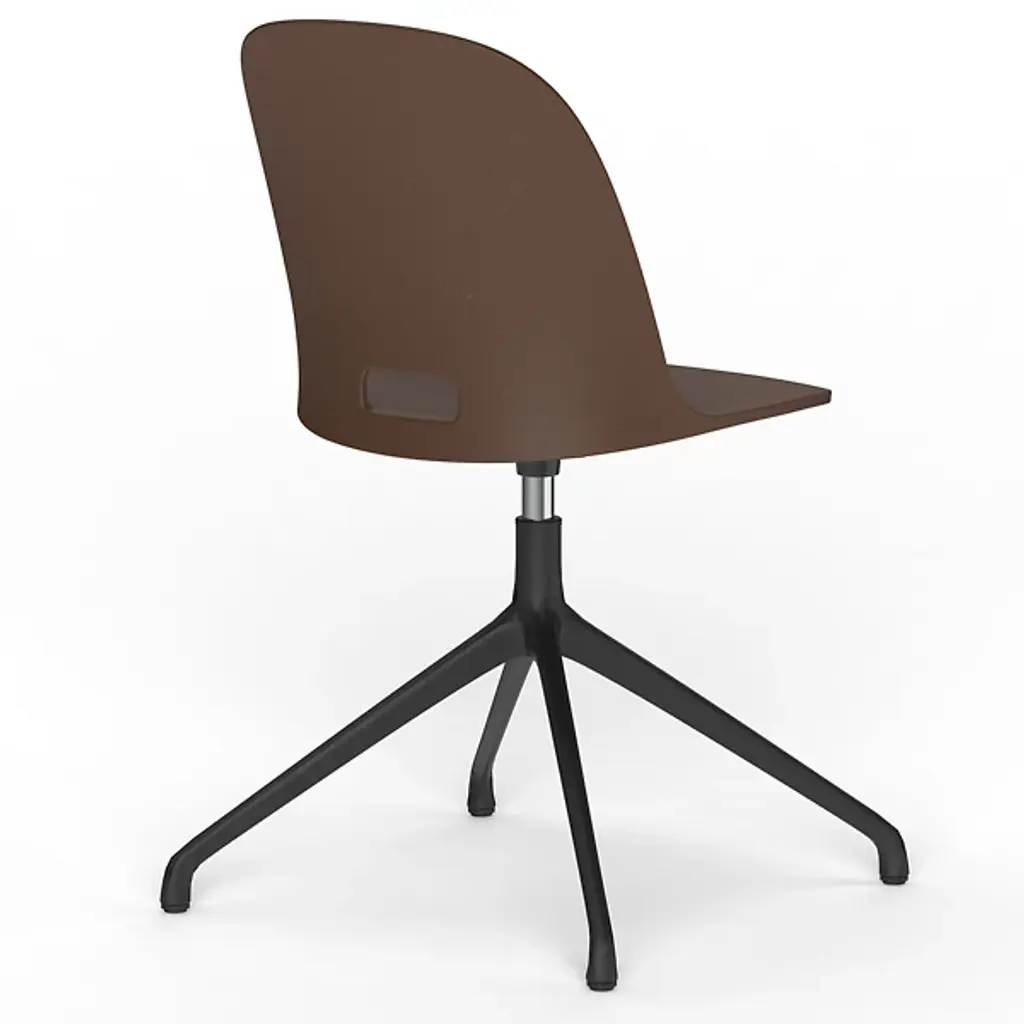 The Alfi Work Swivel Chair with Glides from Emeco invites one to take it easy at the desk like a relaxing morning at the café as a refined take on the woven cane brasserie chair. Shape and character find balance with tension and expression in a design approach Jasper Morrison calls ‘super normal.’ This balance shows in the chair’s pairing of curves and sharp lines. Here, a recycled aluminum base tapers to create a pointing silhouette. A swiveling feature gives the shell smooth movement. The shell’s alluring texture is made using recycled plastic and wood fibers. This shell wraps one’s back for support and curves under the lower body.