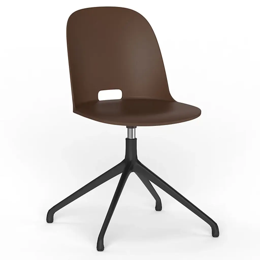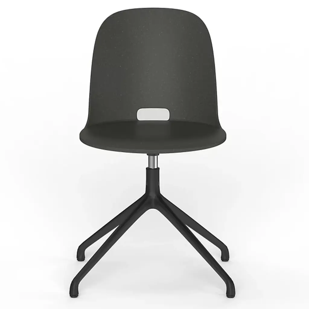 The Alfi Work Swivel Chair with Glides from Emeco invites one to take it easy at the desk like a relaxing morning at the café as a refined take on the woven cane brasserie chair. Shape and character find balance with tension and expression in a design approach Jasper Morrison calls ‘super normal.’ This balance shows in the chair’s pairing of curves and sharp lines. Here, a recycled aluminum base tapers to create a pointing silhouette. A swiveling feature gives the shell smooth movement. The shell’s alluring texture is made using recycled plastic and wood fibers. This shell wraps one’s back for support and curves under the lower body.