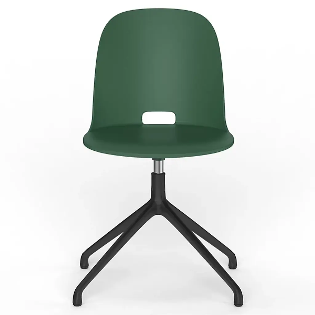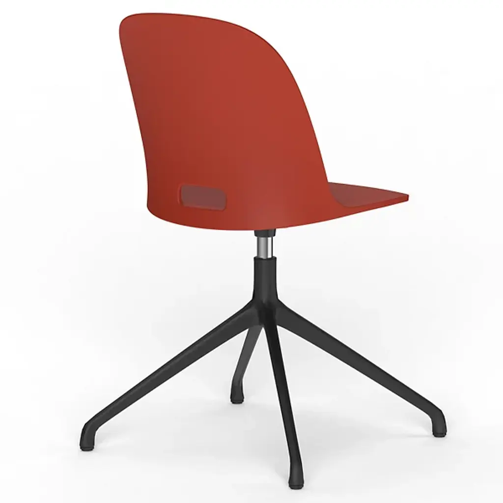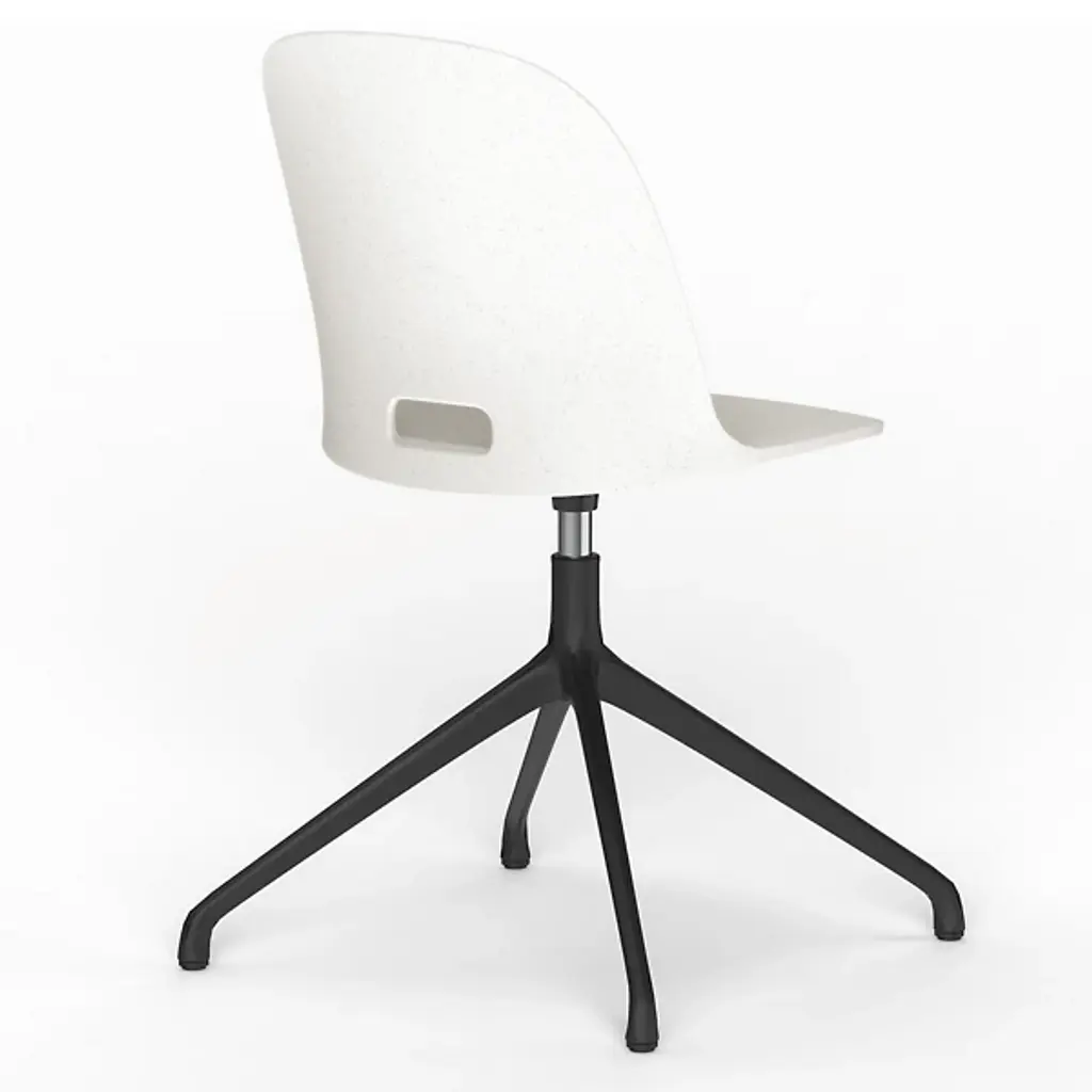 The Alfi Work Swivel Chair with Glides from Emeco invites one to take it easy at the desk like a relaxing morning at the café as a refined take on the woven cane brasserie chair. Shape and character find balance with tension and expression in a design approach Jasper Morrison calls ‘super normal.’ This balance shows in the chair’s pairing of curves and sharp lines. Here, a recycled aluminum base tapers to create a pointing silhouette. A swiveling feature gives the shell smooth movement. The shell’s alluring texture is made using recycled plastic and wood fibers. This shell wraps one’s back for support and curves under the lower body.