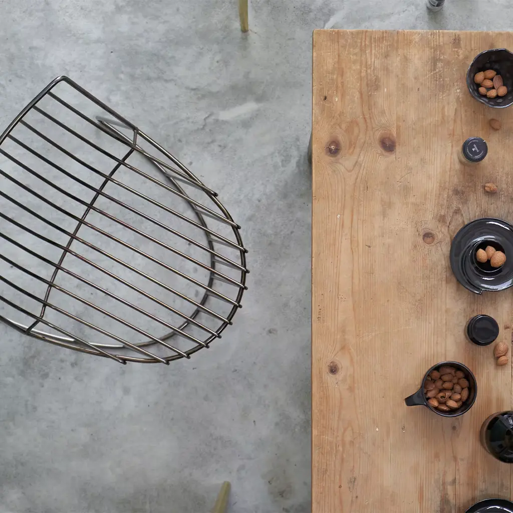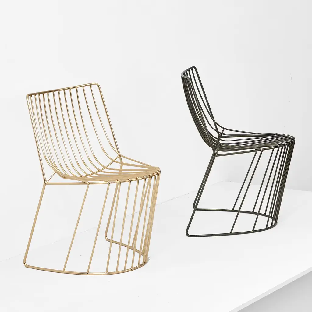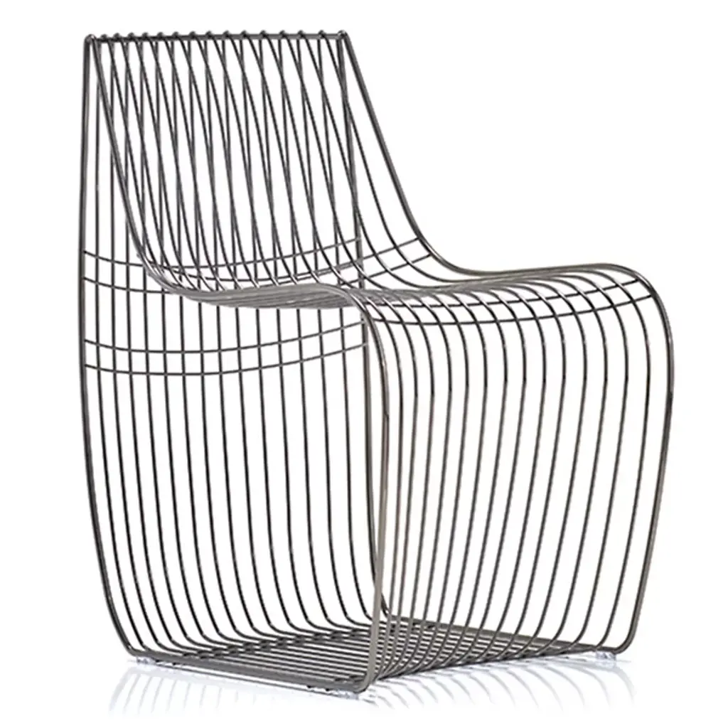 Precious and conceptual seat by Enrico Girotti, where two opposing ideals of surfaces are dashed by a sequence of wires carefully shaped to be comfortable. Amarone chair is made in steel galvanized black chrome. Please, ask the Concierge for customization options.