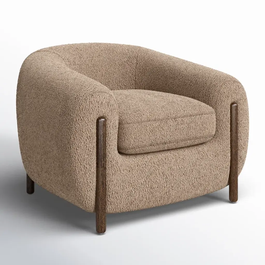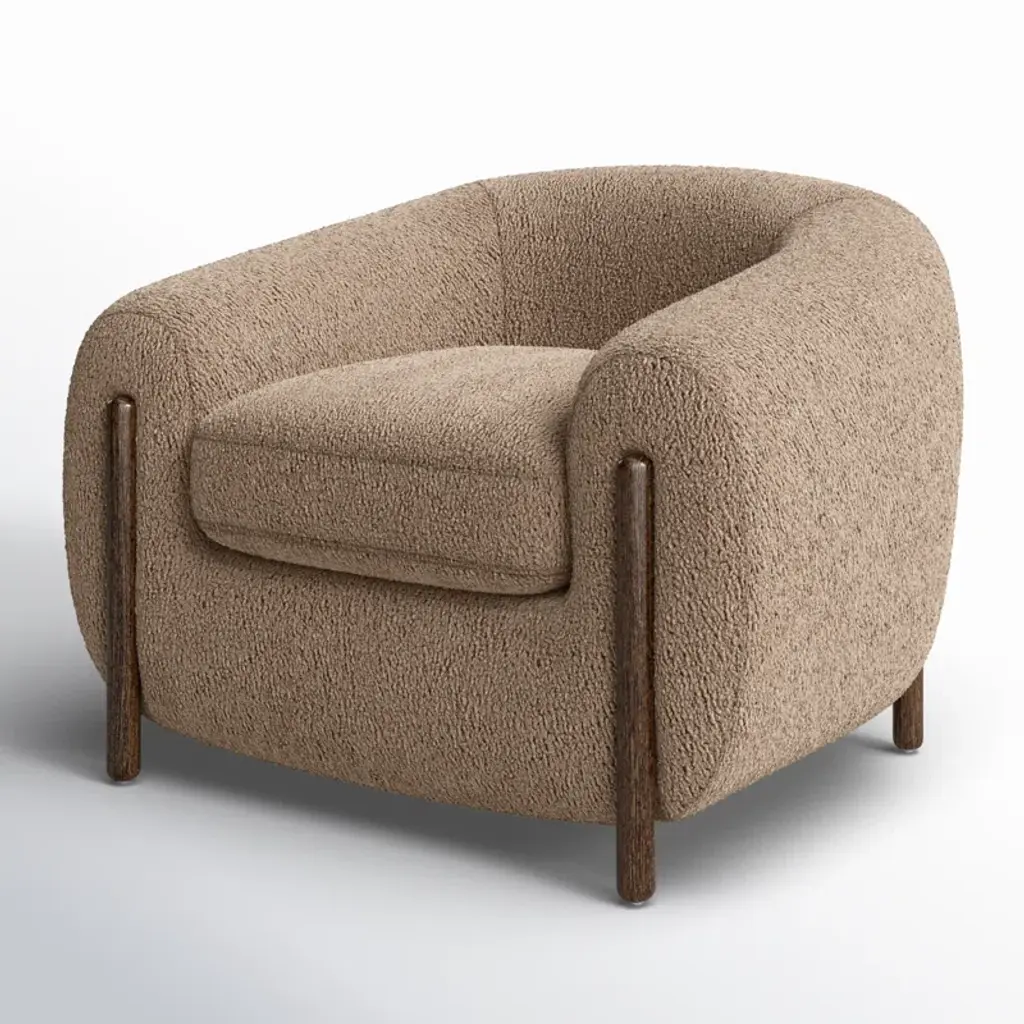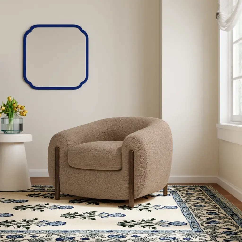A fresh take on the traditional tub chair, with exaggerated depth for drama and comfort. Solid rubberwood legs intersect upholstery for a clean contrast of color and scale.
