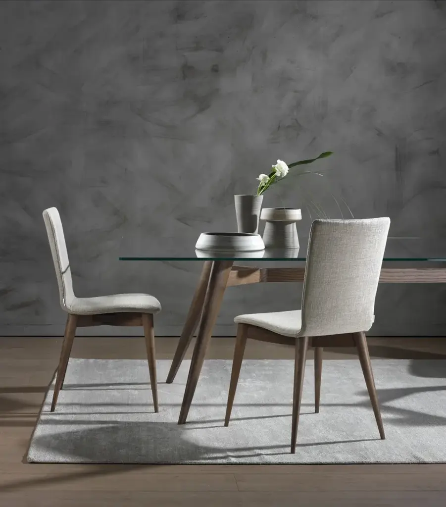 Ambra - Chair with structure in solid ash, curved shell covered in leather, eco-leather or fabric of the collection.