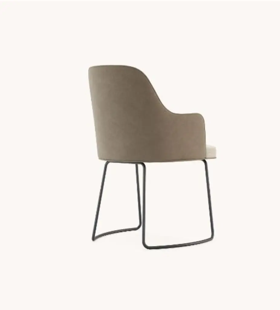 Anna chair with armrest and metal baseboard by Domkapa.Materials: microfibers, black texturized steel, metal. Dimensions: W 56 x D 57 x H 86 cm.Also available in different materials. This timeless chair design is the result of a mature awareness process inspired by different ideas and experiences. Available in four distinct versions, it includes two options for armrest customization (with or without armrest) as well as two customization options for the base (four legs or a sled base). Concerning the base, you can choose a wooden or metallic finish. Meanwhile, the upholstered seat and backrest can also be customized with contrasting fabrics. Anna chair is a playground piece for professionals, allowing endless customization options for limitless results.Domkapa holds a tremendous passion for detailed stitching, presenting several similarities to the haute-couture philosophy focused on the value of a “made by hand”. Based in Portugal, Domkapa was founded in 2009 as a Private Label. The long and fruitful path, full of experience and achievements inspired the brand’s new identity and independence, in 2017.Domkapa challenges its team to create the perfect daily meeting between design and comfort in each piece of the brand’s collections. Our design team works side by side with the production, and this organic synergy allows the creation of innovative designs.