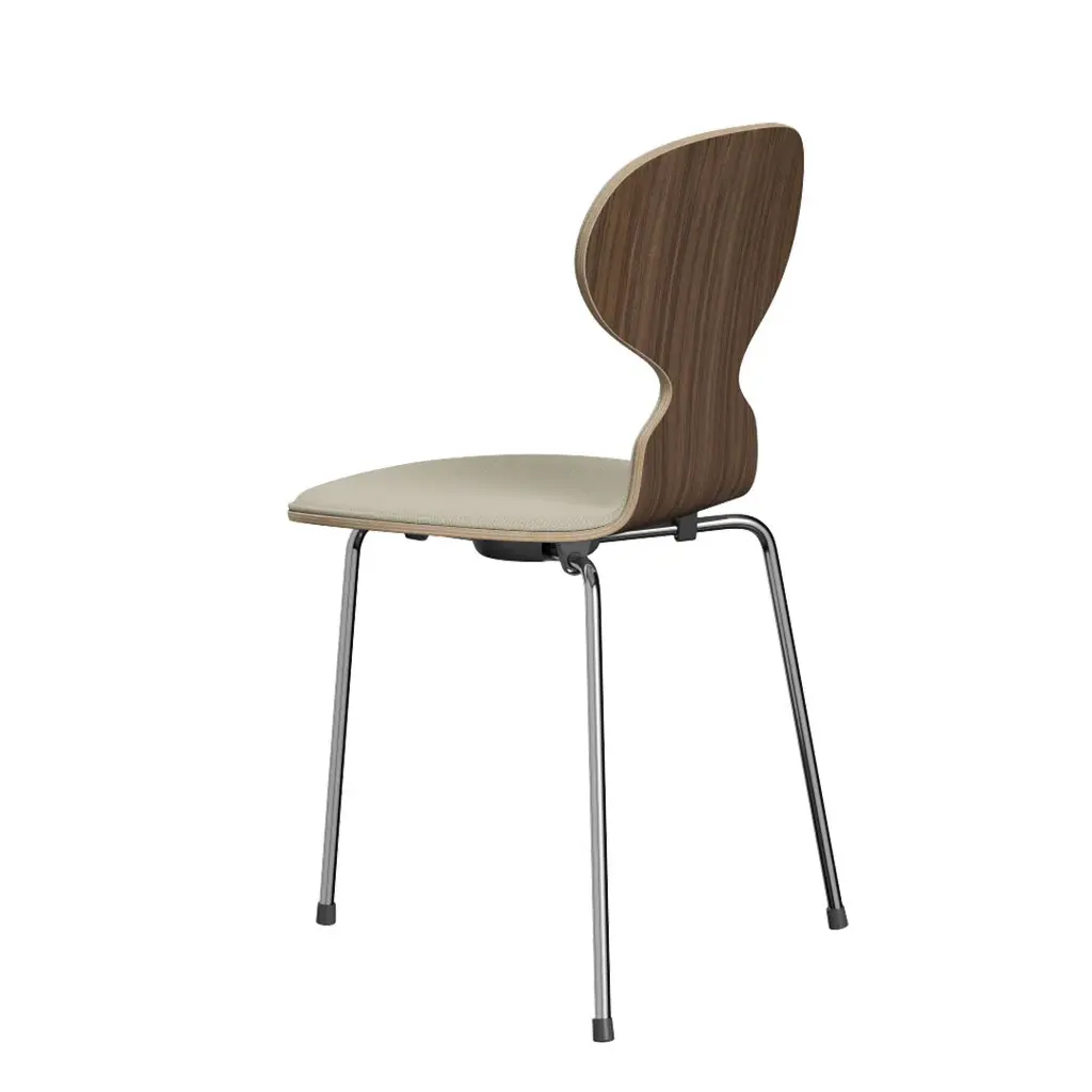 The Ant chair's visual expression is delicate and artful, much like the curves of a musical instrument. Its elegant shape disguises its remarkable strength and comfort. The Ant is now available with front upholstery in a wide range of textiles and leathers. The chair's shell is made of pressure moulded veneer and comes in natural, coloured ash or lacquered veneer. The base comes with an option of 3 or 4 legs made of chromed or powder-coated tubular steel.