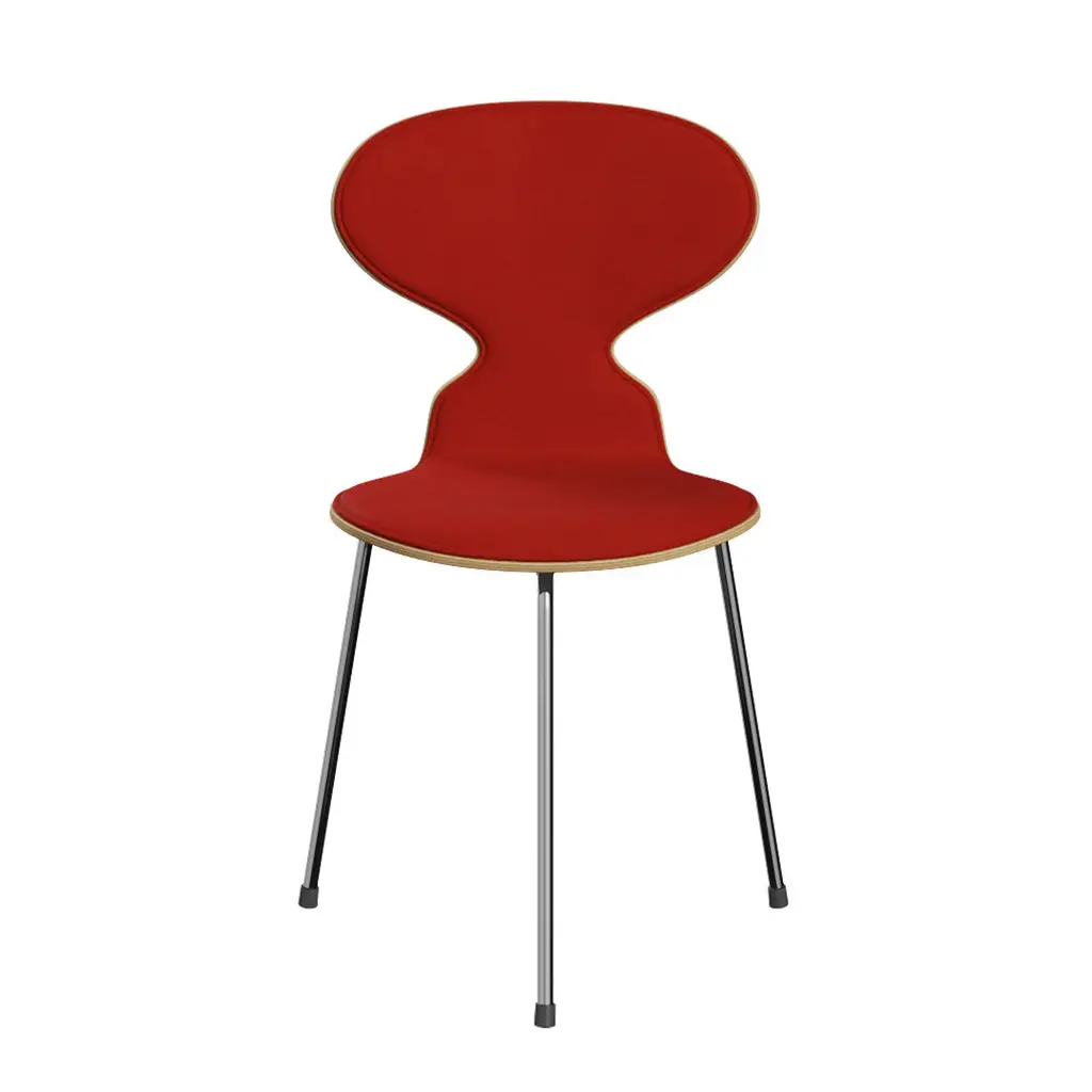 The Ant chair's visual expression is delicate and artful, much like the curves of a musical instrument. Its elegant shape disguises its remarkable strength and comfort. The Ant is now available with front upholstery in a wide range of textiles and leathers. The chair's shell is made of pressure moulded veneer and comes in natural, coloured ash or lacquered veneer. The base comes with an option of 3 or 4 legs made of chromed or powder-coated tubular steel.