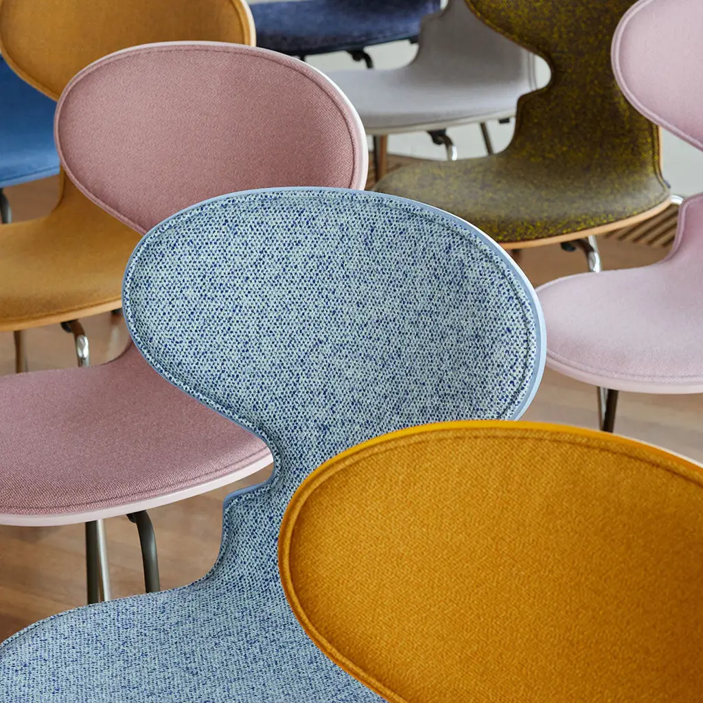 The Ant chair's visual expression is delicate and artful, much like the curves of a musical instrument. Its elegant shape disguises its remarkable strength and comfort. The Ant is now available with front upholstery in a wide range of textiles and leathers. The chair's shell is made of pressure moulded veneer and comes in natural, coloured ash or lacquered veneer. The base comes with an option of 3 or 4 legs made of chromed or powder-coated tubular steel.