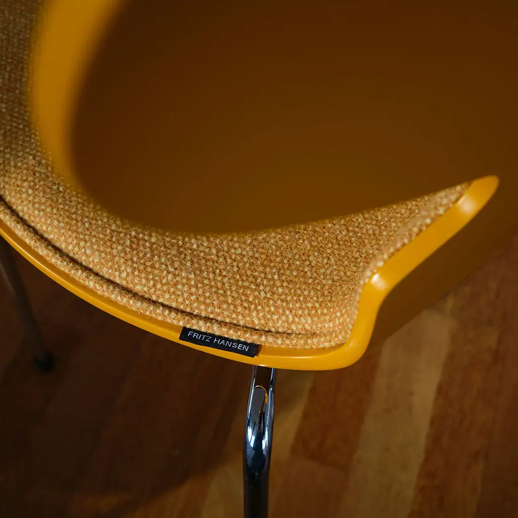 The Ant chair's visual expression is delicate and artful, much like the curves of a musical instrument. Its elegant shape disguises its remarkable strength and comfort. The Ant is now available with front upholstery in a wide range of textiles and leathers. The chair's shell is made of pressure moulded veneer and comes in natural, coloured ash or lacquered veneer. The base comes with an option of 3 or 4 legs made of chromed or powder-coated tubular steel.