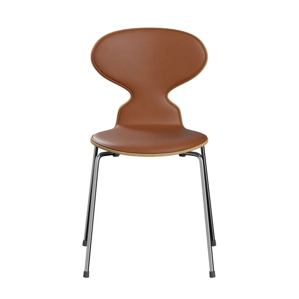 The Ant chair's visual expression is delicate and artful, much like the curves of a musical instrument. Its elegant shape disguises its remarkable strength and comfort. The Ant is now available with front upholstery in a wide range of textiles and leathers. The chair's shell is made of pressure moulded veneer and comes in natural, coloured ash or lacquered veneer. The base comes with an option of 3 or 4 legs made of chromed or powder-coated tubular steel.