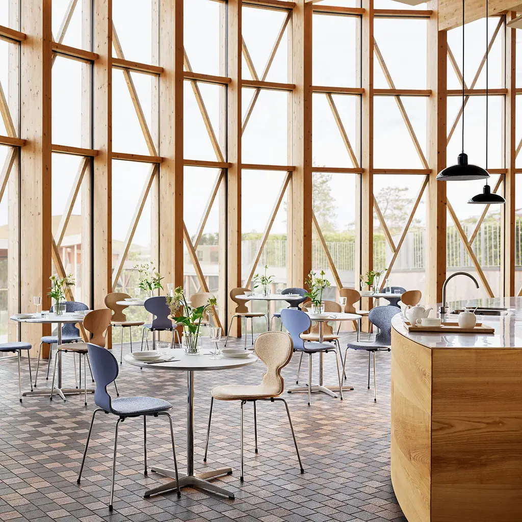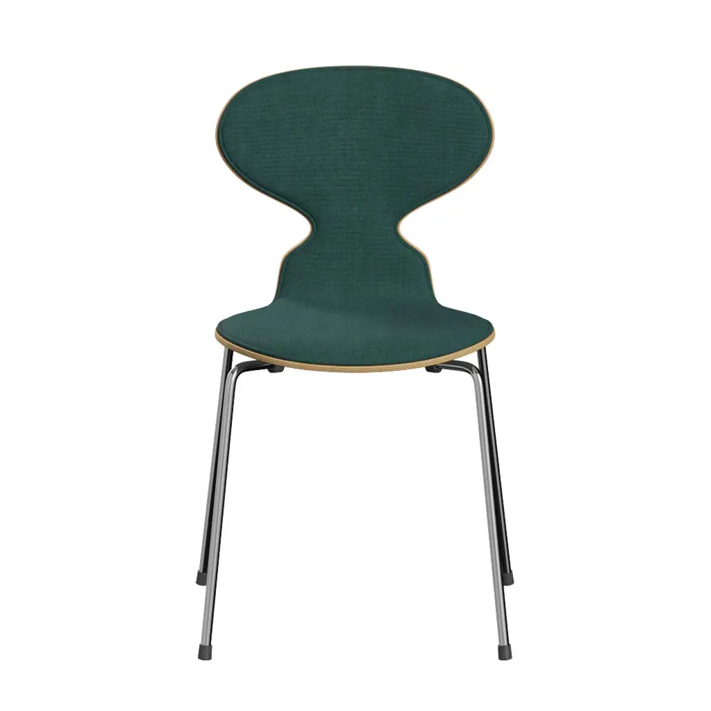 The Ant chair's visual expression is delicate and artful, much like the curves of a musical instrument. Its elegant shape disguises its remarkable strength and comfort. The Ant is now available with front upholstery in a wide range of textiles and leathers. The chair's shell is made of pressure moulded veneer and comes in natural, coloured ash or lacquered veneer. The base comes with an option of 3 or 4 legs made of chromed or powder-coated tubular steel.