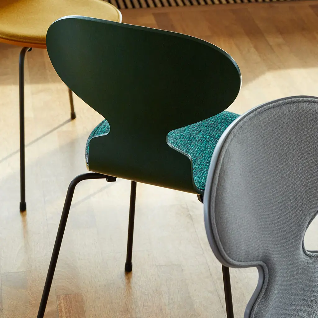 The Ant chair's visual expression is delicate and artful, much like the curves of a musical instrument. Its elegant shape disguises its remarkable strength and comfort. The Ant is now available with front upholstery in a wide range of textiles and leathers. The chair's shell is made of pressure moulded veneer and comes in natural, coloured ash or lacquered veneer. The base comes with an option of 3 or 4 legs made of chromed or powder-coated tubular steel.