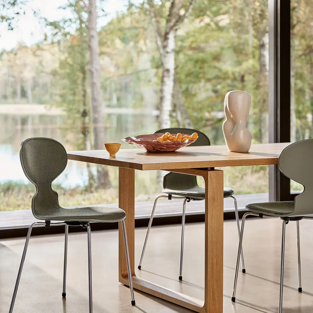 The Ant chair's visual expression is delicate and artful, much like the curves of a musical instrument. Its elegant shape disguises its remarkable strength and comfort. The Ant is now available with front upholstery in a wide range of textiles and leathers. The chair's shell is made of pressure moulded veneer and comes in natural, coloured ash or lacquered veneer. The base comes with an option of 3 or 4 legs made of chromed or powder-coated tubular steel.