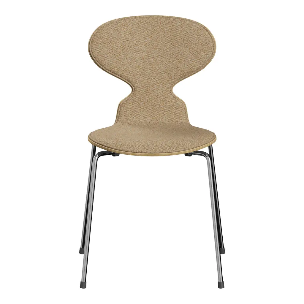 The Ant chair's visual expression is delicate and artful, much like the curves of a musical instrument. Its elegant shape disguises its remarkable strength and comfort. The Ant is now available with front upholstery in a wide range of textiles and leathers. The chair's shell is made of pressure moulded veneer and comes in natural, coloured ash or lacquered veneer. The base comes with an option of 3 or 4 legs made of chromed or powder-coated tubular steel.
