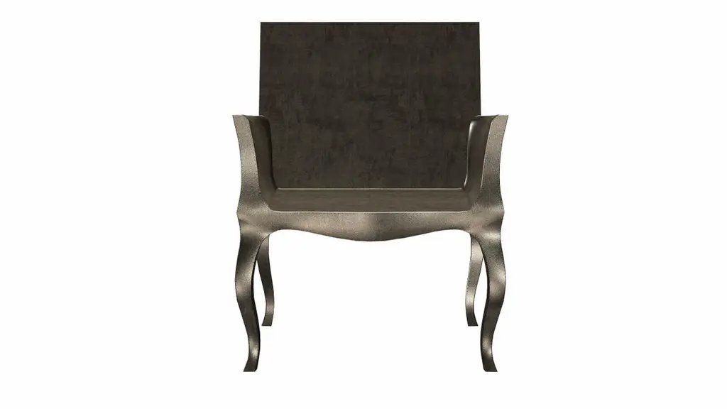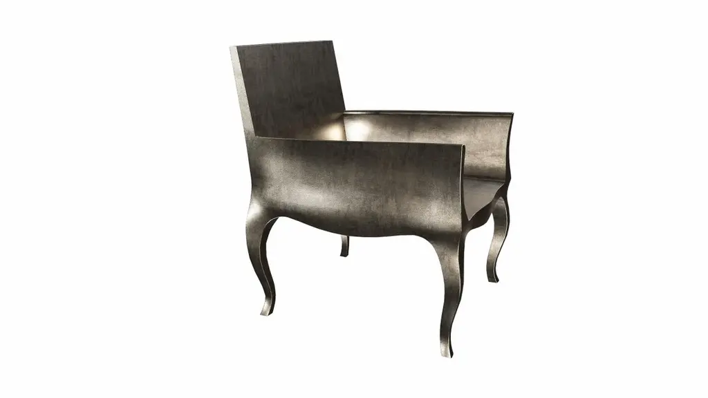 Introducing the Art Deco Chairs, a stunning Art Deco Chairs set designed by the renowned Paul Mathieu for Stephanie Odegard. This elegant Art Deco Chair duo boasts a unique curved profile that exudes a sophisticated and timeless charm, making it the perfect addition to any modern or classic interior.Crafted with utmost care and attention to detail, these Art Deco Chairs are made to order and are available in twelve metal clad finishes, ensuring that you can choose the perfect one to match your individual style and taste. The use of high-quality materials and expert craftsmanship ensure that each Art Deco Chair is not only beautiful but also a true piece of art.The curved legs and side arms of this Art Deco Chair are hand carved from solid pieces of teak. Pattern makers trace and cut complex forms that will cover the chair in a skin of copper, white bronze, brass or antiqued white bronze The metal finishes will tarnish over time. Regular non-abrasive household metal polishes can be used to restore the original luster.Overall, if you're looking for a piece of furniture that combines luxury, comfort, and style, then the Art Deco Chairs is an excellent choice. With its distinctive curved profile and multiple finish options, this Chair set is sure to elevate the look of any room it is placed in, and be a beloved addition to your home for years to come.The images shown in this listing are shot in different lighting conditions and/or are 3D illustrations. We encourage our customers to please request a sample or a full sample set of 12 finishes so that they can experience the finish first hand. Antique Art Deco Chairs Fine Hammered in Antique Bronze by Paul Mathieu for Stephanie OdegardSize- 26"x 27"x 33"HMaterials - Antique White Bronze Metal sheet, Teak, Wood, MetalTechniques: Hand-Crafted, Hand-Carved, Metal Work, Wood Work, Metal Wrapping, PolishedPlease note that moisture in air, sudden change in temperature and natural movement of wood over time causes the metal to wrinkle or bubble up. We use well seasoned, reclaimed teak and high quality marine grade MDF (wherever technically possible) to avoid and delay the mentioned changes. However a perfect stability of metal cannot be guaranteed. Please note that our smooth finish metal clad pieces will have some unavoidable tool marks. This is proof that everything is done by hand. The smooth finish will not come out like a machine made perfect surface and the master artisan will do their best to make it look as good/clean/stable/perfect as he possibly can.The antique white bronze finish is hand done by using an acidic chemical over the white bronze finish to recreate a natural patination. Like with the natural patination of silver, copper, or brass, the final result and color uniformity of the patina cannot be guaranteed. The goal of this finish is to achieve rainbow-like shades with dull, shiny, cloudy, and streaky patches to give an illusion of antiquing. Please note:None of our metal clad pieces are treated with a protective “finish” thus enabling the items to age naturally over time. We will of course polish them well before we pack them. a) Copper oxidizes faster than the other metals. In six to twelve months it will most likely lose its shine and will gradually turn to different shades of brown and/or green/blue. This aging process and its effect is referred to as verdigris. After a year the piece should not change much more. Copper does not rust, but does require periodic cleaning in order to retain its original shine if that the preferred option. ('BRASSO' or any known copper polish can be used to polish copper).b) Brass retains its shine for far longer than others, but will tarnish if not cleaned on occasion. ('BRASSO' is made to polish brass).c) White bronze, has the least tendency to show age or tarnish. If kept in a controlled climate, this metal will hold its shine for years. It can be cleaned with a cleanser and polished with a cloth. d) The antiqued white bronze finish will react with the natural elements the fastest in the beginning but it too will stop reacting and will settle down in a stable state like copper after 6-12 months. Since it is already antiqued and looked like it is tarnished, as described in an earlier message, this fast reaction will not change the over all look. In that way this surface is most forgiving. The images shown in this listing are shot in different lighting conditions and/or are 3D illustrations. We encourage our customers to please request a sample or a full sample set of 12 finishes so that they can experience the finish first hand.