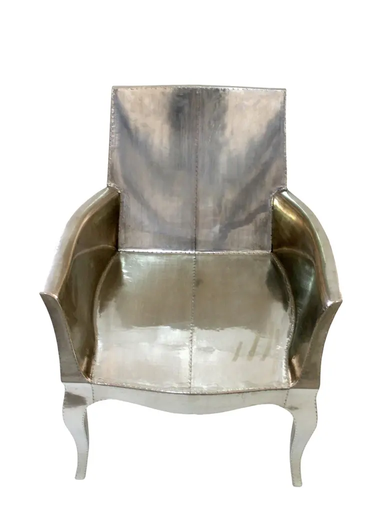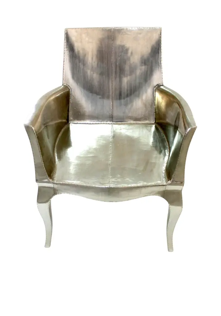 "Introducing the Antique Art Deco Chairs Pair, a stunning set of antique Art Deco chairs designed by the renowned Paul Mathieu for Stephanie Odegard. These elegant antique Art Deco chairs boast a unique curved profile that exudes a sophisticated and timeless charm, making them the perfect addition to any modern or Classic interior.Crafted with utmost care and attention to detail, these antique Art Deco chairs are made to order and are available in twelve metal clad finishes, ensuring that you can choose the perfect one to match your individual style and taste. The use of high-quality materials and expert craftsmanship ensure that each chair is not only beautiful but also a true piece of art.The curved legs and side arms of these antique Art Deco chairs are hand carved from solid pieces of teak. Pattern makers trace and cut complex forms that will cover the chair in a skin of copper or purest silver (assayed at 96% purity, beyond sterling at 92.5%). The metal finishes will tarnish over time. Regular non-abrasive household metal polishes can be used to restore the original lustre.Overall, if you're looking for a piece of furniture that combines luxury, comfort, and style, then the Antique Art Deco Chairs Pair is an excellent choice. With their distinctive curved profile and multiple finish options, this chair set is sure to elevate the look of any room it is placed in and be a beloved addition to your home for years to come.Antique Art Deco Chairs Pair Designed by Paul Mathieu for Stephanie OdegardSize: 26"" L x 27"" W x 33"" HMaterials: White Bronze Metal sheet, Teak, Wood, MetalTechniques: Cast, handcrafted, hand carved, Metal Work, Wood Work, PolishedPlease note that moisture in the air, sudden changes in temperature, and natural movement of wood over time may cause the metal to wrinkle or bubble up. We use well-seasoned, reclaimed teak and high-quality marine-grade MDF (wherever technically possible) to avoid and delay the above-mentioned changes. However, a perfect stability of the metal cannot be guaranteed.Please note that our smooth finish metal clad pieces may have some unavoidable tool marks. This is proof that everything is done by hand. The smooth finish will not come out like a machine-made perfect surface, and the master artisan will do their best to make it look as good, clean, stable, and perfect as they possibly can.".