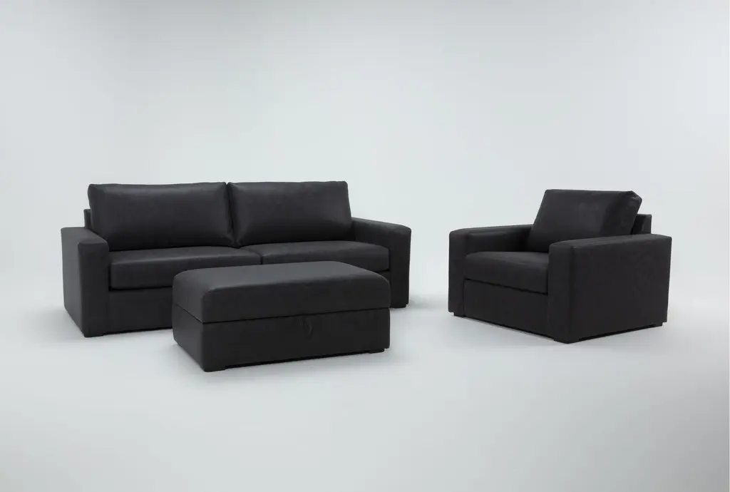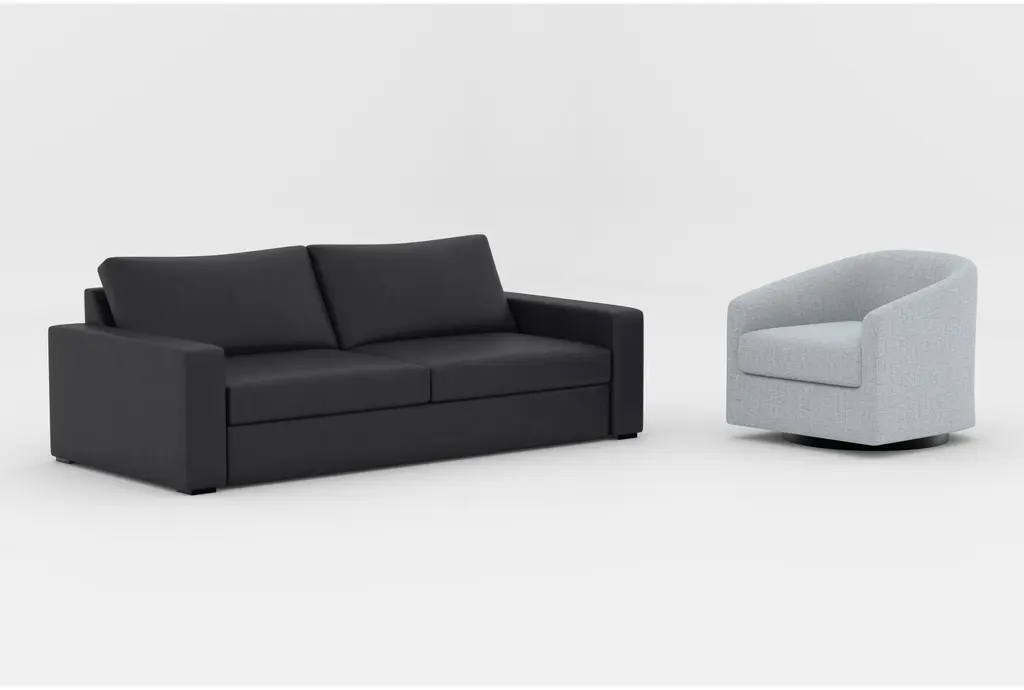 Introducing the Araceli II Charcoal Grey Vegan Faux Leather Sofa and the Carlisle Fabric Swivel Barrel Arm Chair with Espresso Finish. These pieces are designed to bring a touch of modern style to your living room. The sofa's charcoal grey faux leather upholstery offers a sleek and sophisticated look, while the chair's swivel design adds both comfort and functionality.