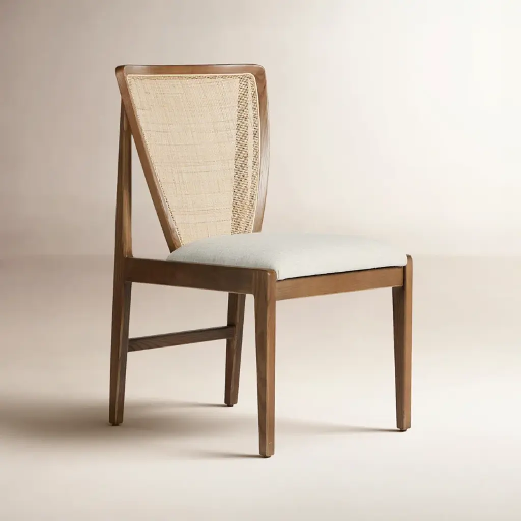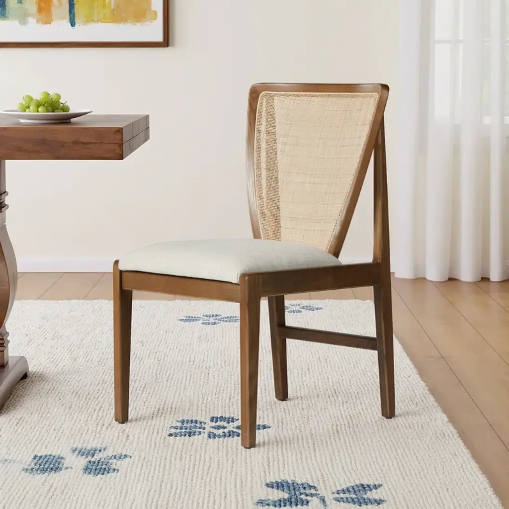 Warm ash and woven cane create a shield-style back. Cream high-performance fabric seat makes this midcentury-inspired piece perfect for everyday dining. High-performance fabrics are specially created to withstand spills, stains, high traffic and wear, ensuring long-term comfort and unmatched durability.