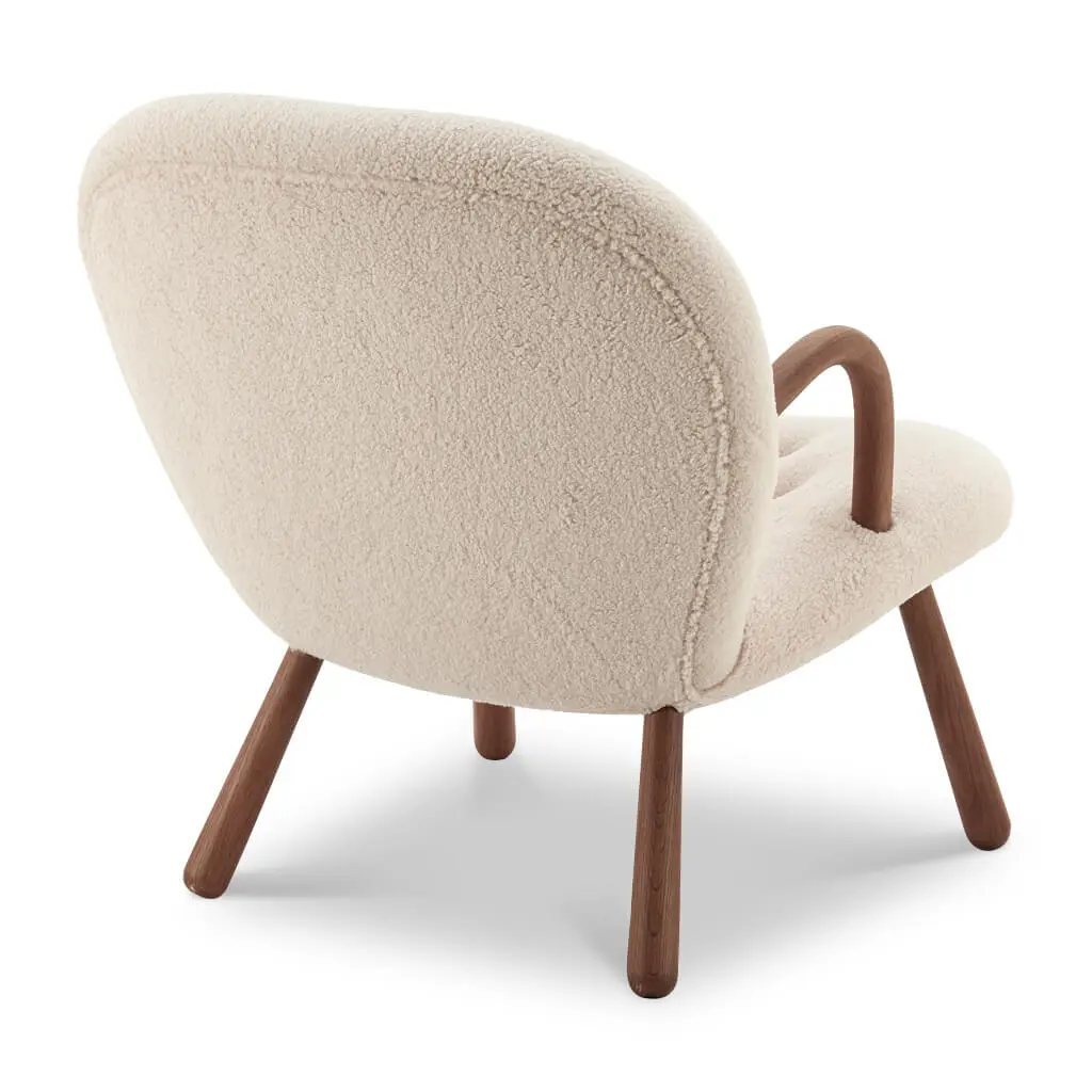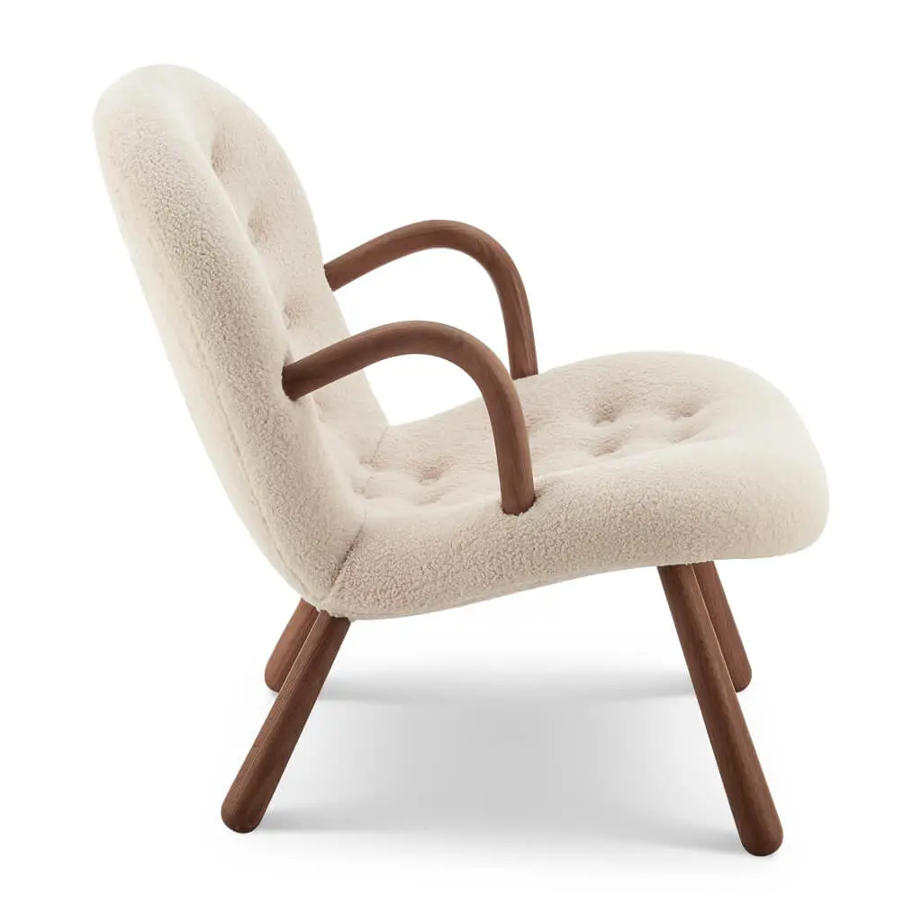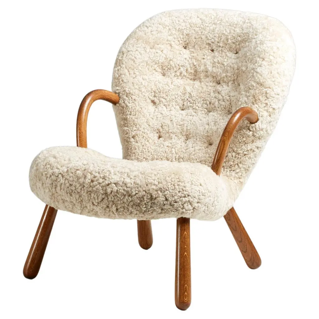 The Arctander Clam Chair, also known as the "Muslinge-Stolen", is easily recognized by its signature rounded arms, club-shaped legs, and curved, slightly tilted backrest upholstered in the finest sheepskin material. It exudes grace, comfort, and beauty, and is a piece that will effortlessly add a touch of elegance to any space.