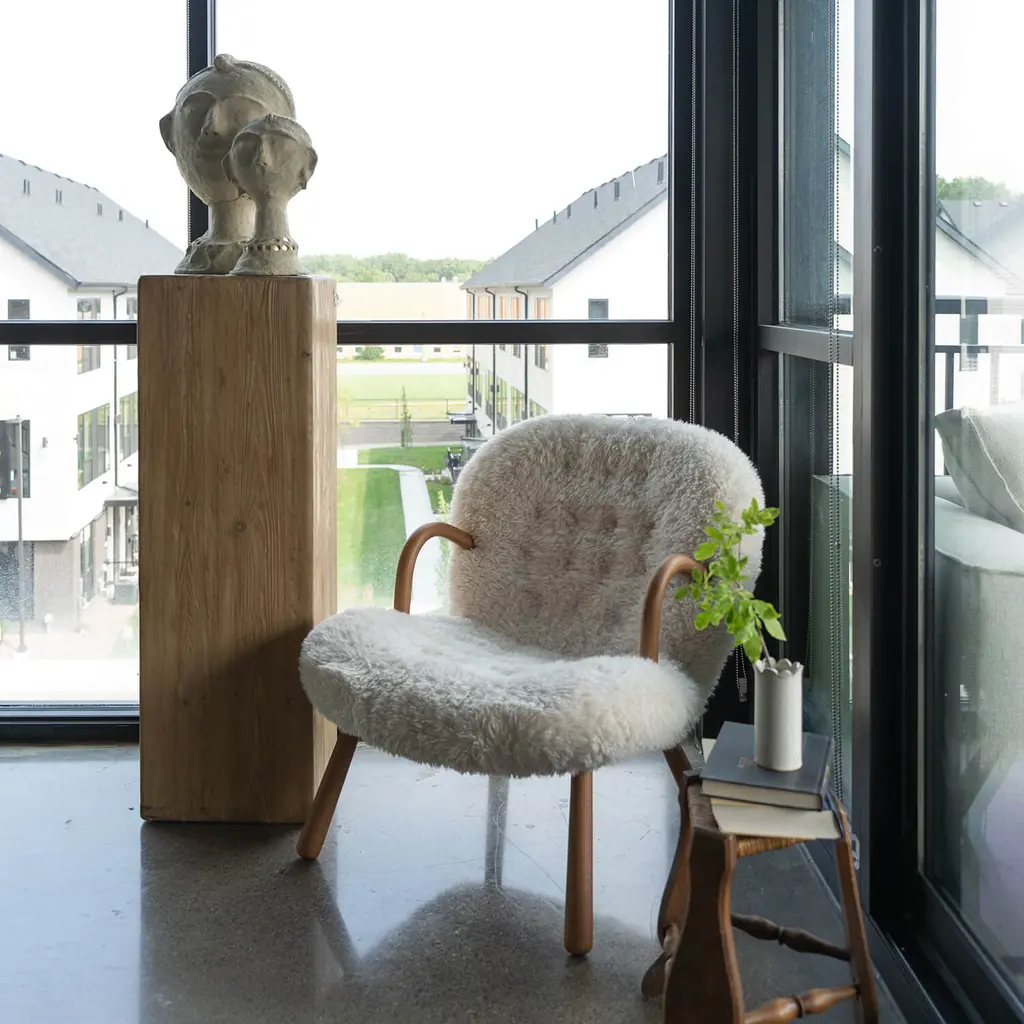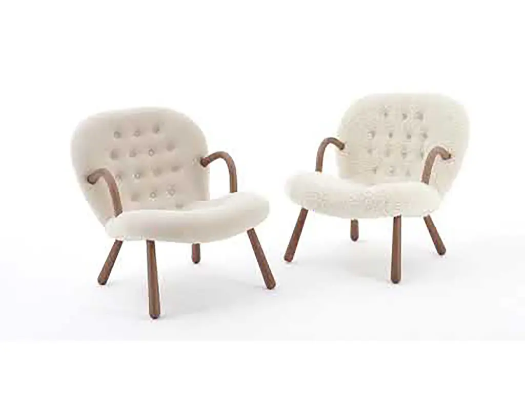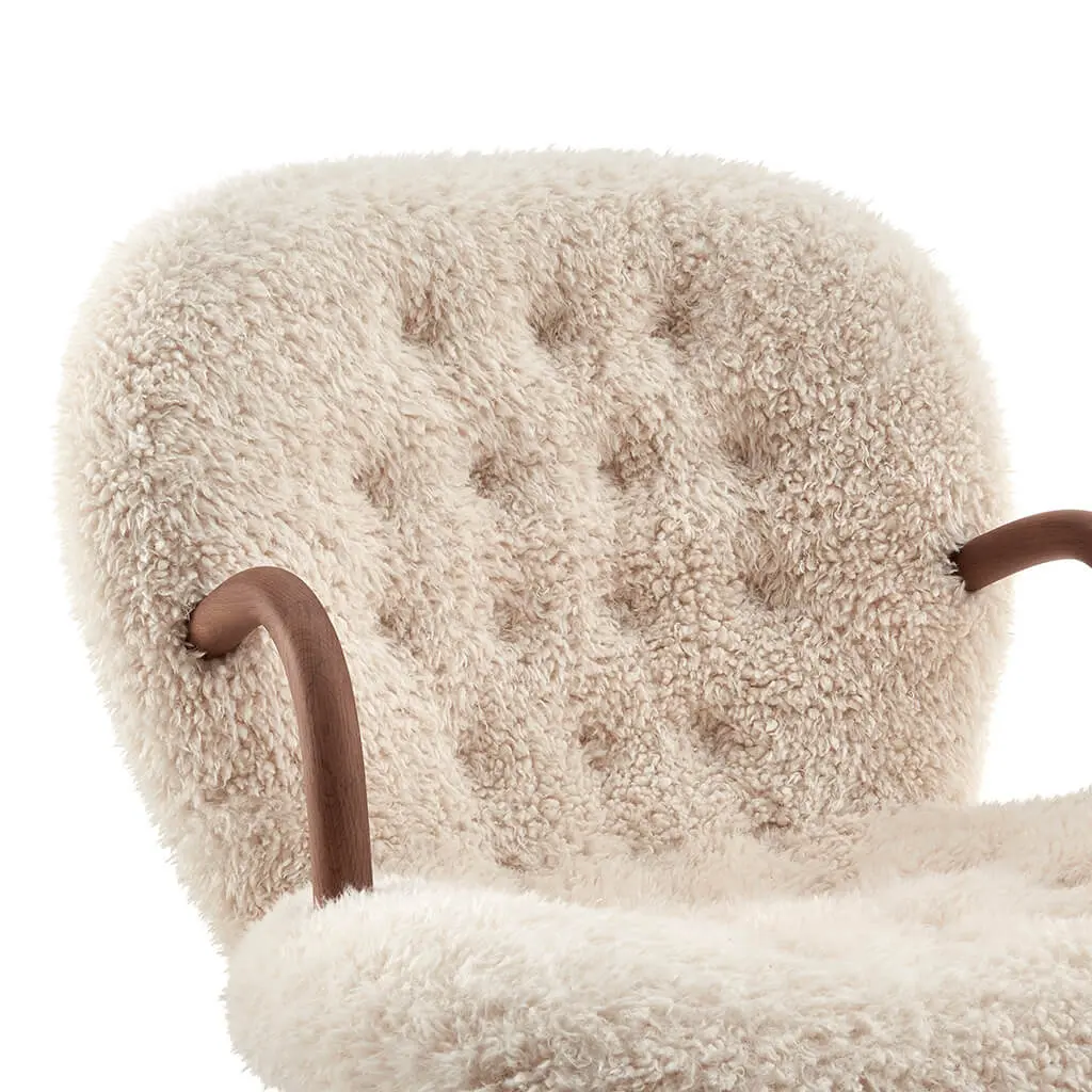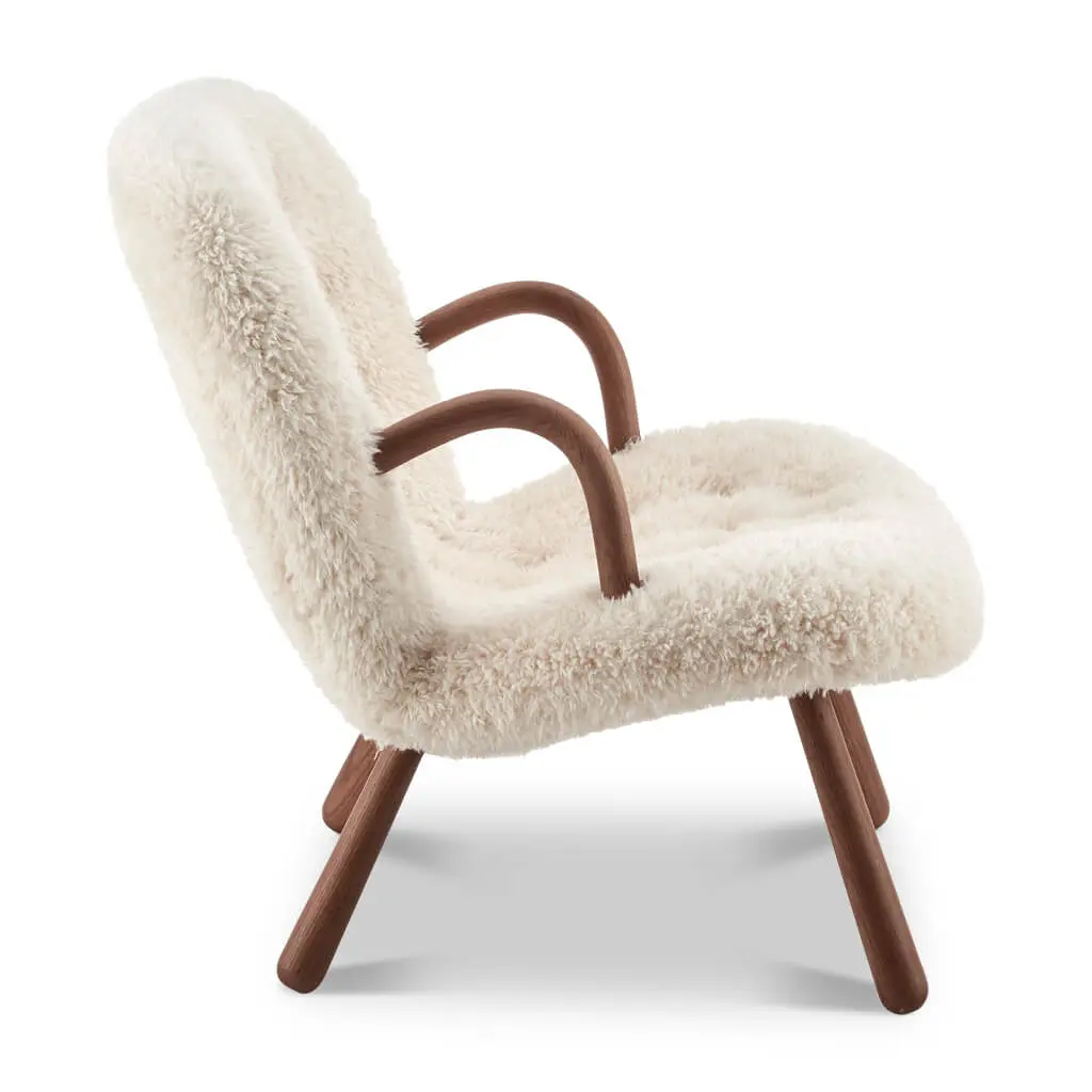 The Arctander Clam Chair, also known as the "Muslinge-Stolen", is easily recognized by its signature rounded arms, club-shaped legs, and curved, slightly tilted backrest upholstered in the finest sheepskin material. It exudes grace, comfort, and beauty, and is a piece that will effortlessly add a touch of elegance to any space.