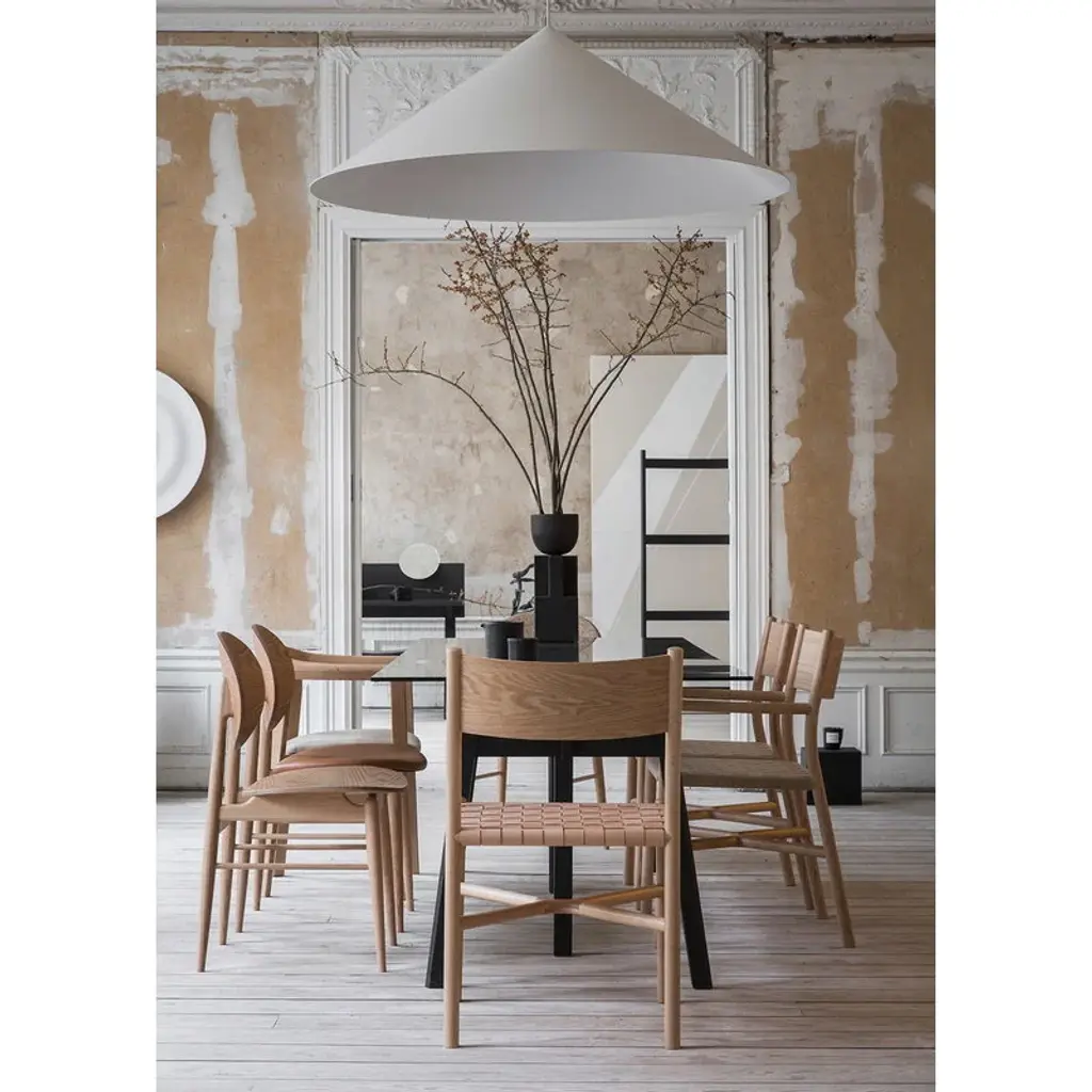 The Ariake arm chair beautifully combines Japanese and Scandinavian esthetics: the slightly curved backrest, pole-like legs and a crossed support structure add a touch of Japanese harmony and softness to the otherwise simple form typical of Scandinavian furniture. The natural shades and different seat options make Ariake, designed by Gabriel Tan, suitable for any interior.
