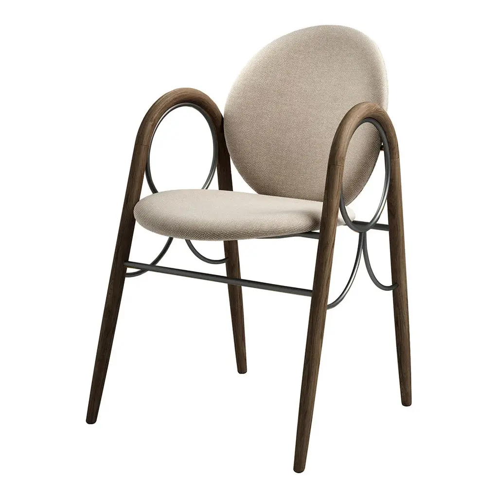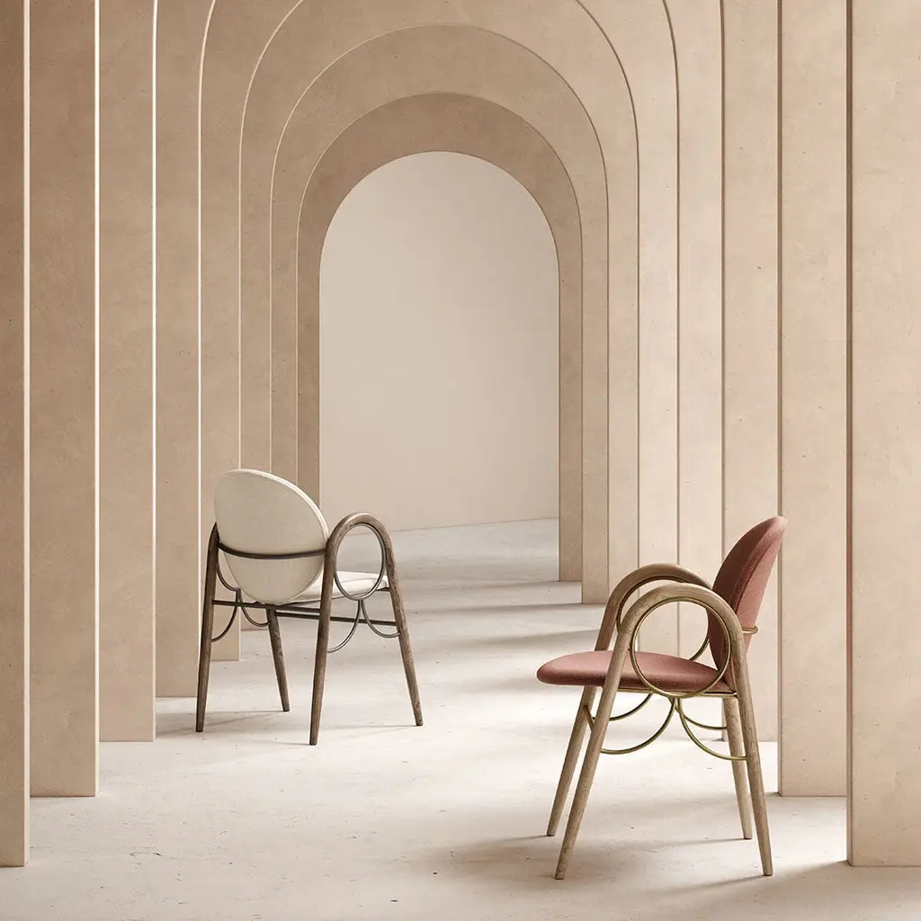 The Arkade Chair is a previously unreleased chair by Danish architect Nanna Ditzel, designed in 1983. The design exemplifies Ditzel's hallmark of elegant geometries and fondness for soft circular shapes, expressed with recurring arches, hence the name Arkade (the Danish word for Arcade), and a nod to classic architecture. The Arkade Chair unfolds wide possibilities for designers and architects, to work with a chair full of personality and materiality. True to Ditzel's love for decoration and colors, a wide spectrum of materials is available, including steam bend solid oak, metal finishes in brass, black oxide and chrome, as well as wood veneer seating or full upholstery in various textiles or leathers.