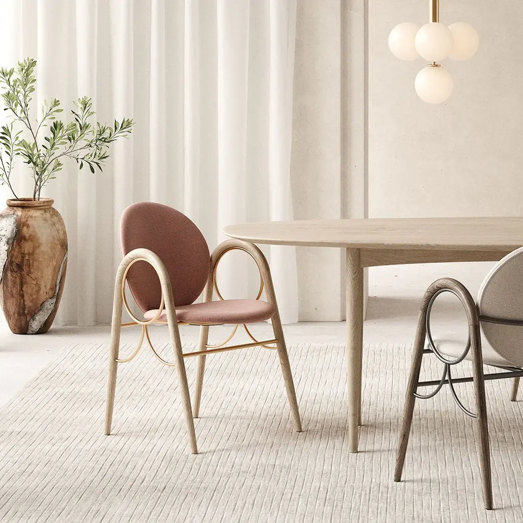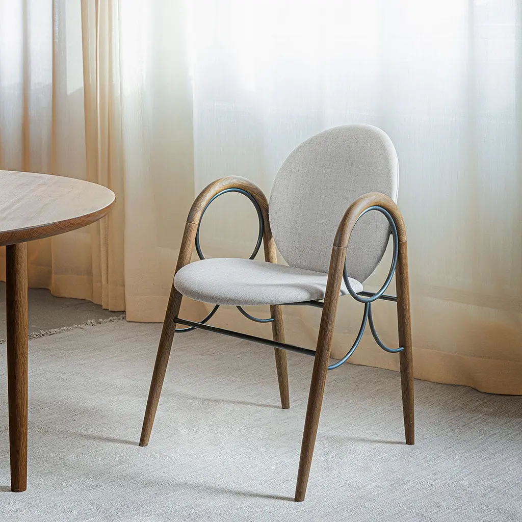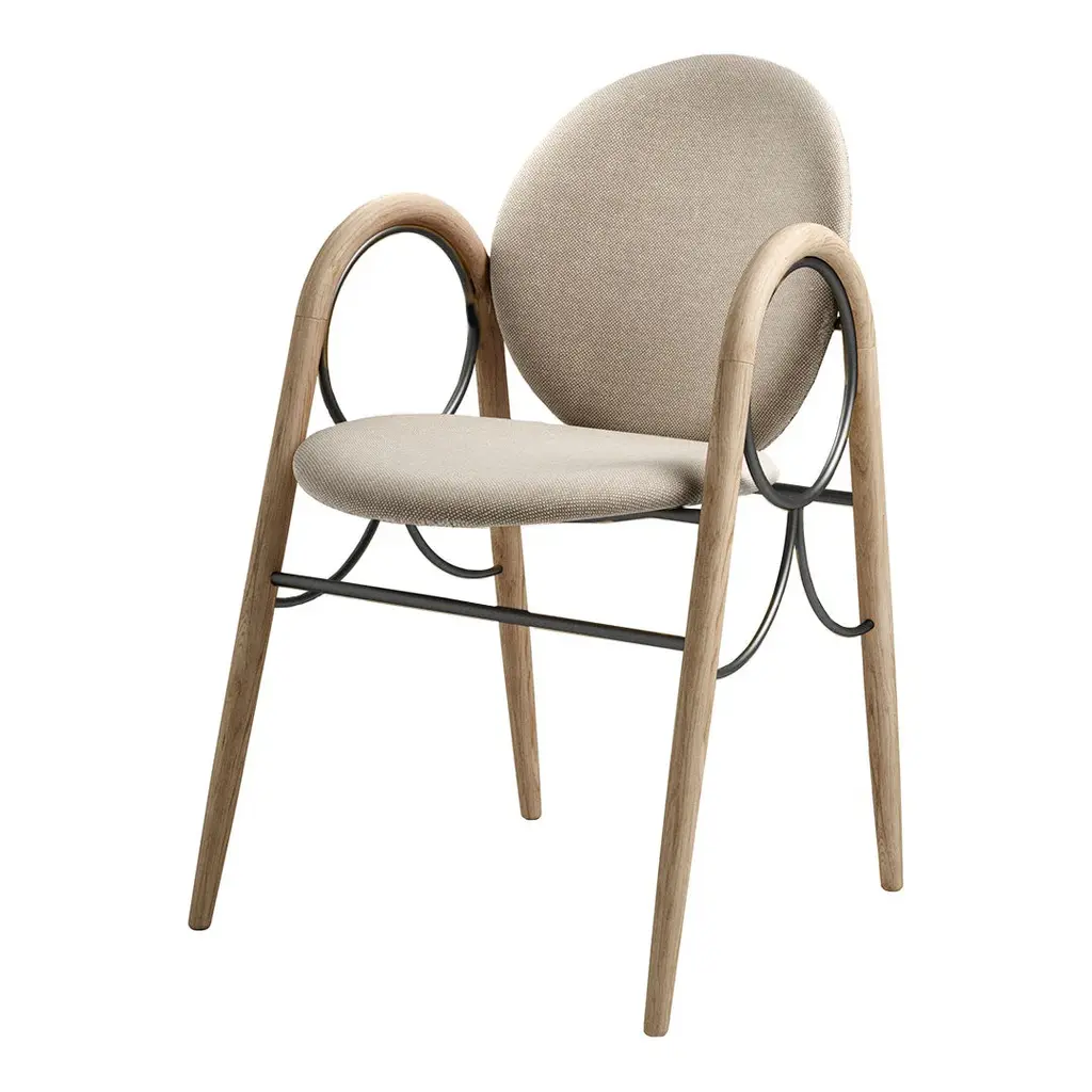 The Arkade Chair is a previously unreleased chair by Danish architect Nanna Ditzel, designed in 1983. The design exemplifies Ditzel's hallmark of elegant geometries and fondness for soft circular shapes, expressed with recurring arches, hence the name Arkade (the Danish word for Arcade), and a nod to classic architecture. The Arkade Chair unfolds wide possibilities for designers and architects, to work with a chair full of personality and materiality. True to Ditzel's love for decoration and colors, a wide spectrum of materials is available, including steam bend solid oak, metal finishes in brass, black oxide and chrome, as well as wood veneer seating or full upholstery in various textiles or leathers.