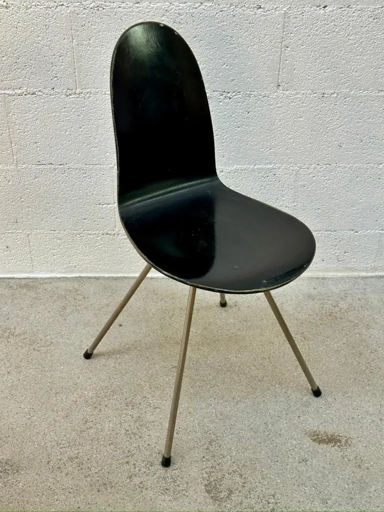 1955, Arne Jacobsen, tongue chair black lacquered in good patina condition. Jacobsen has designed a serie of chairs of plywood. Hammer, Butterfly, ant, mosquito and the tongue. This chair has been designed and manufactured in 1955 (FIRST EDITION) There are not as many of this chairs produced by Fritz Hansen as the other models, small production. The chair is marked Fritz Hansen in the metal cover. The colour is mat black (patina) as you can see on the picture. The legs are chrome-plated.Relay rare on the market trust me.Dimensions:Height: 31.11 in (79 cm)Width: 18.12 in (46 cm)Depth: 16.15 in (41 cm)Seat Height: 17.33 in (44 cm)