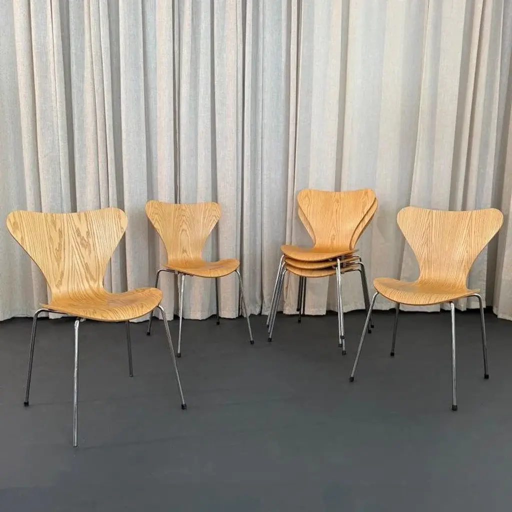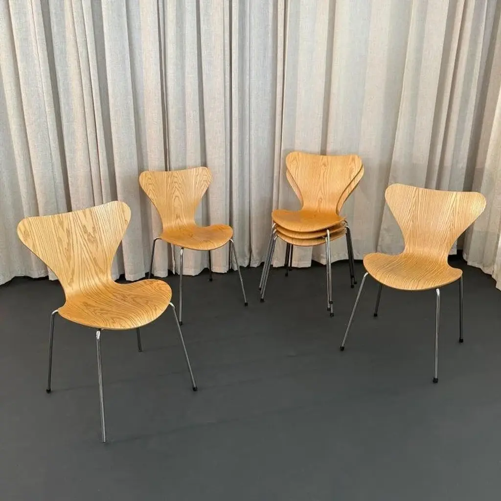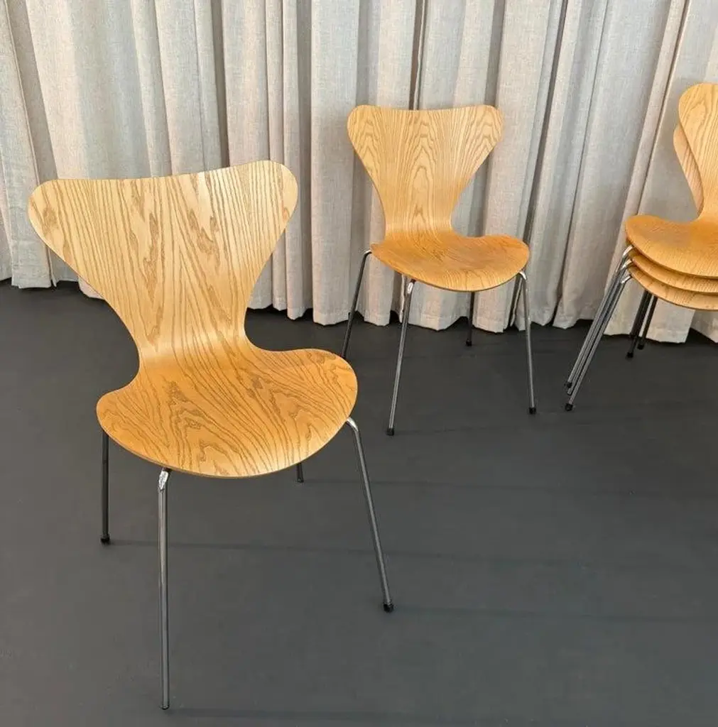 One of the most iconic Scandinavian Modern chairs is the "Series 7" chair that was designed by Arne Jacobsen in 1955 and manufactured by Fritz Hansen in Denmark. These chairs bear the Fritz Hansen label from 2011. The model no. 3107 Series 7 chair, also called the "Sevener", features a molded plywood shell in natural ash with slim tubular steel legs that complement the shell’s curved profile. The chairs are lightweight and can easily be stacked for storage. Since its debut in 1955 the Series 7 chair increases in popularity due to its simplicity, versatility, and now iconic silhouette. Arne Jacobsen was a Danish architect and designer. Most of the furniture he designed was proprietary to the buildings he was currently working on with the exception of the Series 7 chairs which has ironically been used in more public spaces than any of his other designs.