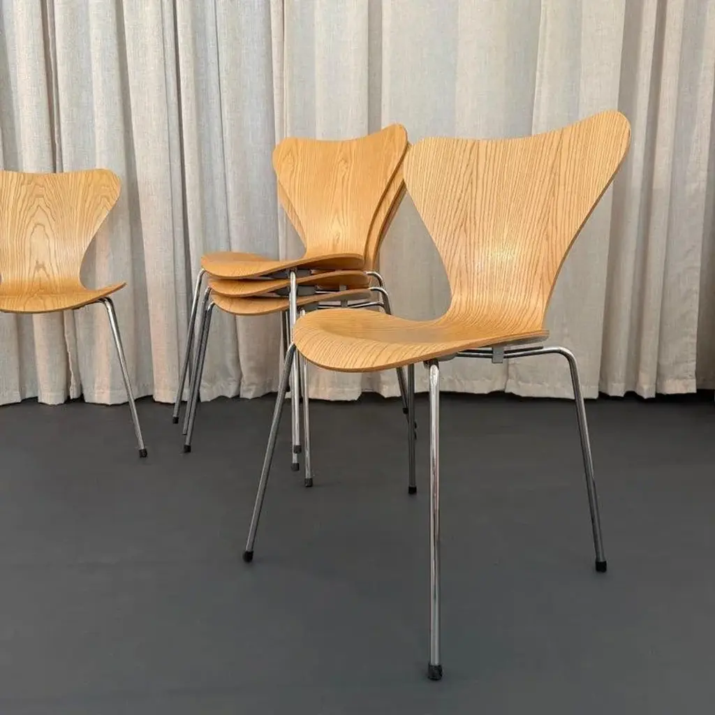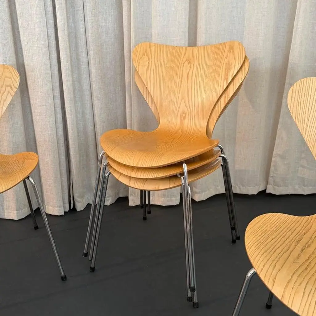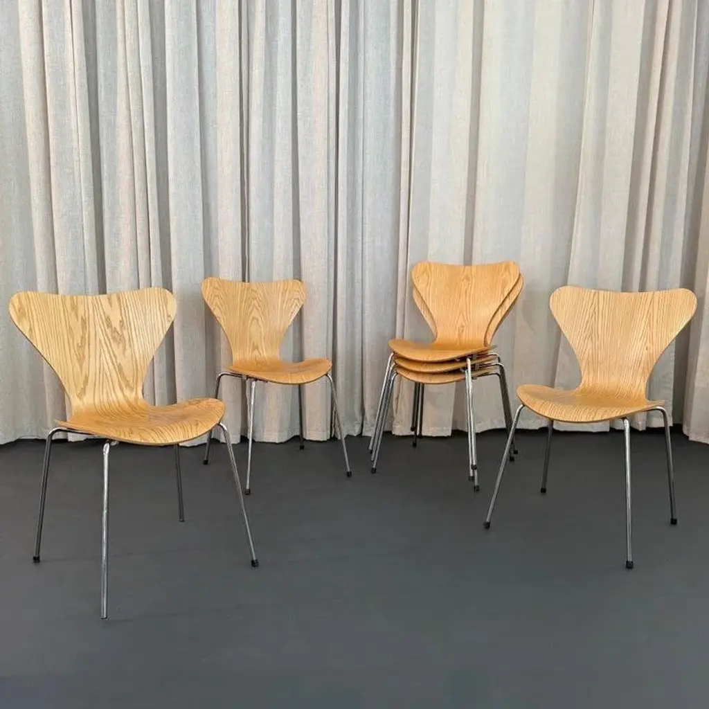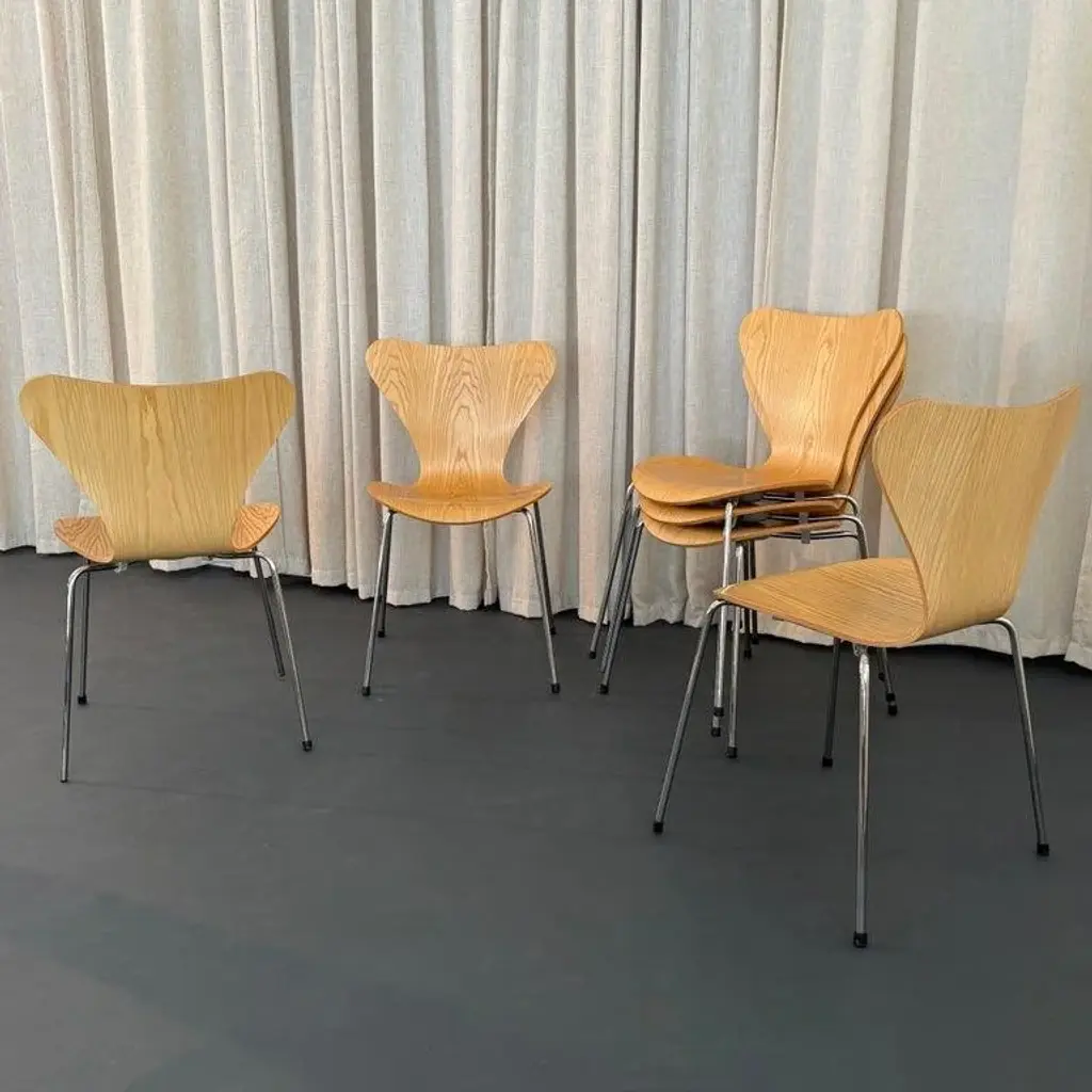 One of the most iconic Scandinavian Modern chairs is the "Series 7" chair that was designed by Arne Jacobsen in 1955 and manufactured by Fritz Hansen in Denmark. These chairs bear the Fritz Hansen label from 2011. The model no. 3107 Series 7 chair, also called the "Sevener", features a molded plywood shell in natural ash with slim tubular steel legs that complement the shell’s curved profile. The chairs are lightweight and can easily be stacked for storage. Since its debut in 1955 the Series 7 chair increases in popularity due to its simplicity, versatility, and now iconic silhouette. Arne Jacobsen was a Danish architect and designer. Most of the furniture he designed was proprietary to the buildings he was currently working on with the exception of the Series 7 chairs which has ironically been used in more public spaces than any of his other designs.
