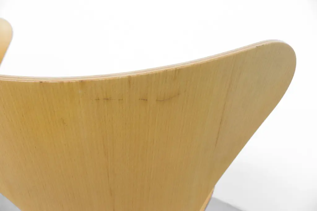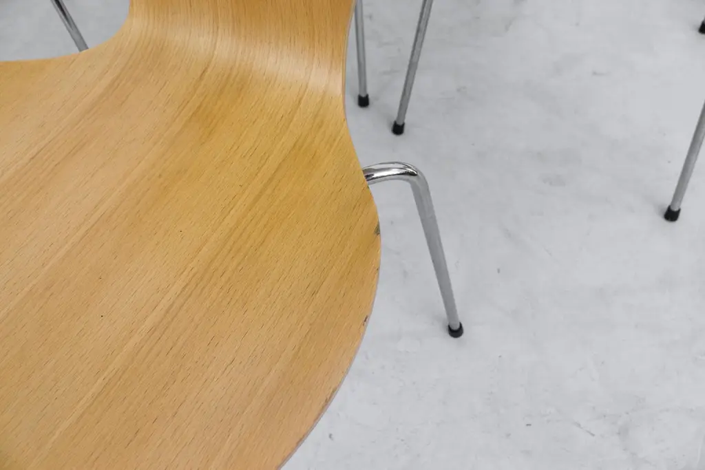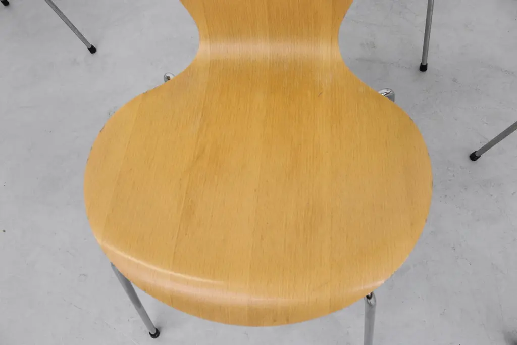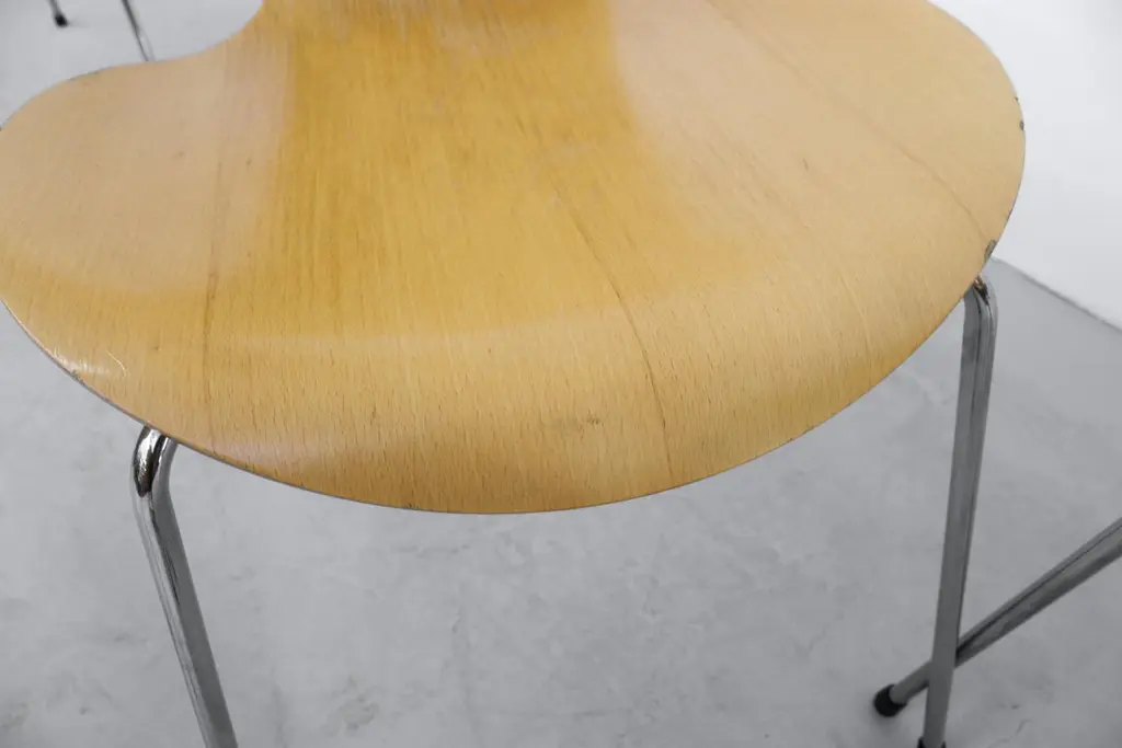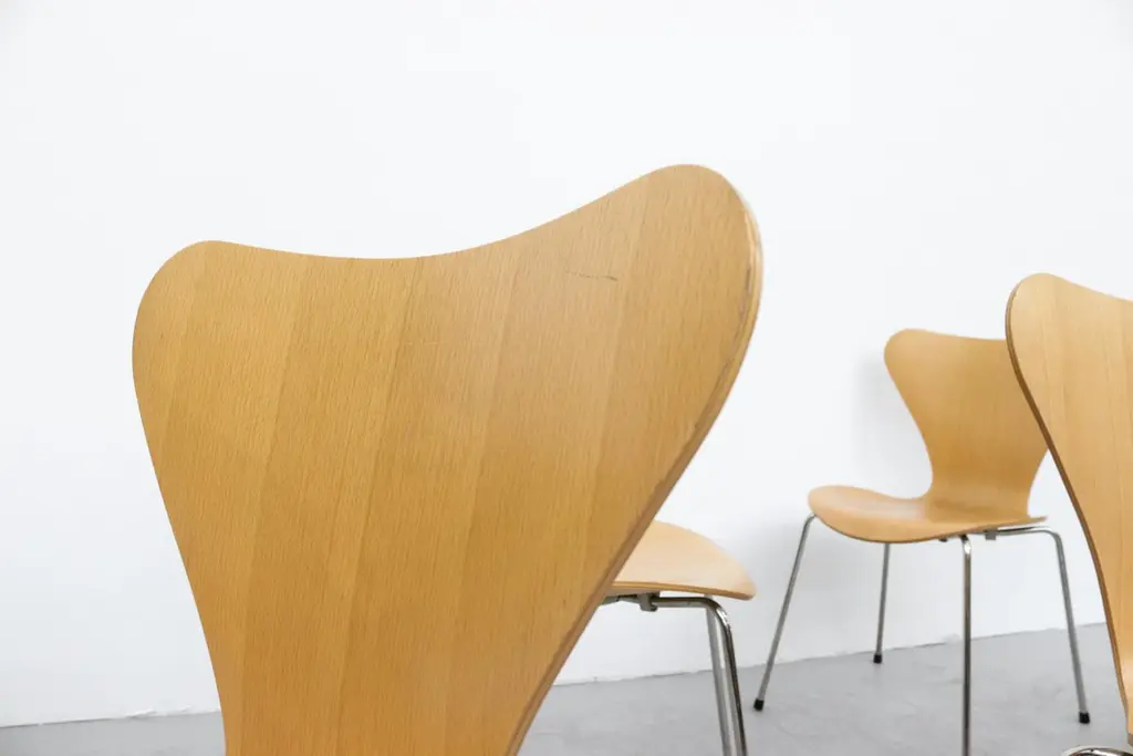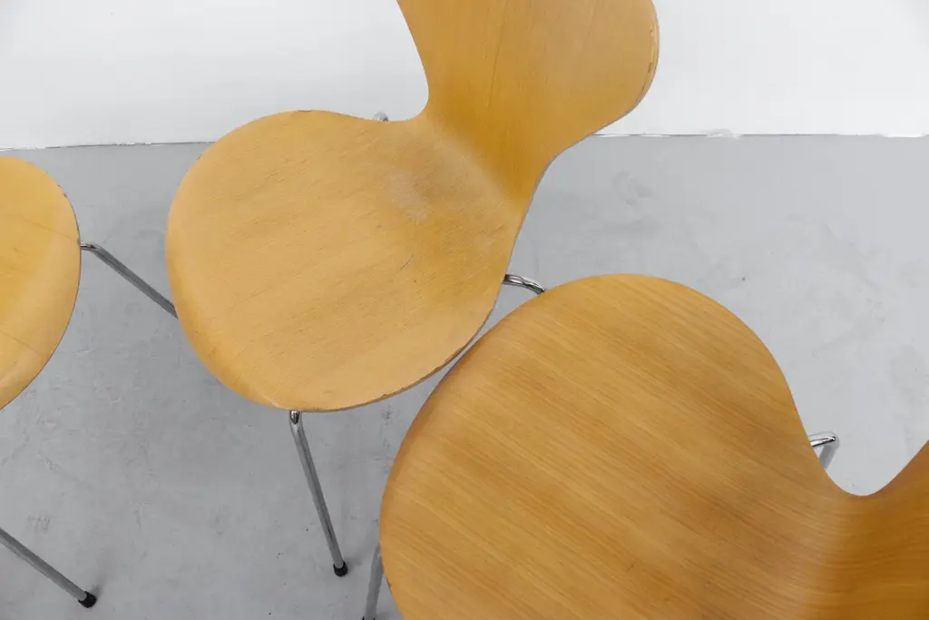 Arne Jacobsen 'Series 7' natural beech wood stacking chairs for Fritz Hansen. Seats made of pressure-molded Beech atop chrome frames. In original condition with visible wear, consistent with age and use. One chair is slightly taller than the rest. Condition may vary from photos. Sold individually.