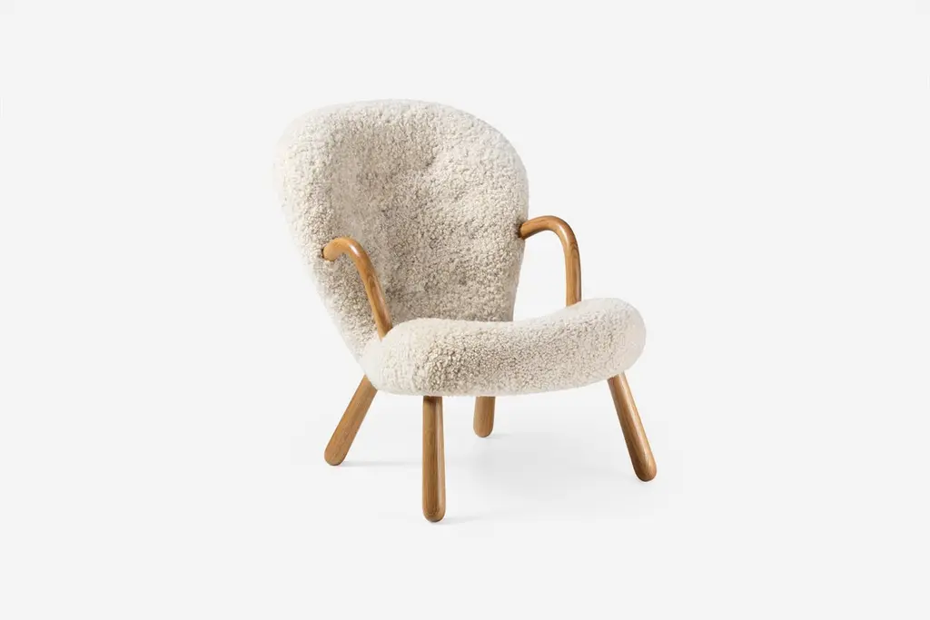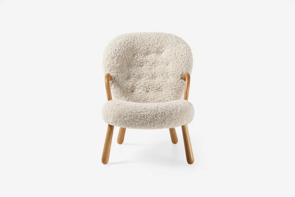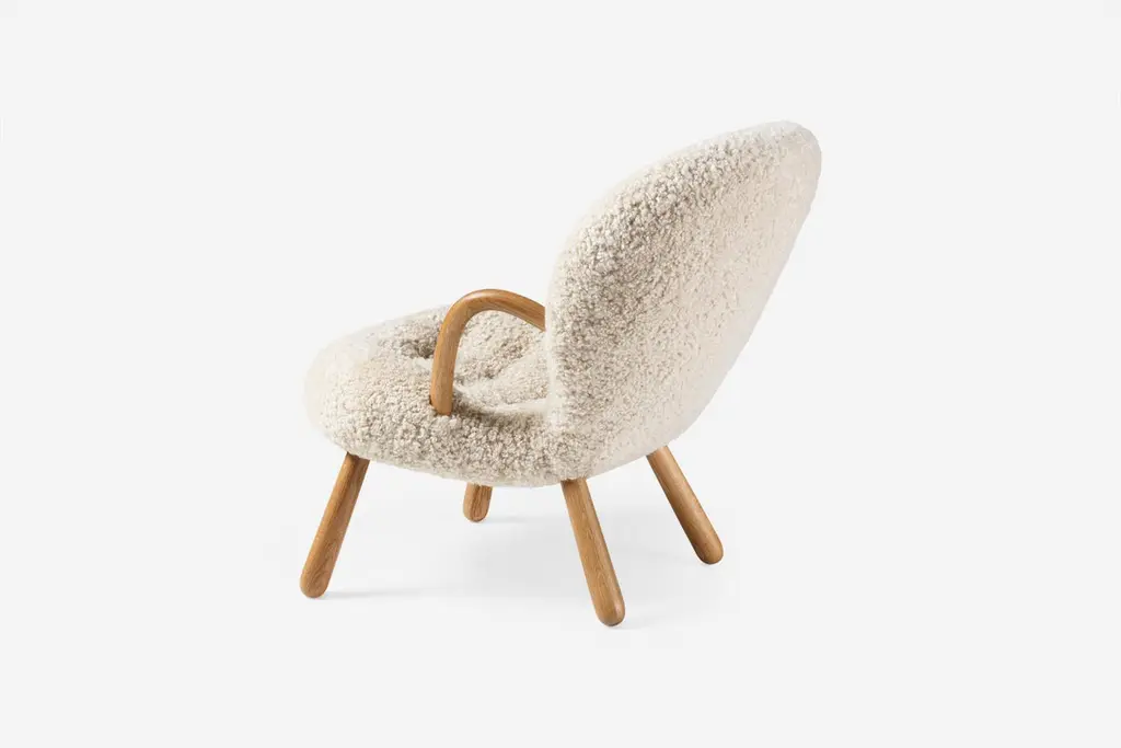 Official Re-Edition of the iconic Clam Chair & Stool by Arnold Madsen.The Clam Chair was designed in 1944 in Copenhagen by Danish upholsterer Arnold Madsen. In 1945 Arnold founded the furniture company Madsen & Schubell together with cabinetmaker Henry Schubell in order to produce this unique chair that became known in Danish as the: 'Muslingstol' (Clam Chair), due to its unique shape. This new edition has been crafted using a blend of traditional joinery techniques and modern technology, resulting in an authentic product of the highest quality. Dagmar is proud to re-launch this icon of the Danish Modern movement in collaboration with the estate of Arnold Madsen. The Clam Chair is available in a wide range of upholstery and wood finishes. Example Shown: Moonlight Sheepskin + Oiled Oak. Height: 82cm (32.3”)Depth: 80cm (31.5”)Width: 65cm (25.6”)Seat Height: 42cm (16.5")