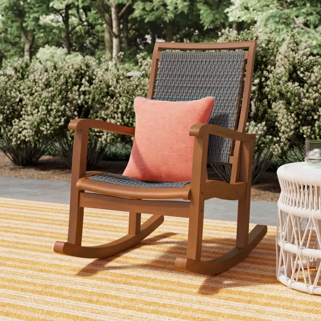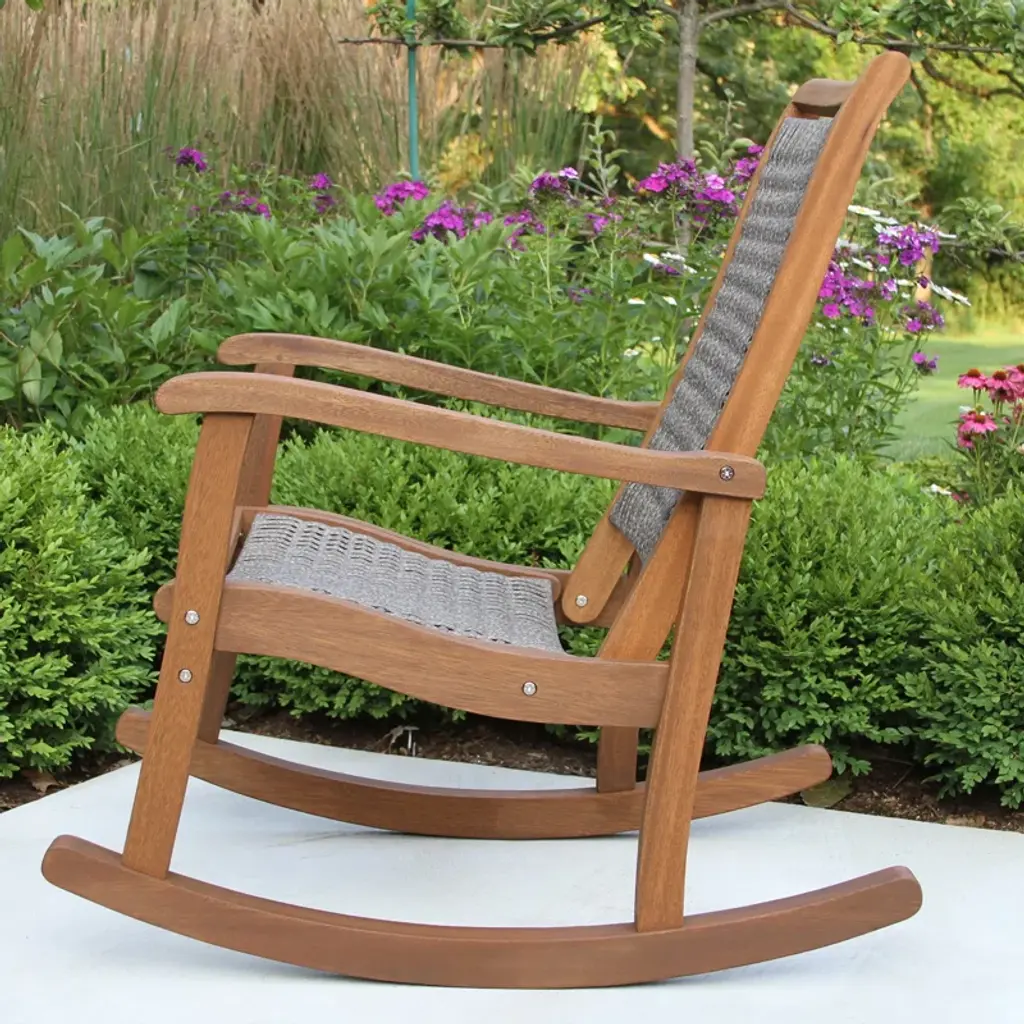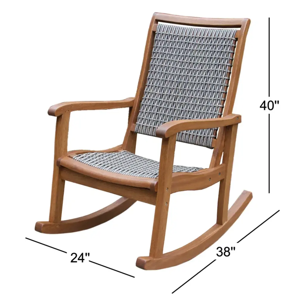 Welcome quiet mornings and pleasant evenings while relaxing in this rocking chair. Designed for use outside, it is crafted from weather- and UV-resistant solid eucalyptus wood with a warm, neutral finish. The seat and back are a resin wicker weave that offers natural ventilation and, as water can’t pool, are quick drying after a light rain shower.