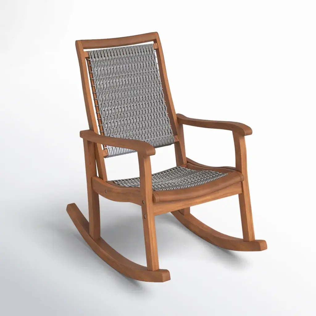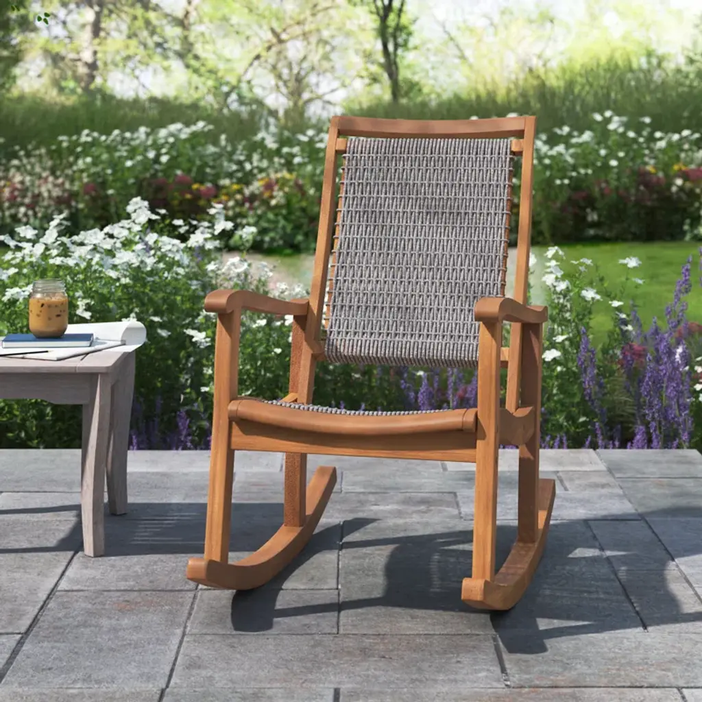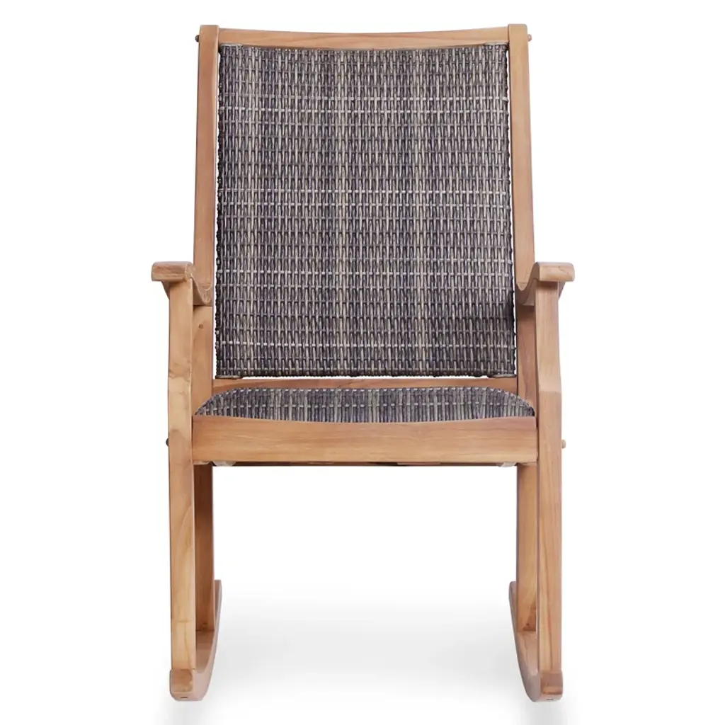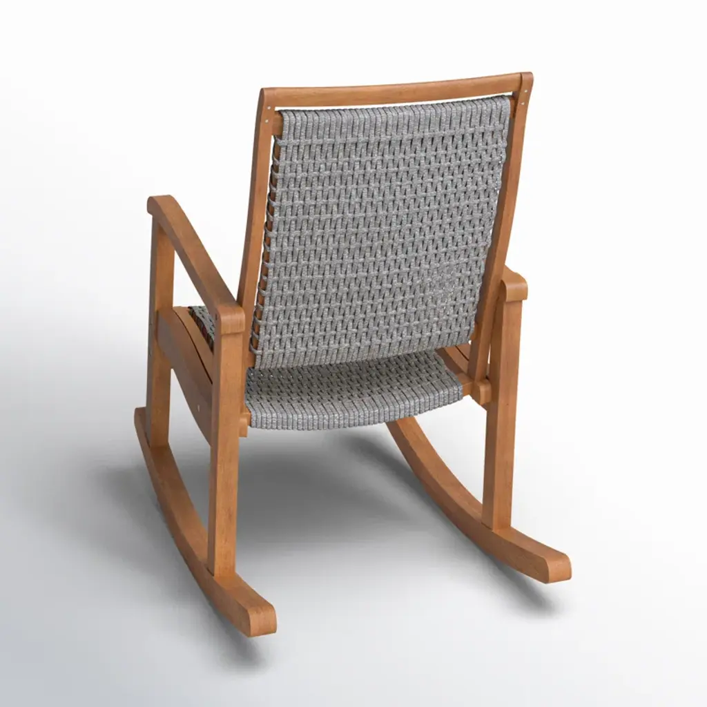 Welcome quiet mornings and pleasant evenings while relaxing in this rocking chair. Designed for use outside, it is crafted from weather- and UV-resistant solid eucalyptus wood with a warm, neutral finish. The seat and back are a resin wicker weave that offers natural ventilation and, as water can’t pool, are quick drying after a light rain shower.