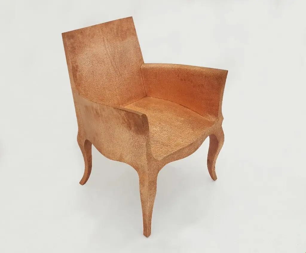 Introducing the Art Deco Chairs, a stunning Art Deco Chairs set designed by the renowned Paul Mathieu for Stephanie Odegard. This elegant Art Deco Chair duo boasts a unique curved profile that exudes a sophisticated and timeless charm, making it the perfect addition to any modern or classic interior.Crafted with utmost care and attention to detail, these Art Deco Chairs are made to order and are available in twelve metal clad finishes, ensuring that you can choose the perfect one to match your individual style and taste. The use of high-quality materials and expert craftsmanship ensure that each Art Deco Chair is not only beautiful but also a true piece of art.The curved legs and side arms of this Art Deco Chair are hand carved from solid pieces of teak. Pattern makers trace and cut complex forms that will cover the chair in a skin of copper, white bronze, brass or antiqued white bronze The metal finishes will tarnish over time. Regular non-abrasive household metal polishes can be used to restore the original luster.Overall, if you're looking for a piece of furniture that combines luxury, comfort, and style, then the Art Deco Chairs is an excellent choice. With its distinctive curved profile and multiple finish options, this Chair set is sure to elevate the look of any room it is placed in, and be a beloved addition to your home for years to come.The images shown in this listing are shot in different lighting conditions and/or are 3D illustrations. We encourage our customers to please request a sample or a full sample set of 12 finishes so that they can experience the finish first hand. Art Deco Chairs Mid Hammered in Copper by Paul MathieuSize- 26"x 27"x 33"HMaterials - Copper, Metal sheet, Teak, Wood, MetalTechniques: Hand-Crafted, Hand-Carved, Metal Work, Wood Work, Metal Wrapping, PolishedPlease note that moisture in air, sudden change in temperature and natural movement of wood over time causes the metal to wrinkle or bubble up. We use well seasoned, reclaimed teak and high quality marine grade MDF (wherever technically possible) to avoid and delay the mentioned changes. However a perfect stability of metal cannot be guaranteed. Please note that our smooth finish metal clad pieces will have some unavoidable tool marks. This is proof that everything is done by hand. The smooth finish will not come out like a machine made perfect surface and the master artisan will do their best to make it look as good/clean/stable/perfect as he possibly can.The antique white bronze finish is hand done by using an acidic chemical over the white bronze finish to recreate a natural patination. Like with the natural patination of silver, copper, or brass, the final result and color uniformity of the patina cannot be guaranteed. The goal of this finish is to achieve rainbow-like shades with dull, shiny, cloudy, and streaky patches to give an illusion of antiquing. Please note:None of our metal clad pieces are treated with a protective “finish” thus enabling the items to age naturally over time. We will of course polish them well before we pack them. a) Copper oxidizes faster than the other metals. In six to twelve months it will most likely lose its shine and will gradually turn to different shades of brown and/or green/blue. This aging process and its effect is referred to as verdigris. After a year the piece should not change much more. Copper does not rust, but does require periodic cleaning in order to retain its original shine if that the preferred option. ('BRASSO' or any known copper polish can be used to polish copper).b) Brass retains its shine for far longer than others, but will tarnish if not cleaned on occasion. ('BRASSO' is made to polish brass).c) White bronze, has the least tendency to show age or tarnish. If kept in a controlled climate, this metal will hold its shine for years. It can be cleaned with a cleanser and polished with a cloth. d) The antiqued white bronze finish will react with the natural elements the fastest in the beginning but it too will stop reacting and will settle down in a stable state like copper after 6-12 months. Since it is already antiqued and looked like it is tarnished, as described in an earlier message, this fast reaction will not change the over all look. In that way this surface is most forgiving. The images shown in this listing are shot in different lighting conditions and/or are 3D illustrations. We encourage our customers to please request a sample or a full sample set of 12 finishes so that they can experience the finish first hand.