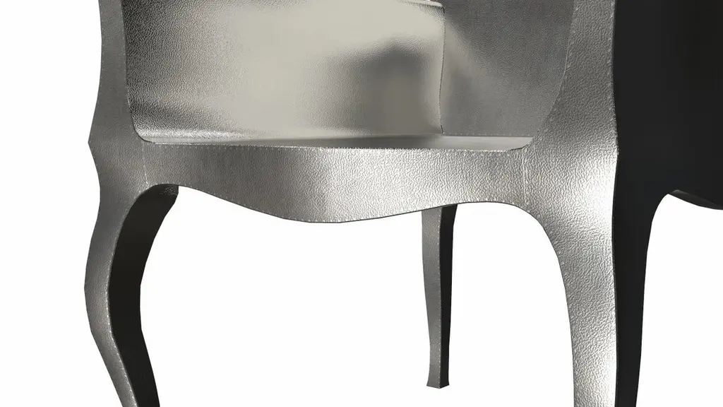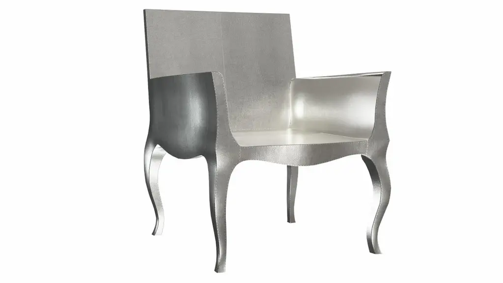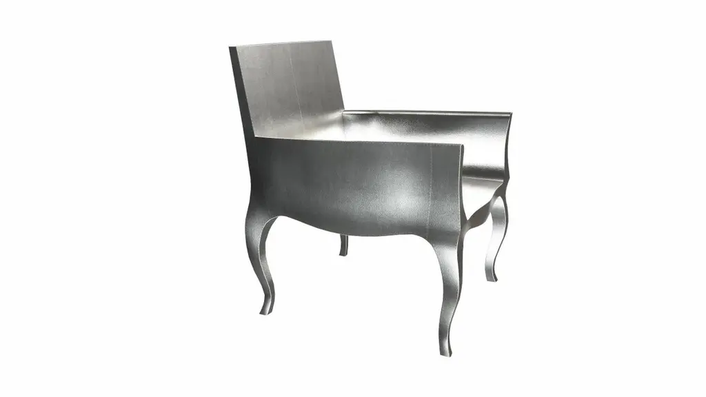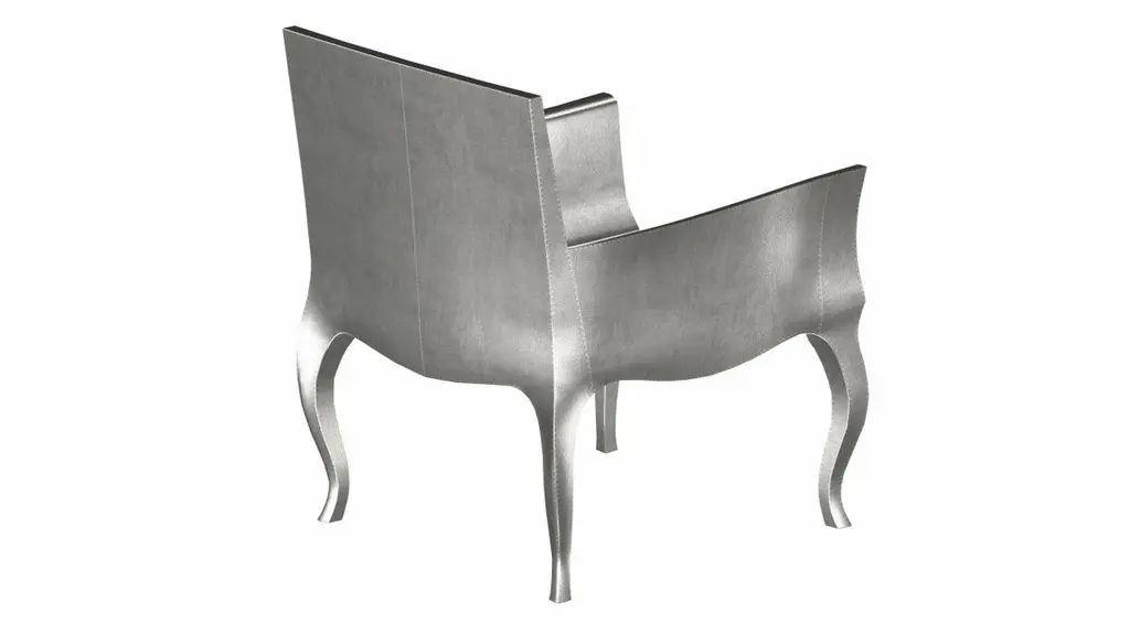 Introducing the Art Deco Chairs, a stunning Art Deco Chairs set designed by the renowned Paul Mathieu for Stephanie Odegard. This elegant Art Deco Chair duo boasts a unique curved profile that exudes a sophisticated and timeless charm, making it the perfect addition to any modern or classic interior.Crafted with utmost care and attention to detail, these Art Deco Chairs are made to order and are available in twelve metal clad finishes, ensuring that you can choose the perfect one to match your individual style and taste. The use of high-quality materials and expert craftsmanship ensure that each Art Deco Chair is not only beautiful but also a true piece of art.The curved legs and side arms of this Art Deco Chair are hand carved from solid pieces of teak. Pattern makers trace and cut complex forms that will cover the chair in a skin of copper, white bronze, brass or antiqued white bronze The metal finishes will tarnish over time. Regular non-abrasive household metal polishes can be used to restore the original luster.Overall, if you're looking for a piece of furniture that combines luxury, comfort, and style, then the Art Deco Chairs is an excellent choice. With its distinctive curved profile and multiple finish options, this Chair set is sure to elevate the look of any room it is placed in, and be a beloved addition to your home for years to come.The images shown in this listing are shot in different lighting conditions and/or are 3D illustrations. We encourage our customers to please request a sample or a full sample set of 12 finishes so that they can experience the finish first hand. Art Deco Club Chairs Designed by Paul Mathieu for Stephanie OdegardSize- 26"x 27"x 33"HMaterials - White Bronze Metal sheet, Teak, Wood, MetalTechniques: Hand-Crafted, Hand-Carved, Metal Work, Wood Work, Metal Wrapping, PolishedPlease note that moisture in air, sudden change in temperature and natural movement of wood over time causes the metal to wrinkle or bubble up. We use well seasoned, reclaimed teak and high quality marine grade MDF (wherever technically possible) to avoid and delay the mentioned changes. However a perfect stability of metal cannot be guaranteed. Please note that our smooth finish metal clad pieces will have some unavoidable tool marks. This is proof that everything is done by hand. The smooth finish will not come out like a machine made perfect surface and the master artisan will do their best to make it look as good/clean/stable/perfect as he possibly can.The antique white bronze finish is hand done by using an acidic chemical over the white bronze finish to recreate a natural patination. Like with the natural patination of silver, copper, or brass, the final result and color uniformity of the patina cannot be guaranteed. The goal of this finish is to achieve rainbow-like shades with dull, shiny, cloudy, and streaky patches to give an illusion of antiquing. Please note:None of our metal clad pieces are treated with a protective “finish” thus enabling the items to age naturally over time. We will of course polish them well before we pack them. a) Copper oxidizes faster than the other metals. In six to twelve months it will most likely lose its shine and will gradually turn to different shades of brown and/or green/blue. This aging process and its effect is referred to as verdigris. After a year the piece should not change much more. Copper does not rust, but does require periodic cleaning in order to retain its original shine if that the preferred option. ('BRASSO' or any known copper polish can be used to polish copper).b) Brass retains its shine for far longer than others, but will tarnish if not cleaned on occasion. ('BRASSO' is made to polish brass).c) White bronze, has the least tendency to show age or tarnish. If kept in a controlled climate, this metal will hold its shine for years. It can be cleaned with a cleanser and polished with a cloth. d) The antiqued white bronze finish will react with the natural elements the fastest in the beginning but it too will stop reacting and will settle down in a stable state like copper after 6-12 months. Since it is already antiqued and looked like it is tarnished, as described in an earlier message, this fast reaction will not change the over all look. In that way this surface is most forgiving. The images shown in this listing are shot in different lighting conditions and/or are 3D illustrations. We encourage our customers to please request a sample or a full sample set of 12 finishes so that they can experience the finish first hand.