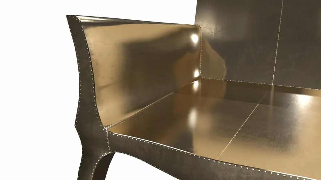Introducing the Art Deco Chairs, a stunning Art Deco Chairs set designed by the renowned Paul Mathieu for Stephanie Odegard. This elegant Art Deco Chair duo boasts a unique curved profile that exudes a sophisticated and timeless charm, making it the perfect addition to any modern or classic interior.Crafted with utmost care and attention to detail, these Art Deco Chairs are made to order and are available in twelve metal clad finishes, ensuring that you can choose the perfect one to match your individual style and taste. The use of high-quality materials and expert craftsmanship ensure that each Art Deco Chair is not only beautiful but also a true piece of art.The curved legs and side arms of this Art Deco Chair are hand carved from solid pieces of teak. Pattern makers trace and cut complex forms that will cover the chair in a skin of copper, white bronze, brass or antiqued white bronze The metal finishes will tarnish over time. Regular non-abrasive household metal polishes can be used to restore the original luster.Overall, if you're looking for a piece of furniture that combines luxury, comfort, and style, then the Art Deco Chairs is an excellent choice. With its distinctive curved profile and multiple finish options, this Chair set is sure to elevate the look of any room it is placed in, and be a beloved addition to your home for years to come.The images shown in this listing are shot in different lighting conditions and/or are 3D illustrations. We encourage our customers to please request a sample or a full sample set of 12 finishes so that they can experience the finish first hand. Art Deco Club Chairs in Smooth Brass by Paul Mathieu for Stephanie OdegardSize- 26"x 27"x 33"HMaterials - Brass, Metal sheet, Teak, Wood, MetalTechniques: Hand-Crafted, Hand-Carved, Metal Work, Wood Work, Metal Wrapping, PolishedPlease note that moisture in air, sudden change in temperature and natural movement of wood over time causes the metal to wrinkle or bubble up. We use well seasoned, reclaimed teak and high quality marine grade MDF (wherever technically possible) to avoid and delay the mentioned changes. However a perfect stability of metal cannot be guaranteed. Please note that our smooth finish metal clad pieces will have some unavoidable tool marks. This is proof that everything is done by hand. The smooth finish will not come out like a machine made perfect surface and the master artisan will do their best to make it look as good/clean/stable/perfect as he possibly can.The antique white bronze finish is hand done by using an acidic chemical over the white bronze finish to recreate a natural patination. Like with the natural patination of silver, copper, or brass, the final result and color uniformity of the patina cannot be guaranteed. The goal of this finish is to achieve rainbow-like shades with dull, shiny, cloudy, and streaky patches to give an illusion of antiquing. Please note:None of our metal clad pieces are treated with a protective “finish” thus enabling the items to age naturally over time. We will of course polish them well before we pack them. a) Copper oxidizes faster than the other metals. In six to twelve months it will most likely lose its shine and will gradually turn to different shades of brown and/or green/blue. This aging process and its effect is referred to as verdigris. After a year the piece should not change much more. Copper does not rust, but does require periodic cleaning in order to retain its original shine if that the preferred option. ('BRASSO' or any known copper polish can be used to polish copper).b) Brass retains its shine for far longer than others, but will tarnish if not cleaned on occasion. ('BRASSO' is made to polish brass).c) White bronze, has the least tendency to show age or tarnish. If kept in a controlled climate, this metal will hold its shine for years. It can be cleaned with a cleanser and polished with a cloth. d) The antiqued white bronze finish will react with the natural elements the fastest in the beginning but it too will stop reacting and will settle down in a stable state like copper after 6-12 months. Since it is already antiqued and looked like it is tarnished, as described in an earlier message, this fast reaction will not change the over all look. In that way this surface is most forgiving. The images shown in this listing are shot in different lighting conditions and/or are 3D illustrations. We encourage our customers to please request a sample or a full sample set of 12 finishes so that they can experience the finish first hand.