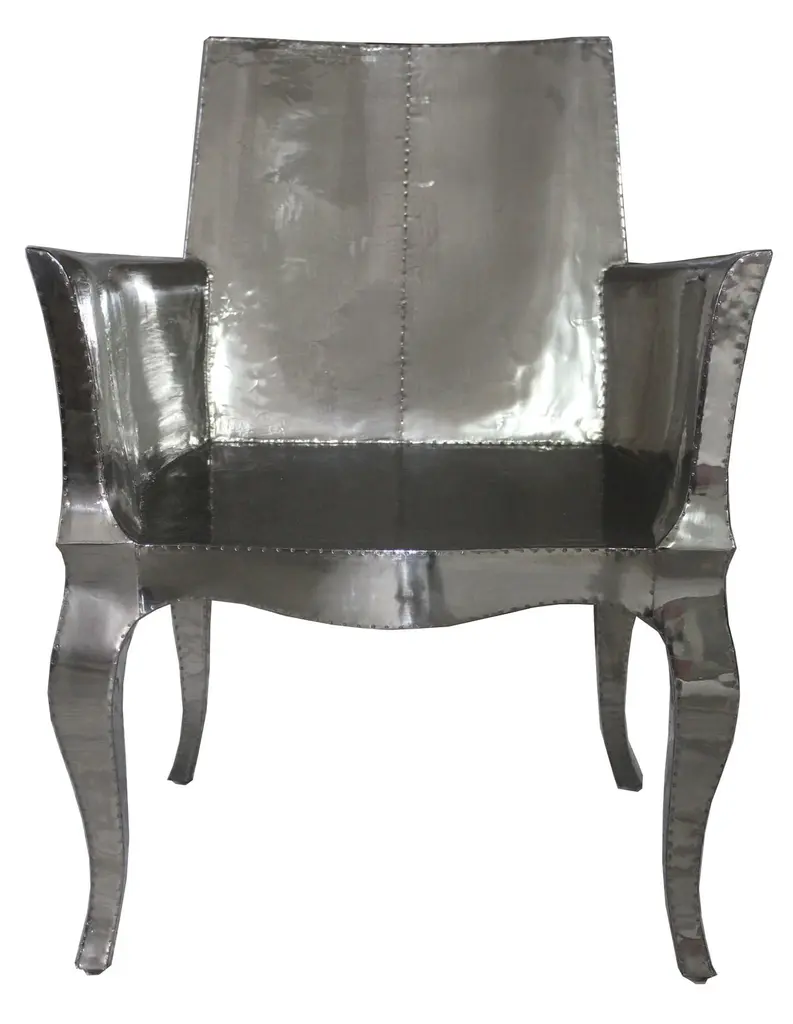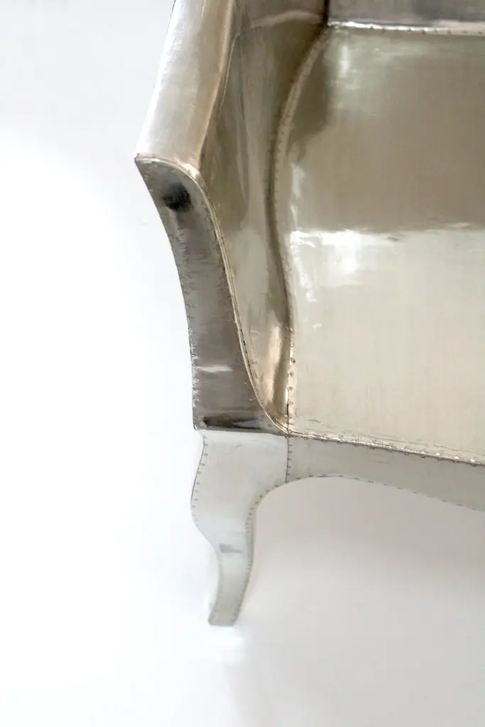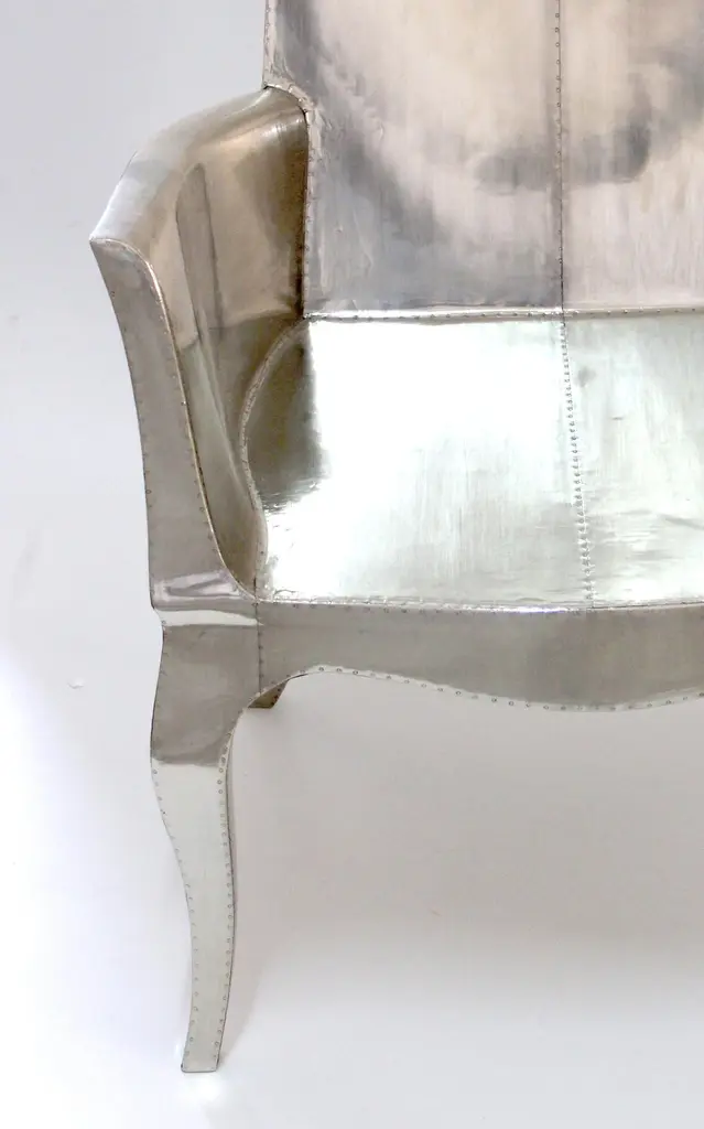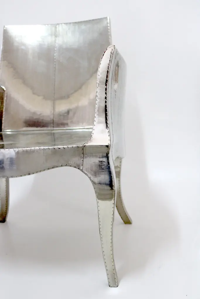Introducing the Art Deco Chairs, a stunning Art Deco Chairs set designed by the renowned Paul Mathieu for Stephanie Odegard. This elegant Art Deco Chair duo boasts a unique curved profile that exudes a sophisticated and timeless charm, making it the perfect addition to any modern or classic interior.Crafted with utmost care and attention to detail, these Art Deco Chairs are made to order and are available in twelve metal clad finishes, ensuring that you can choose the perfect one to match your individual style and taste. The use of high-quality materials and expert craftsmanship ensure that each Art Deco Chair is not only beautiful but also a true piece of art.The curved legs and side arms of this Art Deco Chair are hand carved from solid pieces of teak. Pattern makers trace and cut complex forms that will cover the chair in a skin of copper, white bronze, brass or antiqued white bronze The metal finishes will tarnish over time. Regular non-abrasive household metal polishes can be used to restore the original luster.Overall, if you're looking for a piece of furniture that combines luxury, comfort, and style, then the Art Deco Chairs is an excellent choice. With its distinctive curved profile and multiple finish options, this Chair set is sure to elevate the look of any room it is placed in, and be a beloved addition to your home for years to come.The images shown in this listing are shot in different lighting conditions and/or are 3D illustrations. We encourage our customers to please request a sample or a full sample set of 12 finishes so that they can experience the finish first hand. Art Deco Club Chairs Designed by Paul Mathieu for Stephanie OdegardSize- 26"x 27"x 33"HMaterials - White Bronze Metal sheet, Teak, Wood, MetalTechniques: Hand-Crafted, Hand-Carved, Metal Work, Wood Work, Metal Wrapping, PolishedPlease note that moisture in air, sudden change in temperature and natural movement of wood over time causes the metal to wrinkle or bubble up. We use well seasoned, reclaimed teak and high quality marine grade MDF (wherever technically possible) to avoid and delay the mentioned changes. However a perfect stability of metal cannot be guaranteed. Please note that our smooth finish metal clad pieces will have some unavoidable tool marks. This is proof that everything is done by hand. The smooth finish will not come out like a machine made perfect surface and the master artisan will do their best to make it look as good/clean/stable/perfect as he possibly can.The antique white bronze finish is hand done by using an acidic chemical over the white bronze finish to recreate a natural patination. Like with the natural patination of silver, copper, or brass, the final result and color uniformity of the patina cannot be guaranteed. The goal of this finish is to achieve rainbow-like shades with dull, shiny, cloudy, and streaky patches to give an illusion of antiquing. Please note:None of our metal clad pieces are treated with a protective “finish” thus enabling the items to age naturally over time. We will of course polish them well before we pack them. a) Copper oxidizes faster than the other metals. In six to twelve months it will most likely lose its shine and will gradually turn to different shades of brown and/or green/blue. This aging process and its effect is referred to as verdigris. After a year the piece should not change much more. Copper does not rust, but does require periodic cleaning in order to retain its original shine if that the preferred option. ('BRASSO' or any known copper polish can be used to polish copper).b) Brass retains its shine for far longer than others, but will tarnish if not cleaned on occasion. ('BRASSO' is made to polish brass).c) White bronze, has the least tendency to show age or tarnish. If kept in a controlled climate, this metal will hold its shine for years. It can be cleaned with a cleanser and polished with a cloth. d) The antiqued white bronze finish will react with the natural elements the fastest in the beginning but it too will stop reacting and will settle down in a stable state like copper after 6-12 months. Since it is already antiqued and looked like it is tarnished, as described in an earlier message, this fast reaction will not change the over all look. In that way this surface is most forgiving. The images shown in this listing are shot in different lighting conditions and/or are 3D illustrations. We encourage our customers to please request a sample or a full sample set of 12 finishes so that they can experience the finish first hand.