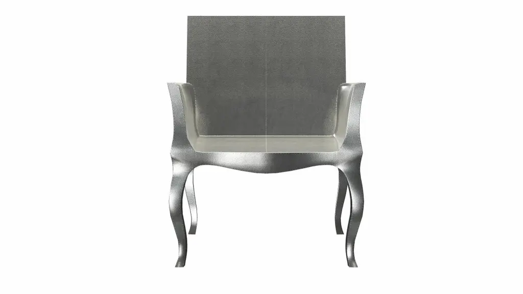 The renowned designer Paul Mathieu chose the name “Louise” when he created his more feminine version of Louis XV (1730-1760) furniture.The characteristic cabriole leg, curving outward at the knee and inward towards the foot in an "S" shape was born during this period. It is during the same era that English furniture makers produced the Queen Anne and Chippendale styles.Introducing the Art Deco Chairs, a stunning Art Deco Chairs set designed by the renowned Paul Mathieu for Stephanie Odegard. This elegant Art Deco Chair duo boasts a unique curved profile that exudes a sophisticated and timeless charm, making it the perfect addition to any modern or classic interior.Crafted with utmost care and attention to detail, these Art Deco Chairs are made to order and are available in twelve metal clad finishes, ensuring that you can choose the perfect one to match your individual style and taste. The use of high-quality materials and expert craftsmanship ensure that each Art Deco Chair is not only beautiful but also a true piece of art.The curved legs and side arms of this Art Deco Chair are hand carved from solid pieces of teak. Pattern makers trace and cut complex forms that will cover the chair in a skin of copper, white bronze, brass or antiqued white bronze. The metal finishes will tarnish over time. Regular non-abrasive household metal polishes can be used to restore the original luster.Overall, if you're looking for a piece of furniture that combines luxury, comfort, and style, then the Art Deco Chairs is an excellent choice. With its distinctive curved profile and multiple finish options, this Chair set is sure to elevate the look of any room it is placed in, and be a beloved addition to your home for years to come.The images shown in this listing are shot in different lighting conditions and/or are 3D illustrations. We encourage our customers to please request a sample or a full sample set of 12 finishes so that they can experience the finish first hand. Art Deco Club Chairs Designed by Paul Mathieu for Stephanie OdegardSize- 26"x 27"x 33"HMaterials - White Bronze Metal sheet, Teak, Wood, MetalTechniques: Hand-Crafted, Hand-Carved, Metal Work, Wood Work, Metal Wrapping, PolishedPlease note that moisture in air, sudden change in temperature and natural movement of wood over time causes the metal to wrinkle or bubble up. We use well seasoned, reclaimed teak and high quality marine grade MDF (wherever technically possible) to avoid and delay the mentioned changes. However a perfect stability of metal cannot be guaranteed. Please note that our smooth finish metal clad pieces will have some unavoidable tool marks. This is proof that everything is done by hand. The smooth finish will not come out like a machine made perfect surface and the master artisan will do their best to make it look as good/clean/stable/perfect as he possibly can.Our hammered finishes are a much safer option if the tool mark scratches are unacceptable. The hammered finishes are also safer against eventual bubbling/wrinkles due to natural forces as mentioned above.The antique white bronze finish is hand done by using an acidic chemical over the white bronze finish to recreate a natural patination. Like with the natural patination of silver, copper, or brass, the final result and color uniformity of the patina cannot be guaranteed. The goal of this finish is to achieve rainbow-like shades with dull, shiny, cloudy, and streaky patches to give an illusion of antiquing. Please note:None of our metal clad pieces are treated with a protective “finish” thus enabling the items to age naturally over time. We will of course polish them well before we pack them. a) Copper oxidizes faster than the other metals. In six to twelve months it will most likely lose its shine and will gradually turn to different shades of brown and/or green/blue. This aging process and its effect is referred to as verdigris. After a year the piece should not change much more. Copper does not rust, but does require periodic cleaning in order to retain its original shine if that the preferred option. ('BRASSO' or any known copper polish can be used to polish copper).b) Brass retains its shine for far longer than others, but will tarnish if not cleaned on occasion. ('BRASSO' is made to polish brass).c) White bronze, has the least tendency to show age or tarnish. If kept in a controlled climate, this metal will hold its shine for years. It can be cleaned with a cleanser and polished with a cloth. d) The antiqued white bronze finish will react with the natural elements the fastest in the beginning but it too will stop reacting and will settle down in a stable state like copper after 6-12 months. Since it is already antiqued and looked like it is tarnished, as described in an earlier message, this fast reaction will not change the over all look. In that way this surface is most forgiving. The images shown in this listing are shot in different lighting conditions and/or are 3D illustrations. We encourage our customers to please request a sample or a full sample set of 12 finishes so that they can experience the finish first hand.
