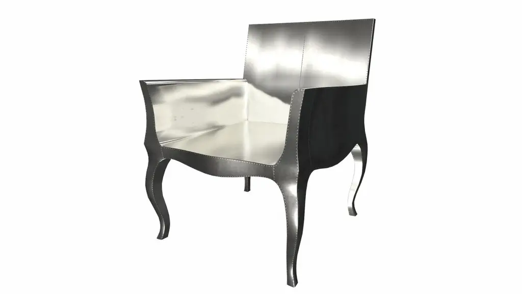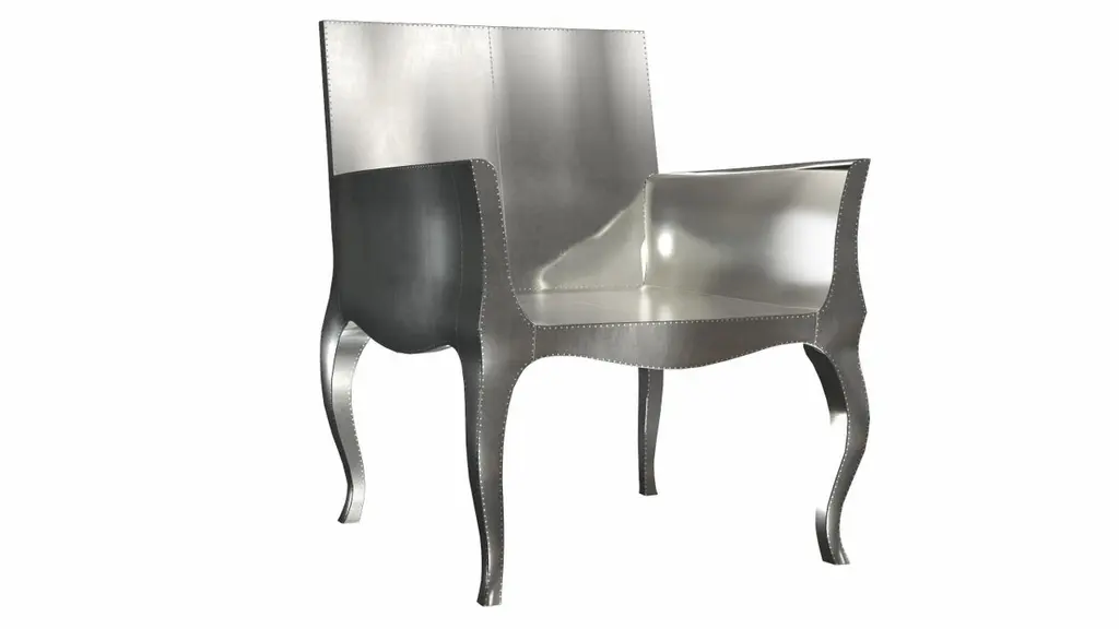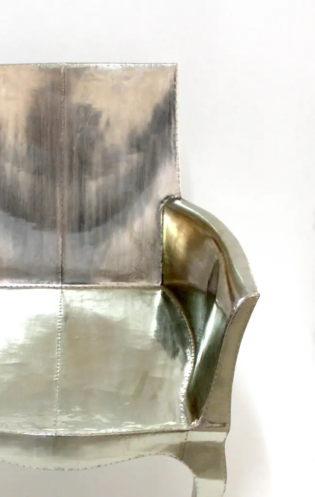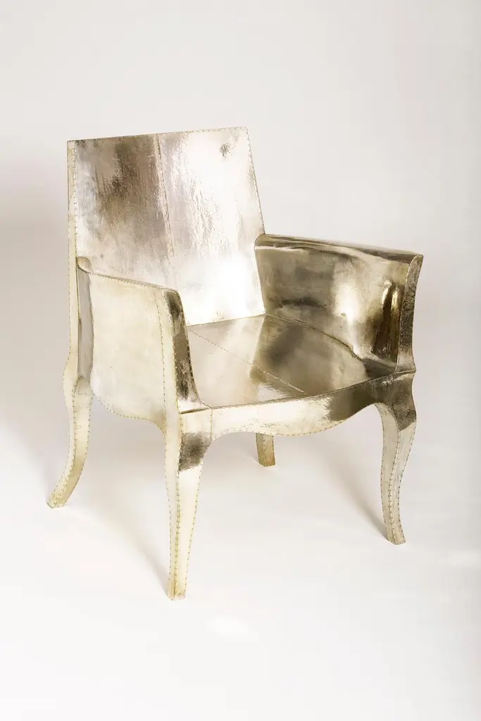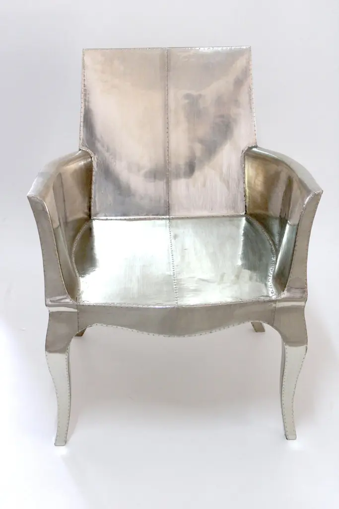 Introducing the Art Deco Chairs, a stunning Art Deco Chairs set designed by the renowned Paul Mathieu for Stephanie Odegard. This elegant Art Deco Chair duo boasts a unique curved profile that exudes a sophisticated and timeless charm, making it the perfect addition to any modern or classic interior.Crafted with utmost care and attention to detail, these Art Deco Chairs are made to order and are available in twelve metal clad finishes, ensuring that you can choose the perfect one to match your individual style and taste. The use of high-quality materials and expert craftsmanship ensure that each Art Deco Chair is not only beautiful but also a true piece of art.The curved legs and side arms of this Art Deco Chair are hand carved from solid pieces of teak. Pattern makers trace and cut complex forms that will cover the chair in a skin of copper, white bronze, brass or antiqued white bronze The metal finishes will tarnish over time. Regular non-abrasive household metal polishes can be used to restore the original luster.Overall, if you're looking for a piece of furniture that combines luxury, comfort, and style, then the Art Deco Chairs is an excellent choice. With its distinctive curved profile and multiple finish options, this Chair set is sure to elevate the look of any room it is placed in, and be a beloved addition to your home for years to come.The images shown in this listing are shot in different lighting conditions and/or are 3D illustrations. We encourage our customers to please request a sample or a full sample set of 12 finishes so that they can experience the finish first hand. Art Deco Style Chairs Designed by Paul Mathieu for Stephanie OdegardSize- 26"x 27"x 33"HMaterials - White Bronze Metal sheet, Teak, Wood, MetalTechniques: Hand-Crafted, Hand-Carved, Metal Work, Wood Work, Metal Wrapping, PolishedPlease note that moisture in air, sudden change in temperature and natural movement of wood over time causes the metal to wrinkle or bubble up. We use well seasoned, reclaimed teak and high quality marine grade MDF (wherever technically possible) to avoid and delay the mentioned changes. However a perfect stability of metal cannot be guaranteed. Please note that our smooth finish metal clad pieces will have some unavoidable tool marks. This is proof that everything is done by hand. The smooth finish will not come out like a machine made perfect surface and the master artisan will do their best to make it look as good/clean/stable/perfect as he possibly can.The antique white bronze finish is hand done by using an acidic chemical over the white bronze finish to recreate a natural patination. Like with the natural patination of silver, copper, or brass, the final result and color uniformity of the patina cannot be guaranteed. The goal of this finish is to achieve rainbow-like shades with dull, shiny, cloudy, and streaky patches to give an illusion of antiquing. Please note:None of our metal clad pieces are treated with a protective “finish” thus enabling the items to age naturally over time. We will of course polish them well before we pack them. a) Copper oxidizes faster than the other metals. In six to twelve months it will most likely lose its shine and will gradually turn to different shades of brown and/or green/blue. This aging process and its effect is referred to as verdigris. After a year the piece should not change much more. Copper does not rust, but does require periodic cleaning in order to retain its original shine if that the preferred option. ('BRASSO' or any known copper polish can be used to polish copper).b) Brass retains its shine for far longer than others, but will tarnish if not cleaned on occasion. ('BRASSO' is made to polish brass).c) White bronze, has the least tendency to show age or tarnish. If kept in a controlled climate, this metal will hold its shine for years. It can be cleaned with a cleanser and polished with a cloth. d) The antiqued white bronze finish will react with the natural elements the fastest in the beginning but it too will stop reacting and will settle down in a stable state like copper after 6-12 months. Since it is already antiqued and looked like it is tarnished, as described in an earlier message, this fast reaction will not change the over all look. In that way this surface is most forgiving. The images shown in this listing are shot in different lighting conditions and/or are 3D illustrations. We encourage our customers to please request a sample or a full sample set of 12 finishes so that they can experience the finish first hand.
