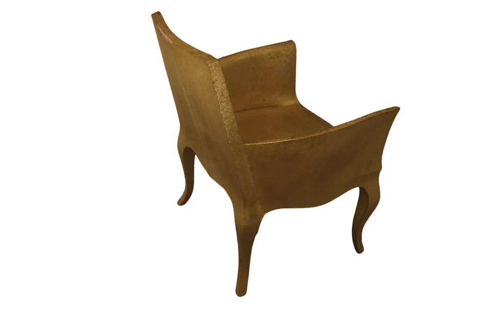 Introducing the Art Deco Chairs, a stunning Art Deco Chairs set designed by the renowned Paul Mathieu for Stephanie Odegard. This elegant Art Deco Chair duo boasts a unique curved profile that exudes a sophisticated and timeless charm, making it the perfect addition to any modern or classic interior.Crafted with utmost care and attention to detail, these Art Deco Chairs are made to order and are available in twelve metal clad finishes, ensuring that you can choose the perfect one to match your individual style and taste. The use of high-quality materials and expert craftsmanship ensure that each Art Deco Chair is not only beautiful but also a true piece of art.The curved legs and side arms of this Art Deco Chair are hand carved from solid pieces of teak. Pattern makers trace and cut complex forms that will cover the chair in a skin of copper, white bronze, brass or antiqued white bronze The metal finishes will tarnish over time. Regular non-abrasive household metal polishes can be used to restore the original luster.Overall, if you're looking for a piece of furniture that combines luxury, comfort, and style, then the Art Deco Chairs is an excellent choice. With its distinctive curved profile and multiple finish options, this Chair set is sure to elevate the look of any room it is placed in, and be a beloved addition to your home for years to come.The images shown in this listing are shot in different lighting conditions and/or are 3D illustrations. We encourage our customers to please request a sample or a full sample set of 12 finishes so that they can experience the finish first hand. Art Deco Style Chairs Mid Hammered in Brass by Paul MathieuSize- 26"x 27"x 33"HMaterials - Brass, Metal sheet, Teak, Wood, MetalTechniques: Hand-Crafted, Hand-Carved, Metal Work, Wood Work, Metal Wrapping, PolishedPlease note that moisture in air, sudden change in temperature and natural movement of wood over time causes the metal to wrinkle or bubble up. We use well seasoned, reclaimed teak and high quality marine grade MDF (wherever technically possible) to avoid and delay the mentioned changes. However a perfect stability of metal cannot be guaranteed. Please note that our smooth finish metal clad pieces will have some unavoidable tool marks. This is proof that everything is done by hand. The smooth finish will not come out like a machine made perfect surface and the master artisan will do their best to make it look as good/clean/stable/perfect as he possibly can.The antique white bronze finish is hand done by using an acidic chemical over the white bronze finish to recreate a natural patination. Like with the natural patination of silver, copper, or brass, the final result and color uniformity of the patina cannot be guaranteed. The goal of this finish is to achieve rainbow-like shades with dull, shiny, cloudy, and streaky patches to give an illusion of antiquing. Please note:None of our metal clad pieces are treated with a protective “finish” thus enabling the items to age naturally over time. We will of course polish them well before we pack them. a) Copper oxidizes faster than the other metals. In six to twelve months it will most likely lose its shine and will gradually turn to different shades of brown and/or green/blue. This aging process and its effect is referred to as verdigris. After a year the piece should not change much more. Copper does not rust, but does require periodic cleaning in order to retain its original shine if that the preferred option. ('BRASSO' or any known copper polish can be used to polish copper).b) Brass retains its shine for far longer than others, but will tarnish if not cleaned on occasion. ('BRASSO' is made to polish brass).c) White bronze, has the least tendency to show age or tarnish. If kept in a controlled climate, this metal will hold its shine for years. It can be cleaned with a cleanser and polished with a cloth. d) The antiqued white bronze finish will react with the natural elements the fastest in the beginning but it too will stop reacting and will settle down in a stable state like copper after 6-12 months. Since it is already antiqued and looked like it is tarnished, as described in an earlier message, this fast reaction will not change the over all look. In that way this surface is most forgiving. The images shown in this listing are shot in different lighting conditions and/or are 3D illustrations. We encourage our customers to please request a sample or a full sample set of 12 finishes so that they can experience the finish first hand.
