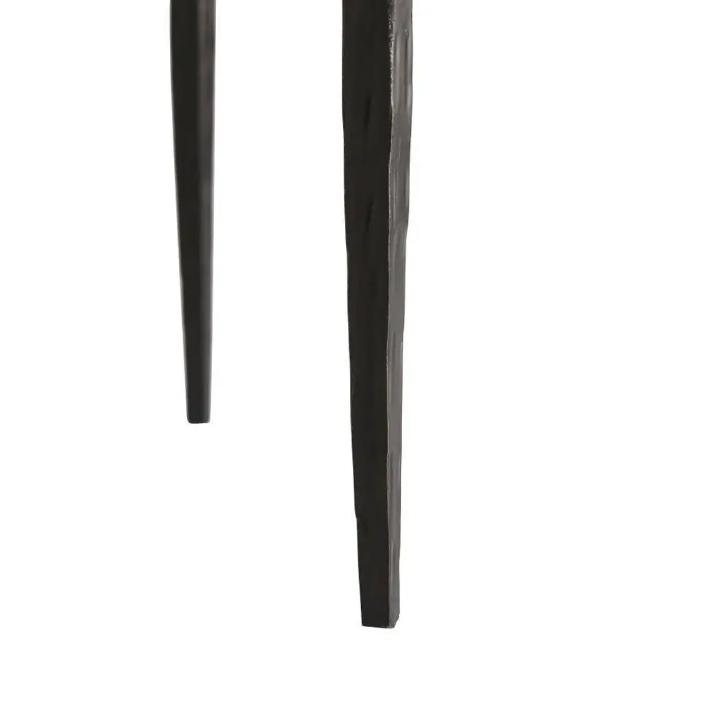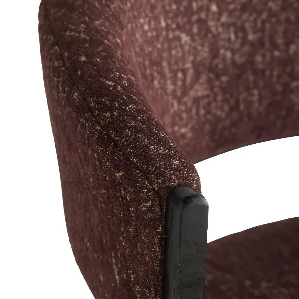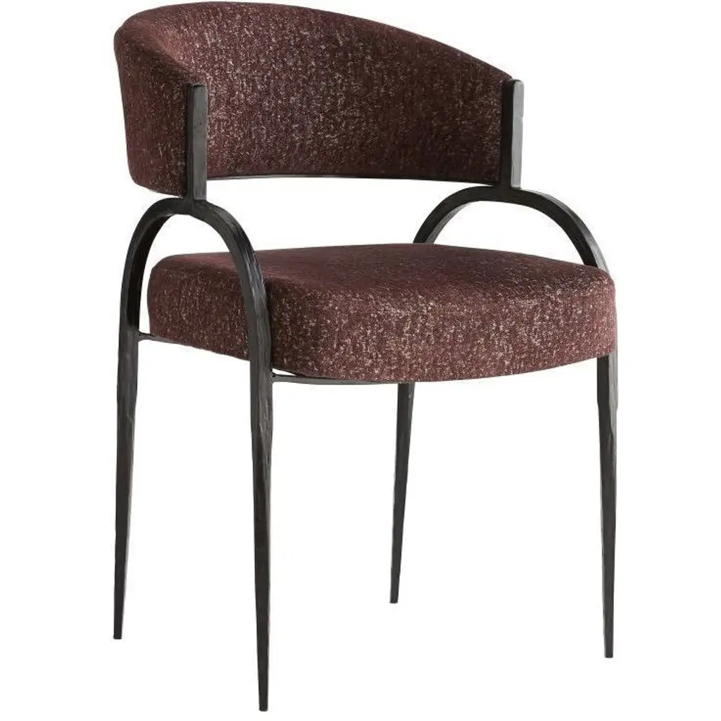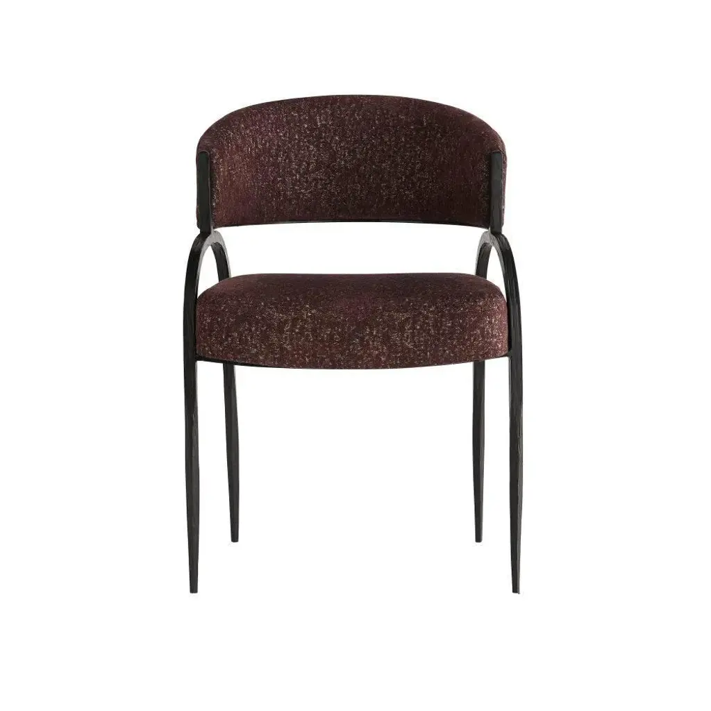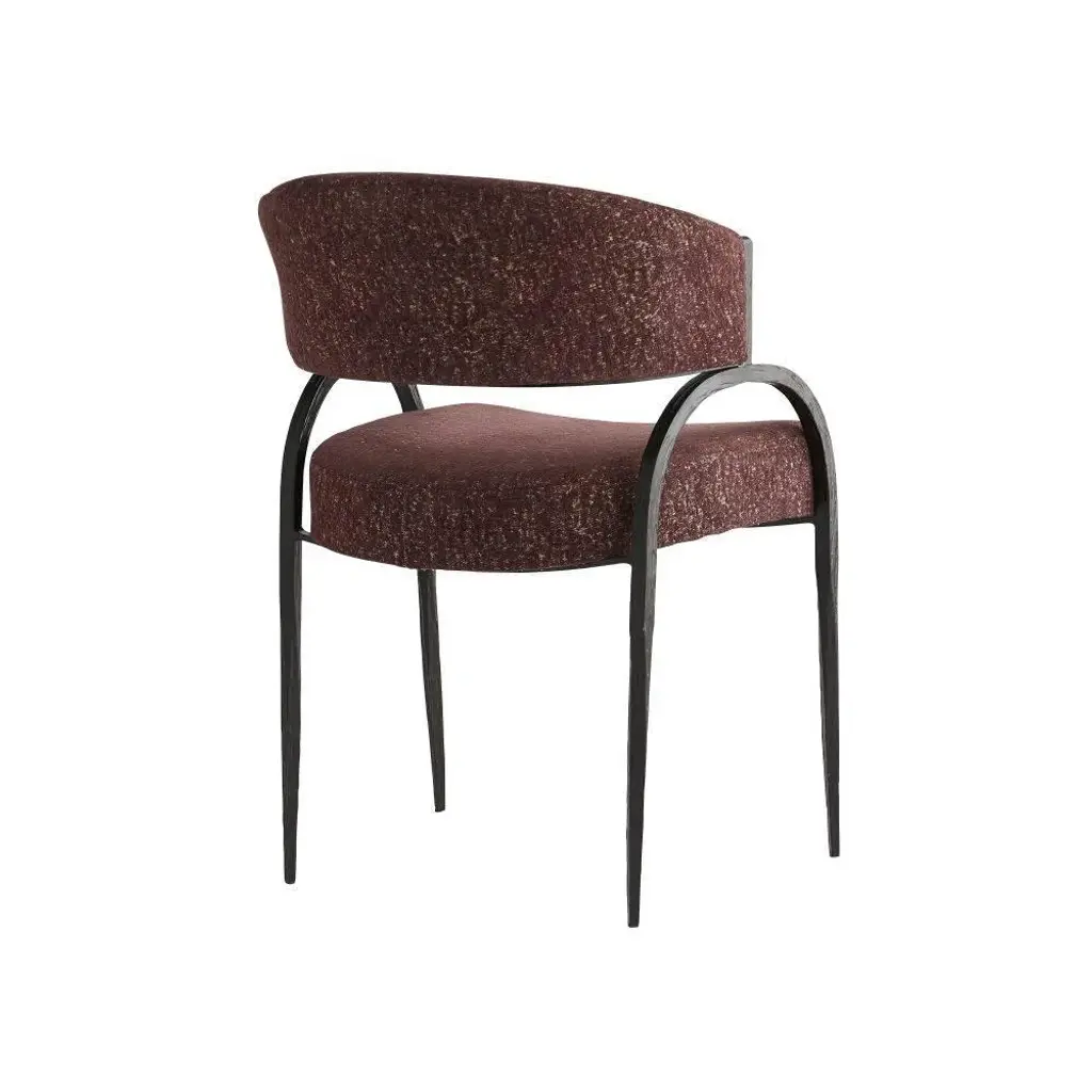 A curved back and large seat rest on a perfectly poised iron frame to compose the foundation of the Bahati. Natural iron has been hand-forged yielding delicate details along its thin frame. The seat and back cushion are covered in a bordeaux chenille fabric subtly showcasing the contrast of highs and lows evident in its rich hue. For a matte finish on the legs, lightly brush the iron with a scotchbrite pad to take down the sheen.