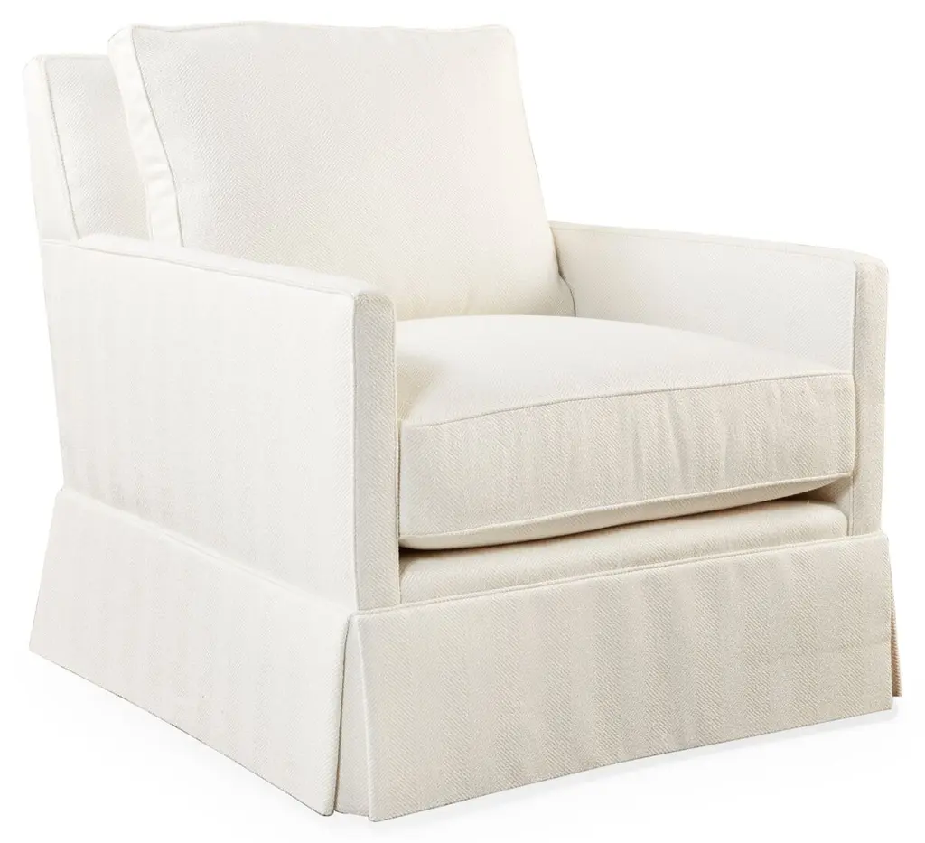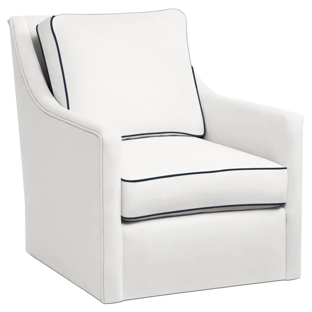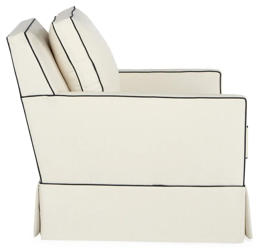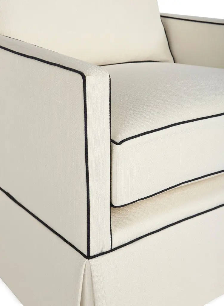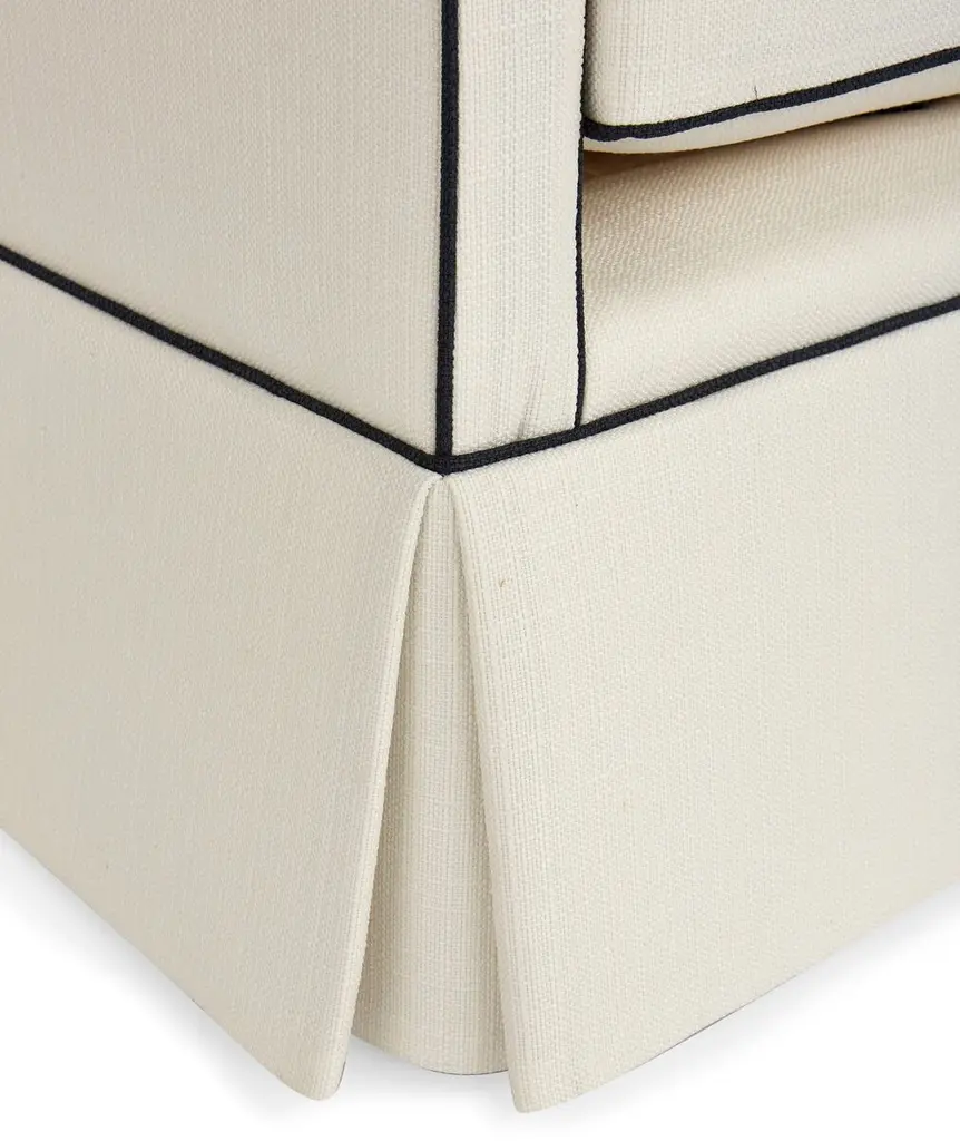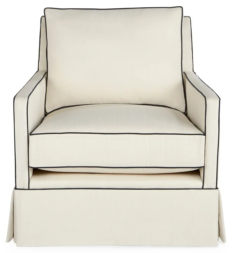 Exclusive to One Kings Lane: Traced with a navy welt against crisp white upholstery, this skirted club chair delivers vivid contrast to any room in the house. A kiln-dried hardwood frame and high-density foam-and-fiber ensure long-lasting comfort and support. And because it's upholstered in Crypton--an eco-friendly high-performance fabric--it repels stains, spills, bacteria, and mold. Handcrafted in the USA.