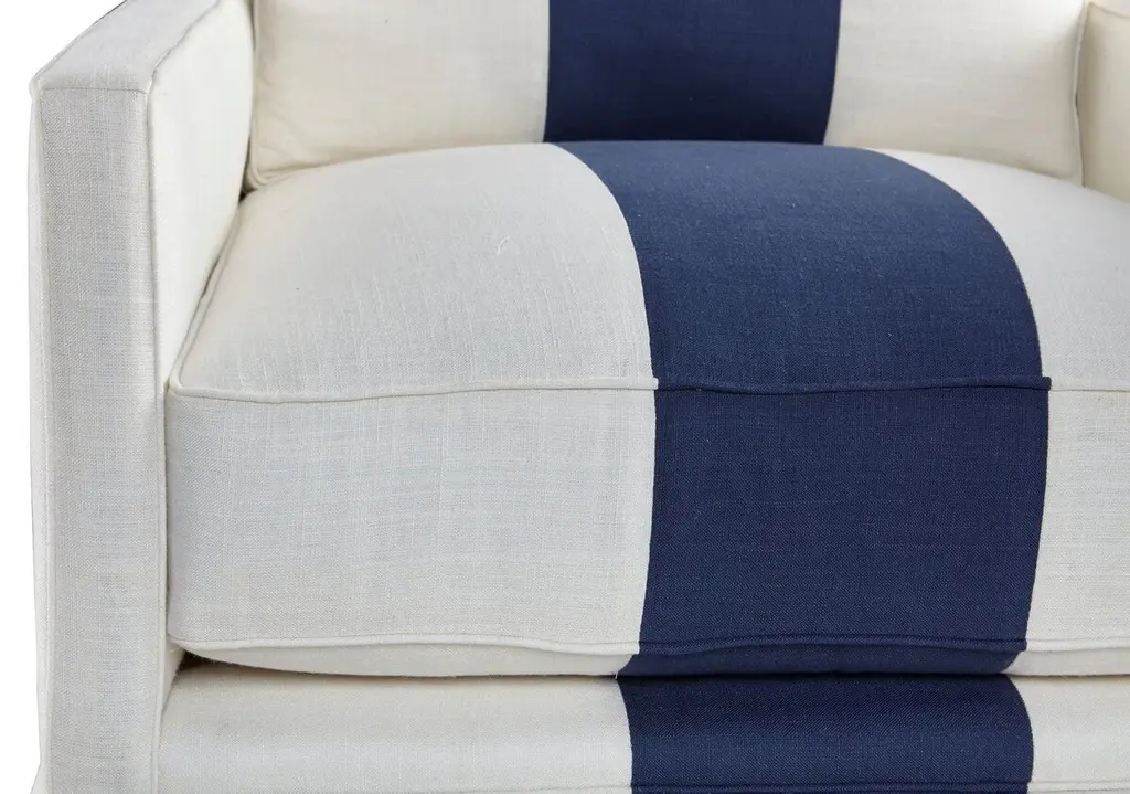 Elegant with a bold stripe and a pleated wrap-around skirt, this linen-blend club chair brings a clean, tailored feel to the room. A kiln-dried hardwood frame, eight-way hand-tied suspension system and foam enveloped in feather and down-proof ticking outfit the piece with lasting comfort and support. Handmade in the USA.